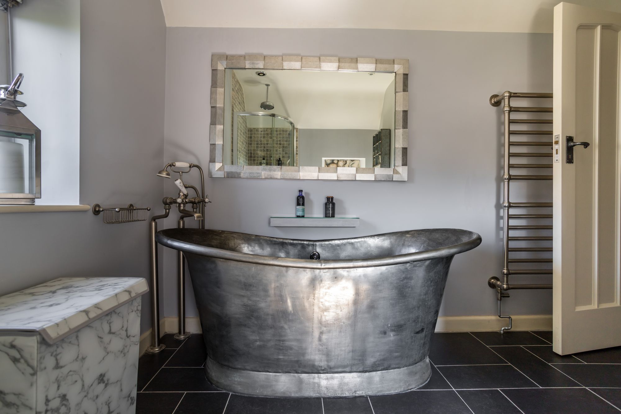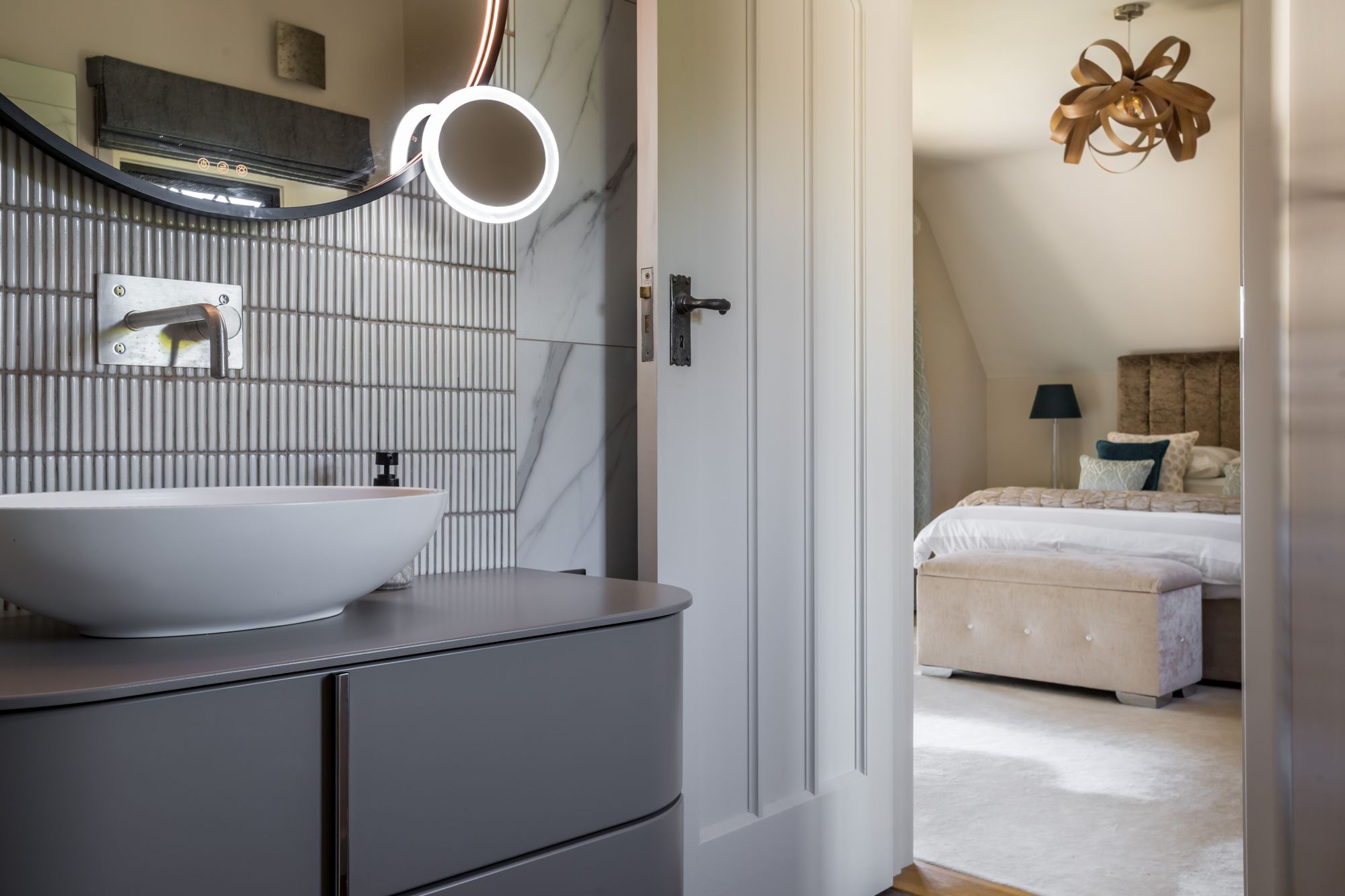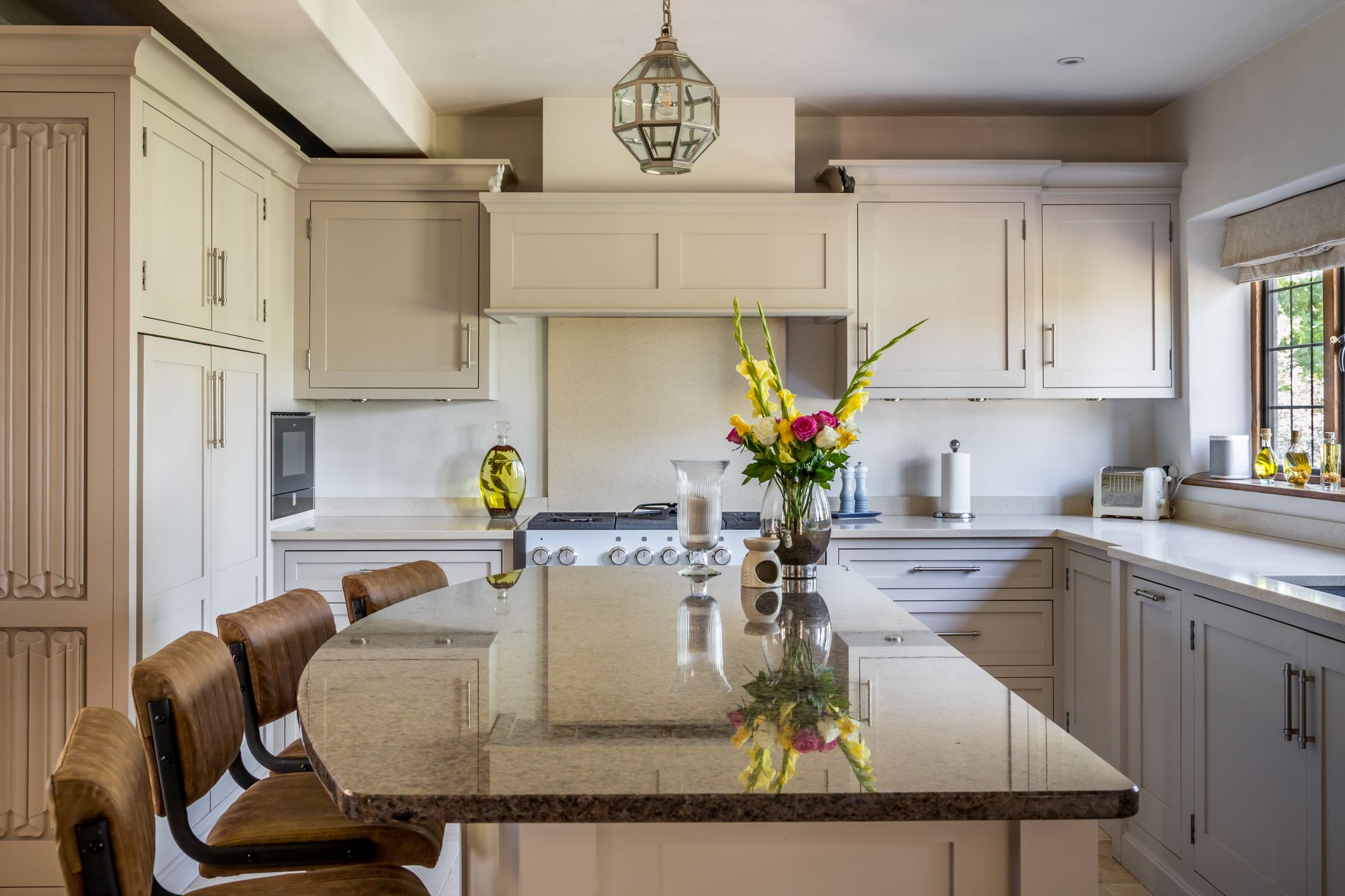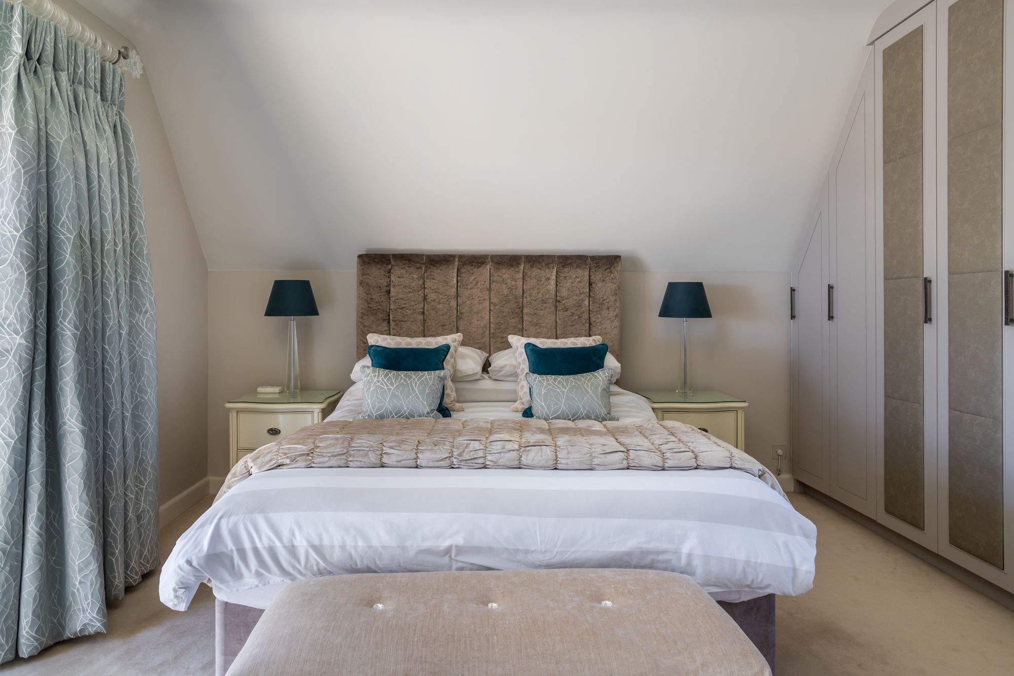 The interiors extend to over 3,400 sq. ft. and have been finished to an exacting standard, with bespoke craftsmanship and high-quality materials throughout. A striking entrance hall sets the tone, leading to an elegant sitting room with wood-burning stove, a dual-aspect study/home office with bespoke cabinetry and direct garden access, and a formal dining room. The heart of the home is the beautifully designed, handmade oak kitchen/breakfast room with quartz worktops, a large central island, and premium appliances, complemented by a utility room and boot room. Further ground floor accommodation includes, a shower room, and cloakrooms.