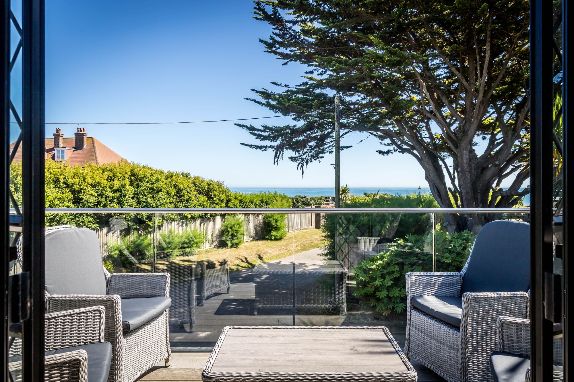 Upstairs, several rooms enjoy sea views, with the principal suite offering a private balcony, bespoke Neville Johnson wardrobes, and a luxurious en suite with walk-in shower and freestanding bath. Two further bedrooms and additional bathrooms complete the well-planned layout, making the house ideally suited to both family life and multi-generational living. There is versatile space over the double-garage which could be used as an internal annexe, fourth bedroom or living room that benefits from a large balcony looking towards the sea.