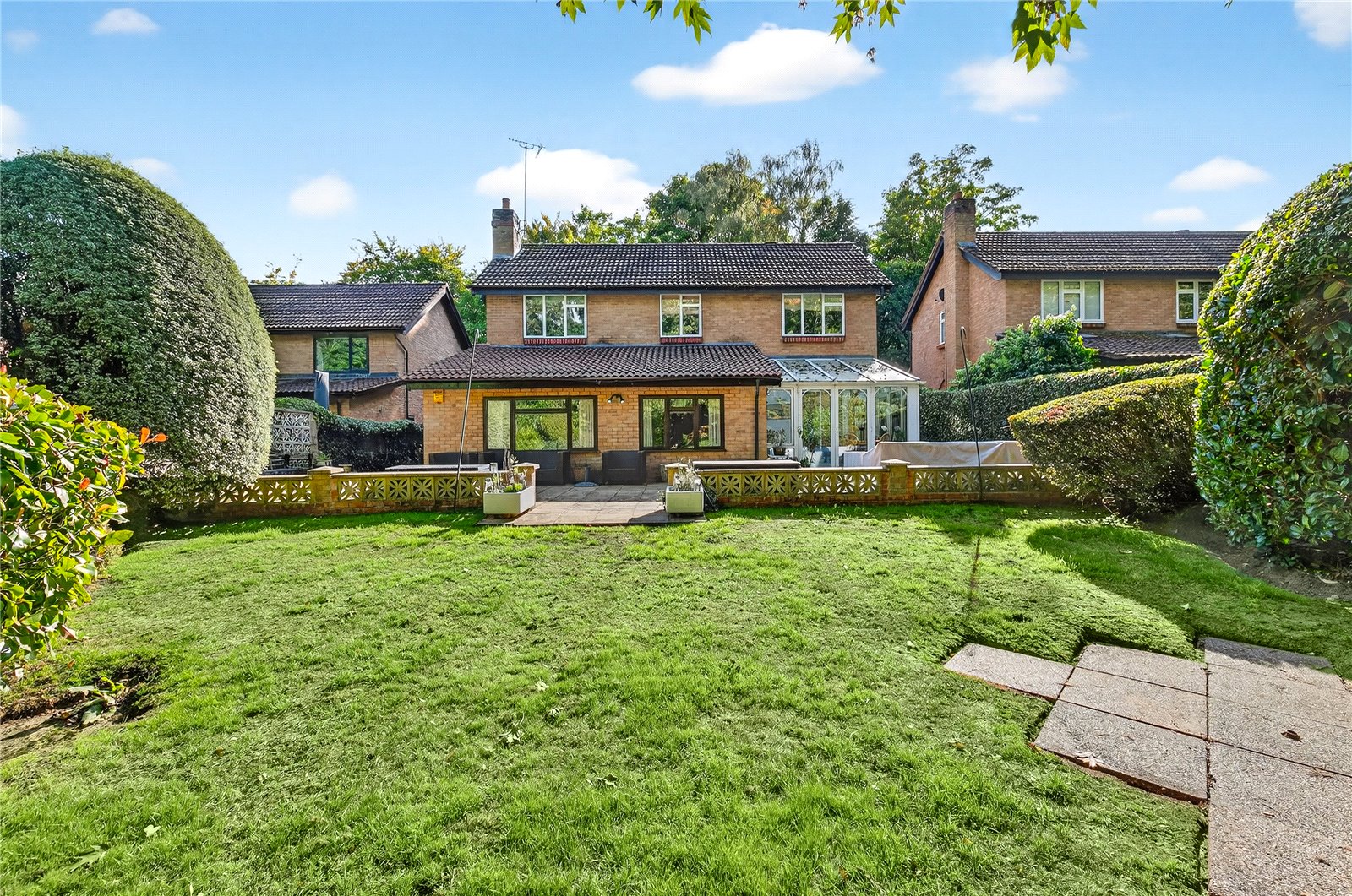 Externally, the property enjoys a generous driveway providing parking for multiple vehicles, and a beautifully maintained rear garden – private and enclosed, with mature sculpted hedging, large lawned area, and a sizeable patio adjoining the rear of the house, perfect for outdoor entertaining.