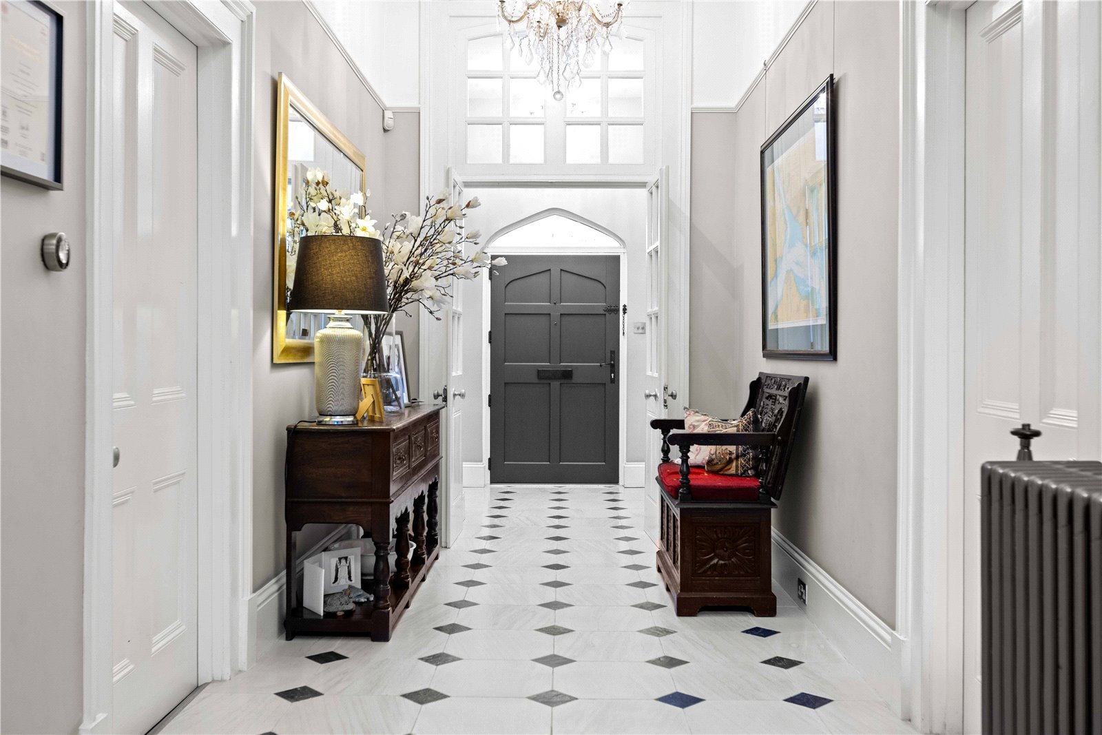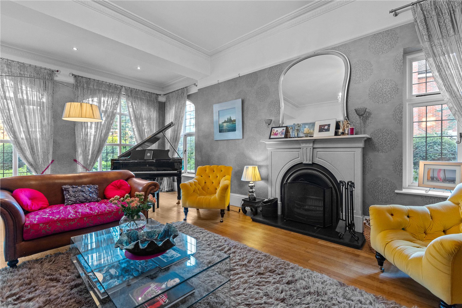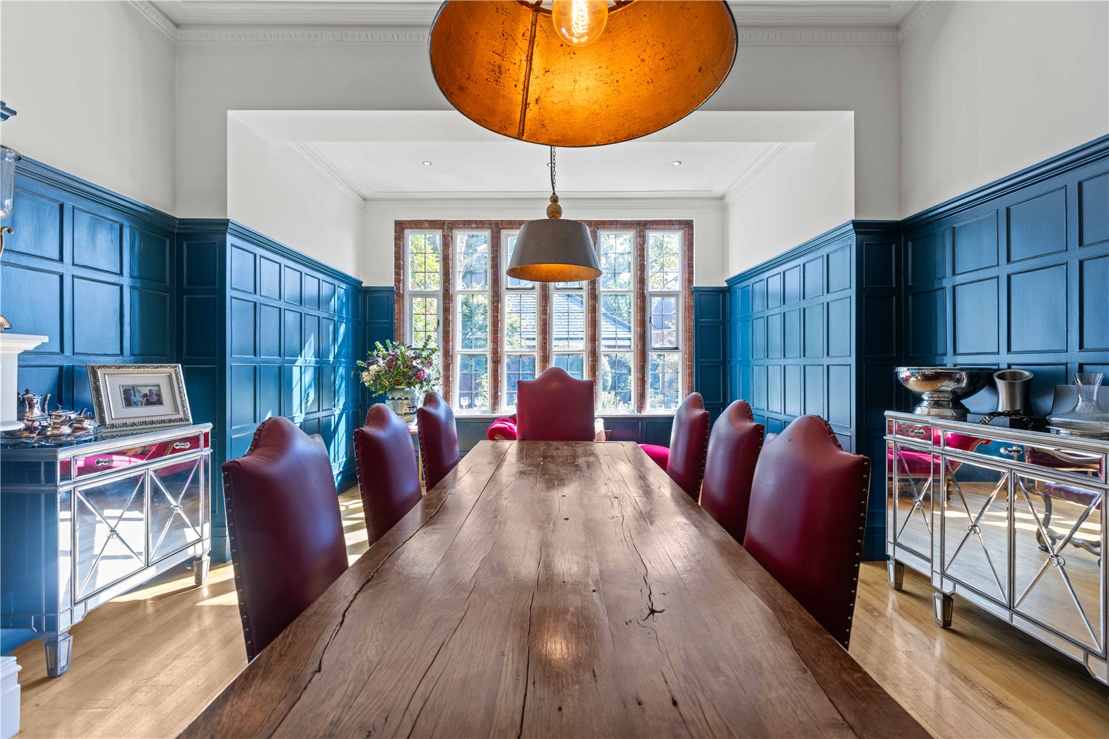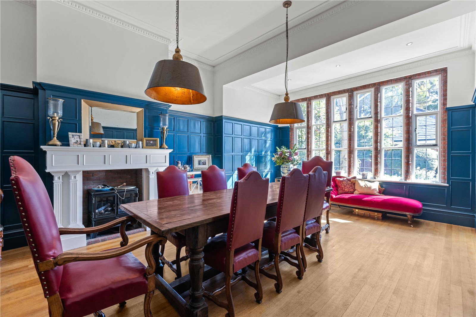 The ground floor unfolds through a series of refined reception spaces, including a distinguished drawing room centred upon a magnificent fireplace and bathed in natural light, and a formal dining room, perfectly proportioned for both intimate dinners and grand family gatherings.