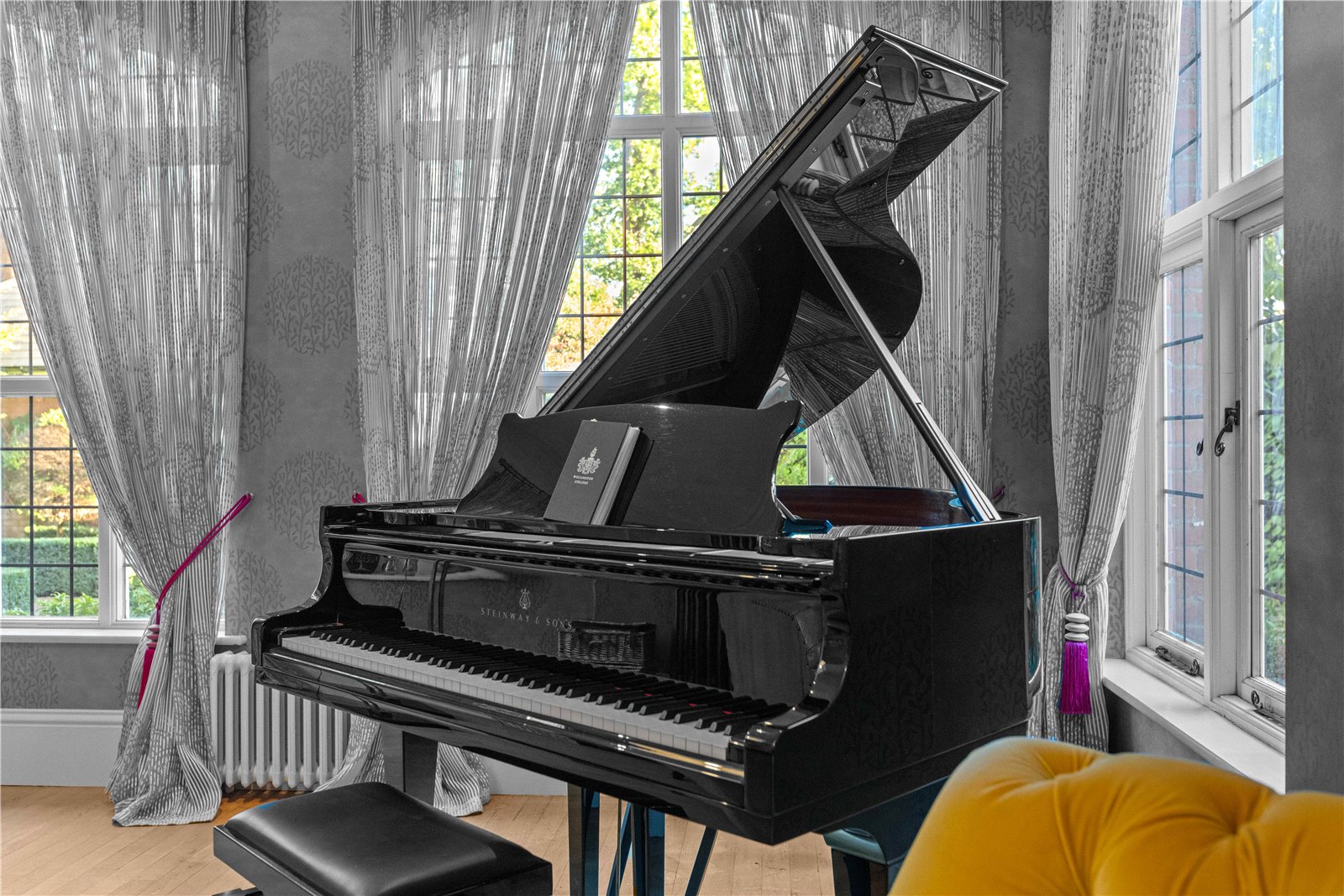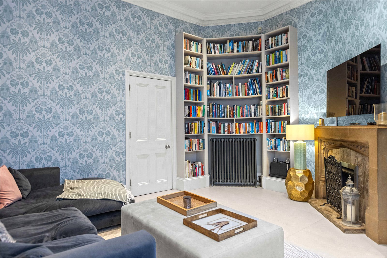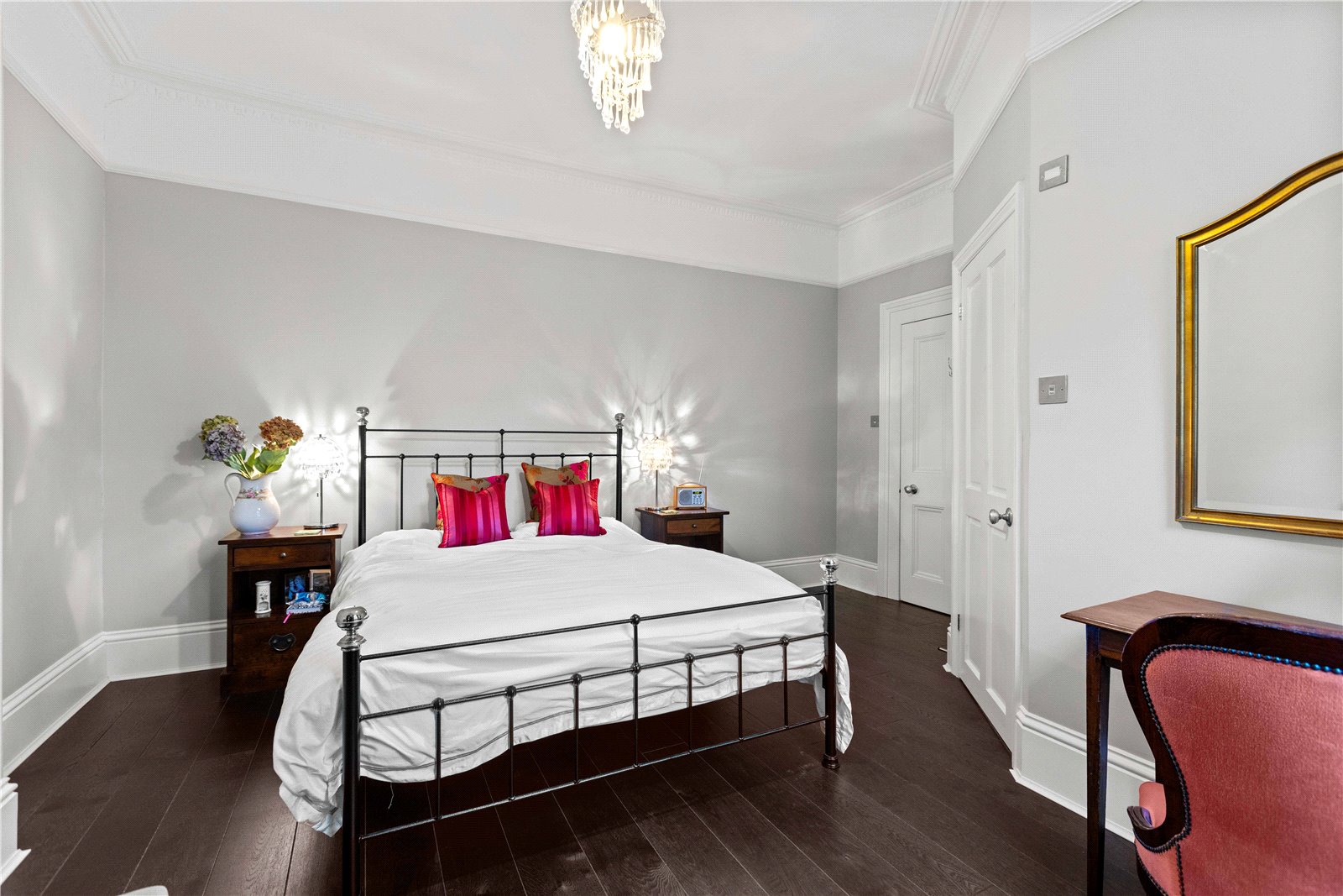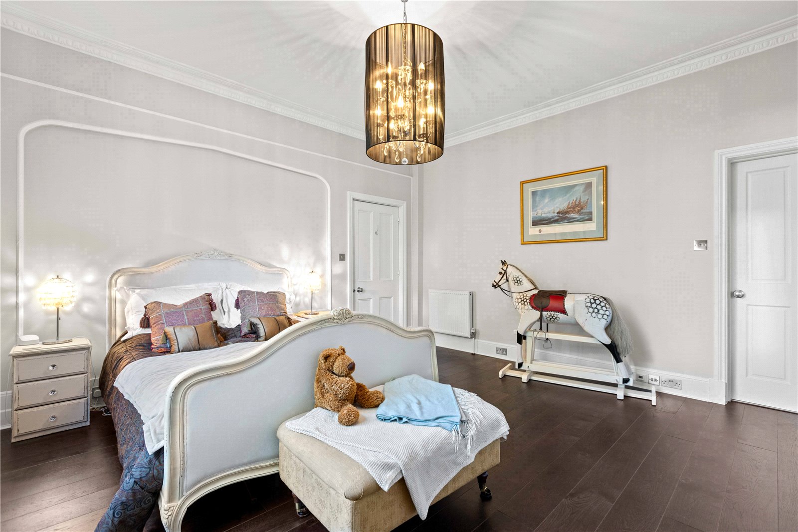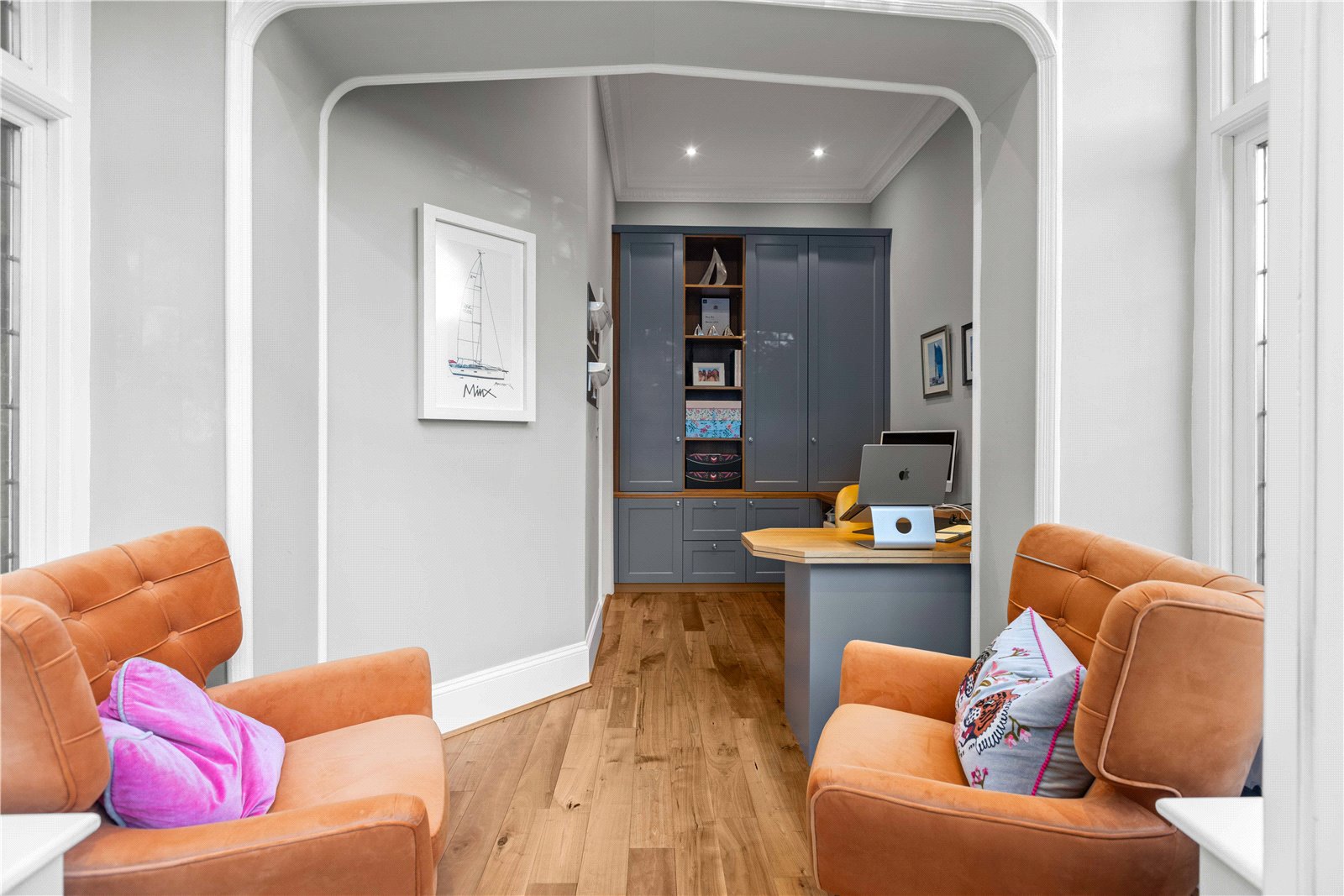 The ground floor unfolds through a series of refined reception spaces, including a distinguished drawing room centred upon a magnificent fireplace and bathed in natural light, and a formal dining room, perfectly proportioned for both intimate dinners and grand family gatherings.