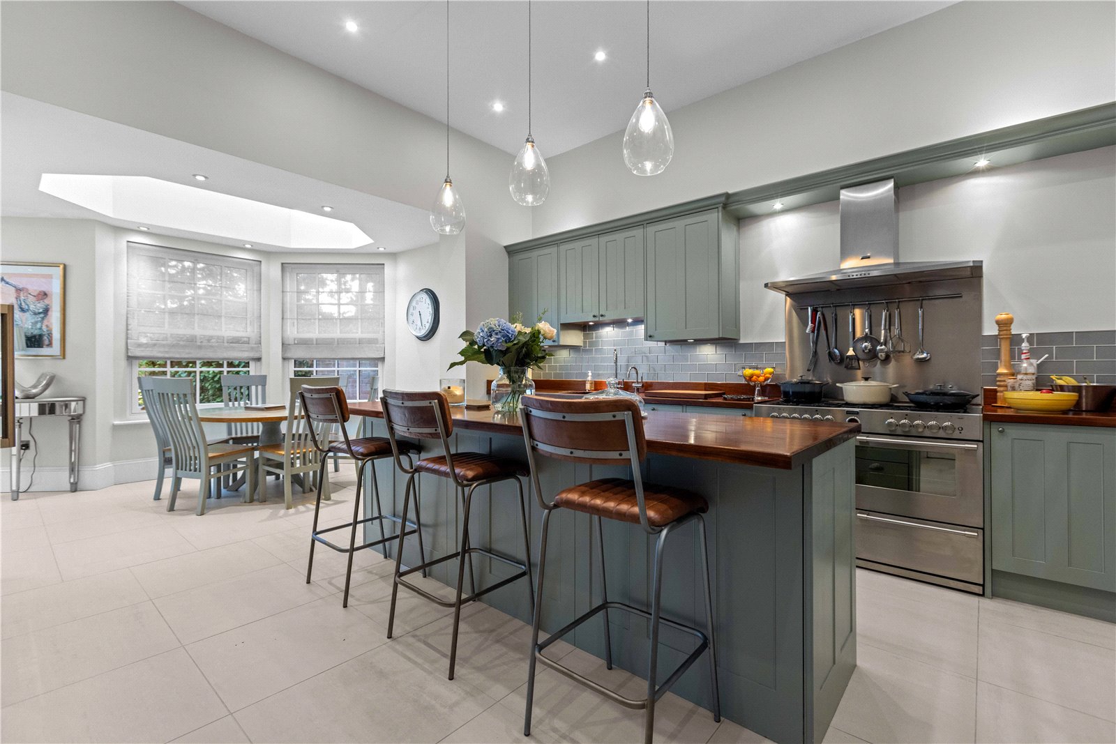 At the heart of the home lies a spectacular, hand-crafted kitchen and breakfast room, thoughtfully designed and appointed with a suite of high-quality appliances. This impressive space flows effortlessly into the family room and library, crowned with lantern skylights and opening directly onto the sun-drenched rear terrace — a truly inspiring setting for both relaxed living and elegant entertaining. Complementing the principal spaces are a private study, a guest cloakroom, and a staircase from the welcoming entrance hall that descends to the cellar.