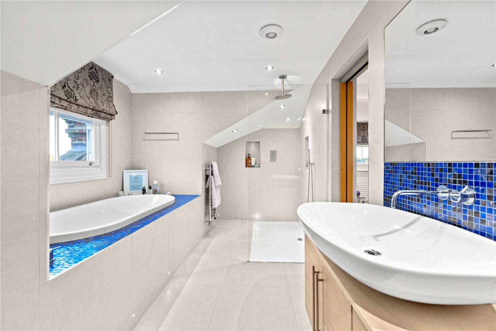 The first floor offers four beautifully appointed bedrooms, three benefitting from luxurious en suite shower rooms, alongside a stylish family bathroom. The upper floor is dedicated to a sumptuous principal suite, comprising a spacious bedroom, a private dressing room, and a luxurious en suite bathroom — creating a tranquil sanctuary of comfort and refinement.