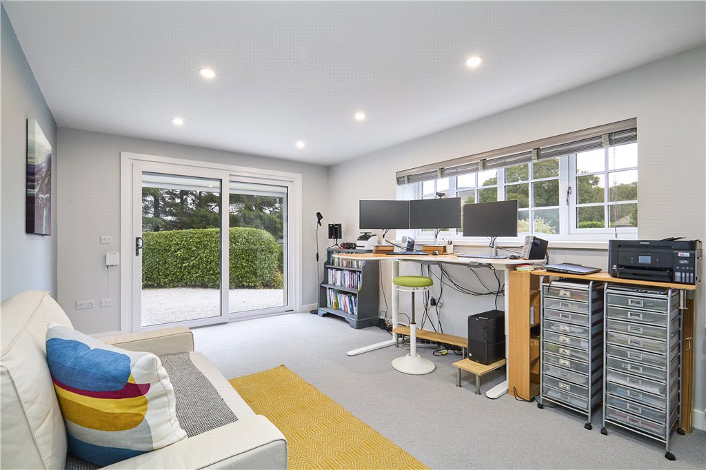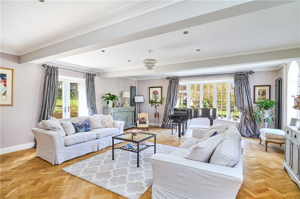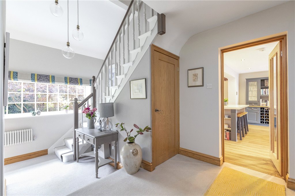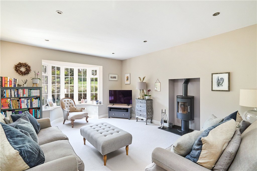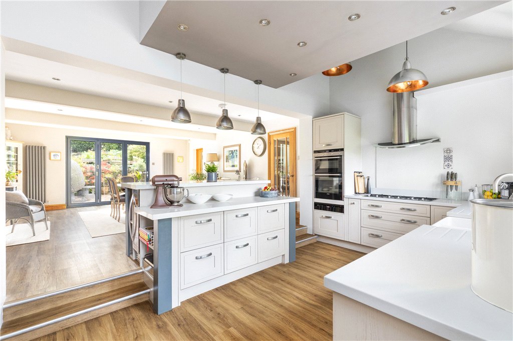 Welcoming Reception Hall with cloakroom off and galleried landing; elegant Living Room of generous proportions and with a broad bay window offering lovely aspects, wood burner and parquet floor, whilst French doors to the south lead to the south facing garden; Family Room with woodburning stove; wonderful Living Kitchen – running the full depth of the house with trifold doors to the garden, island seating, dining and preparation areas, the latter with a comprehensive range of fitted units and integrated appliances; Porch/Laundry off.