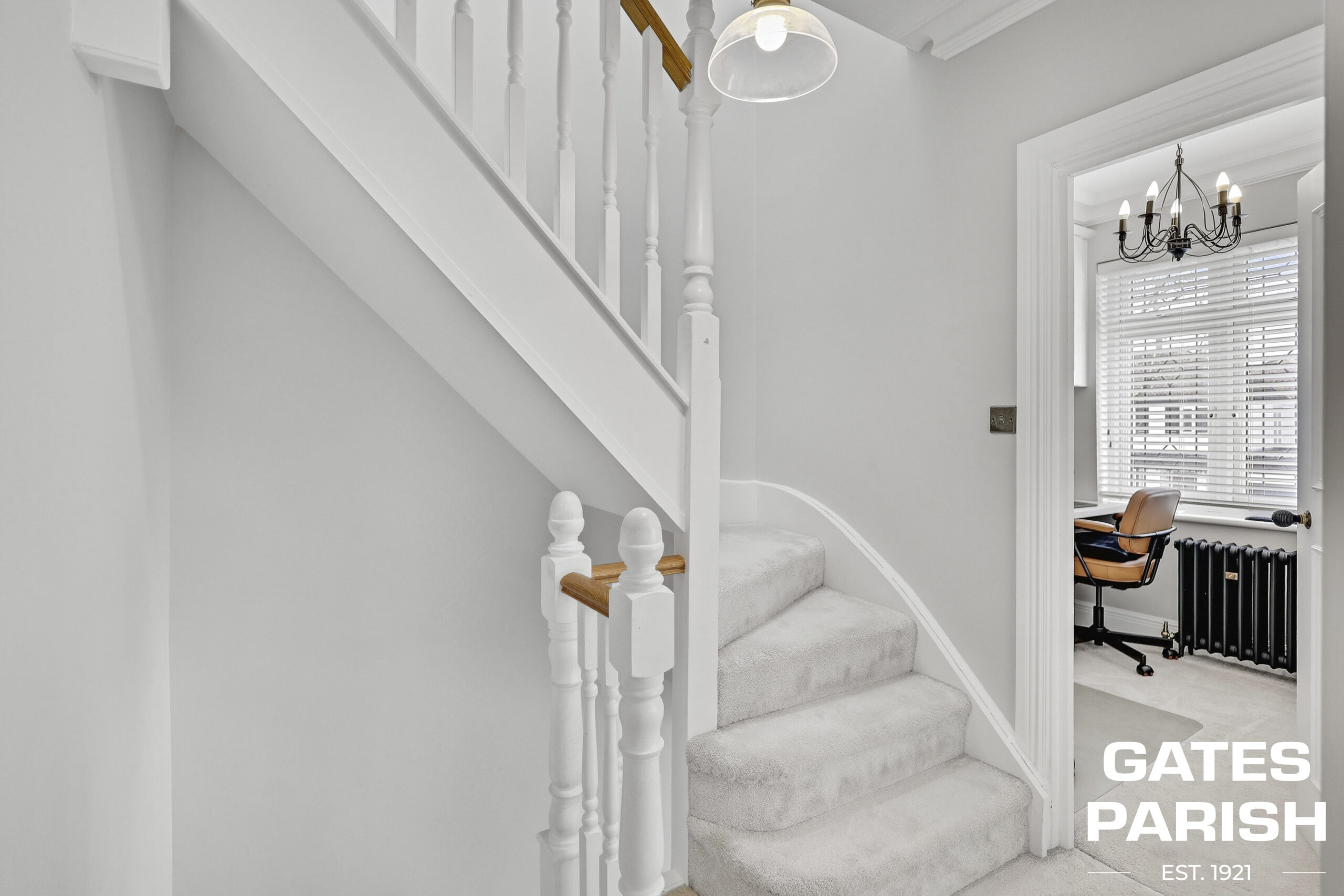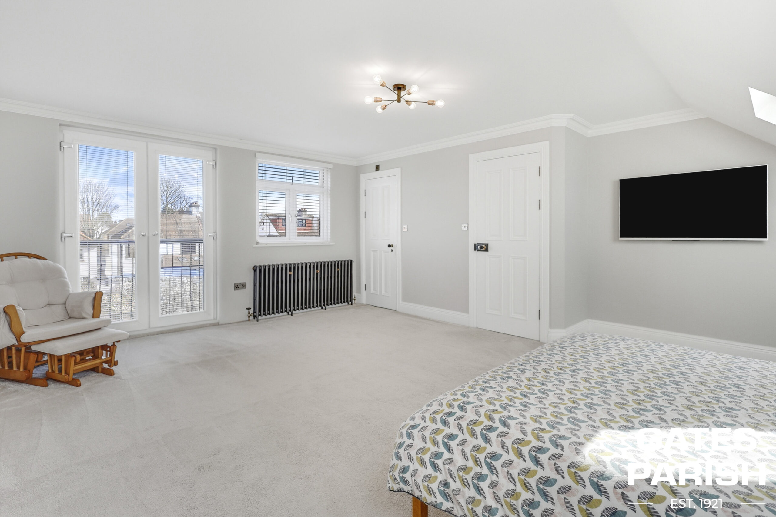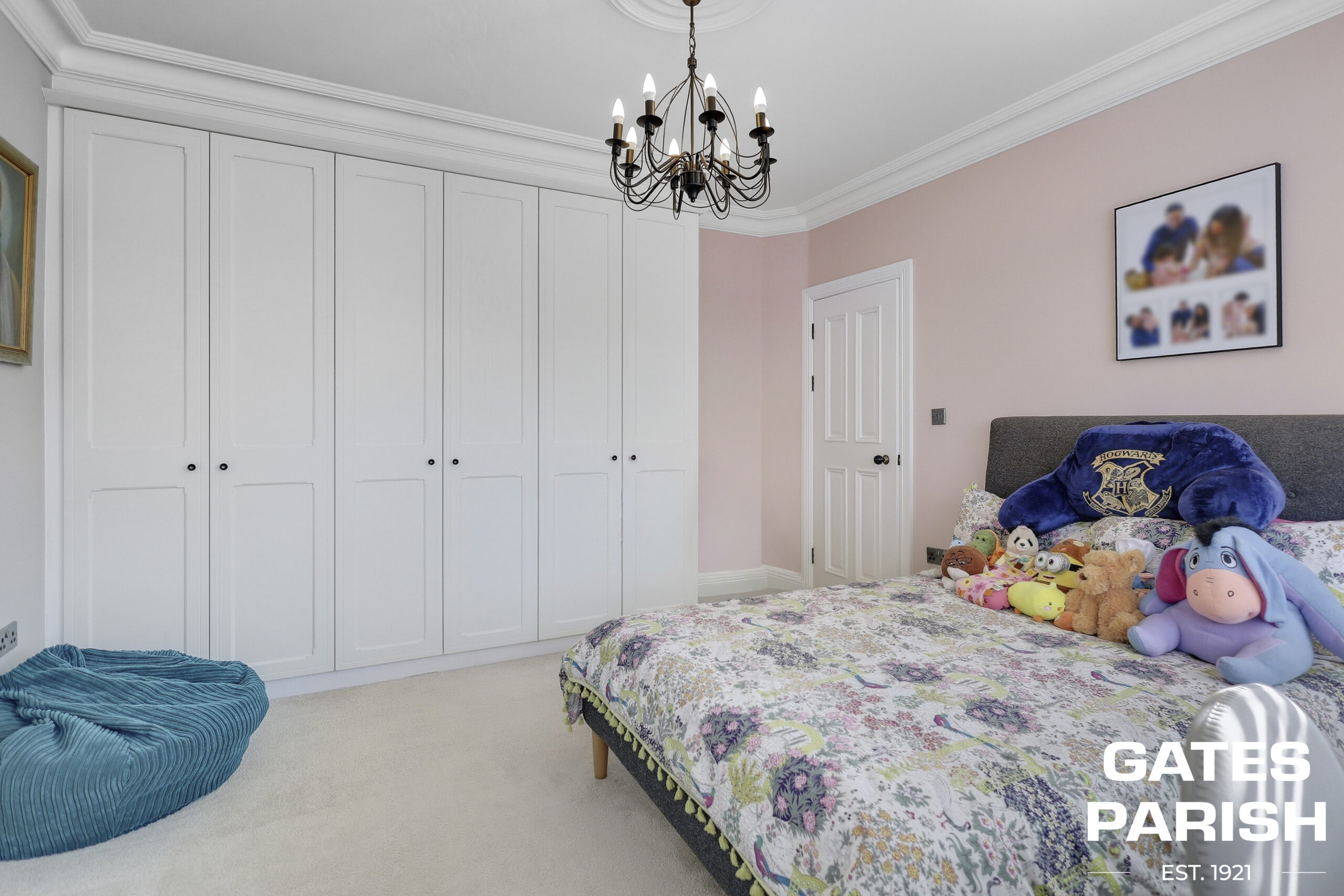 The first floor provides versatile accommodation including Bedroom Five / Study, ideal for home working. You will also find a generous double bedroom with en-suite, a modern family bathroom, and two further large double bedrooms, both benefiting from fitted storage and attractive bay windows.