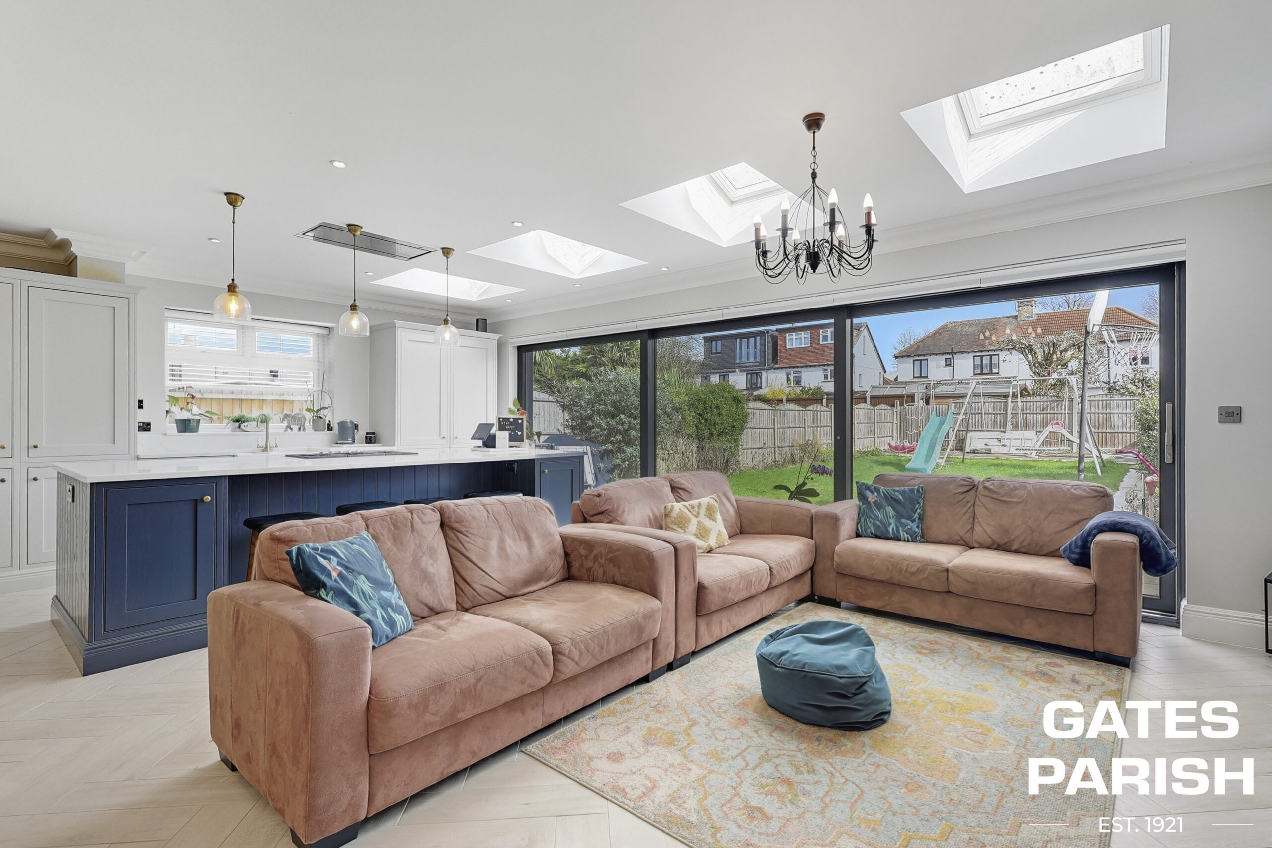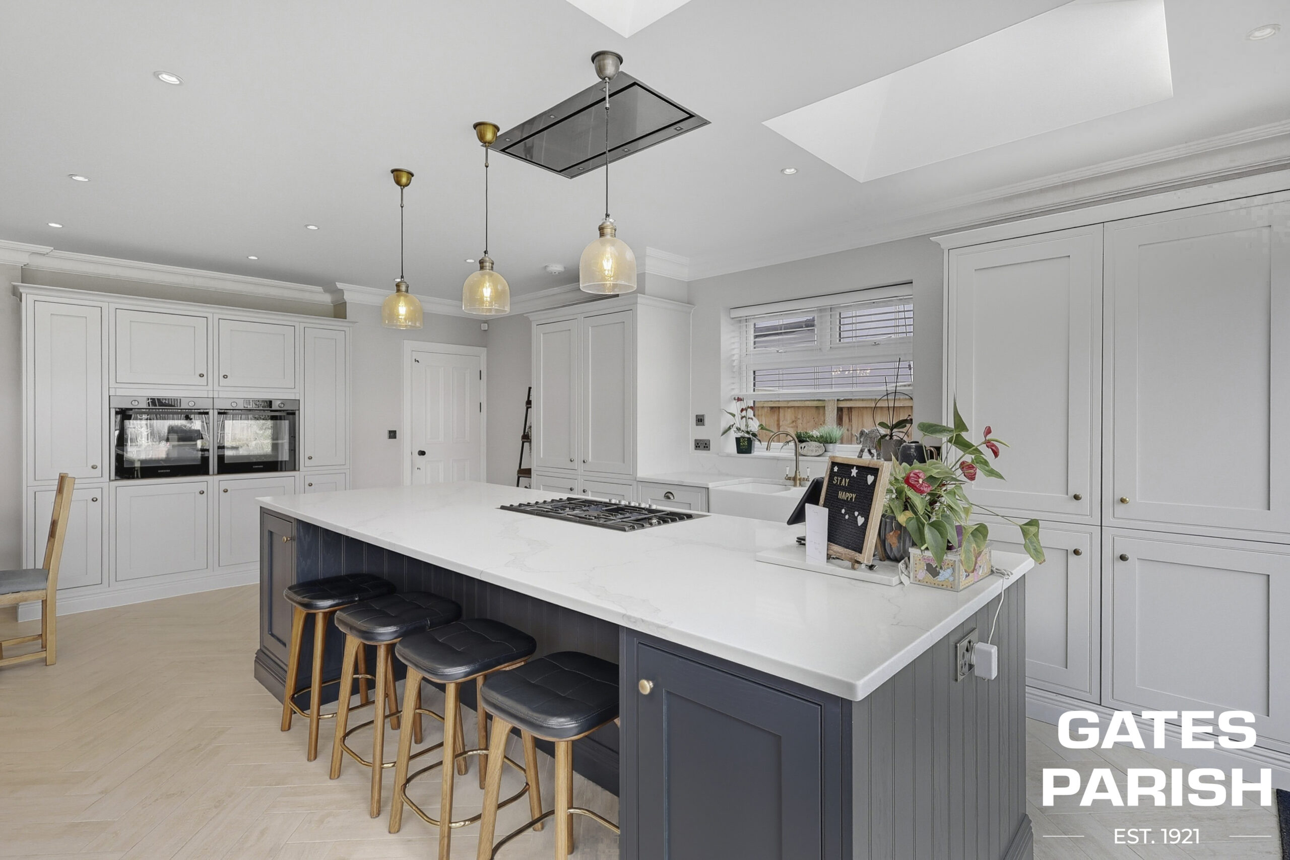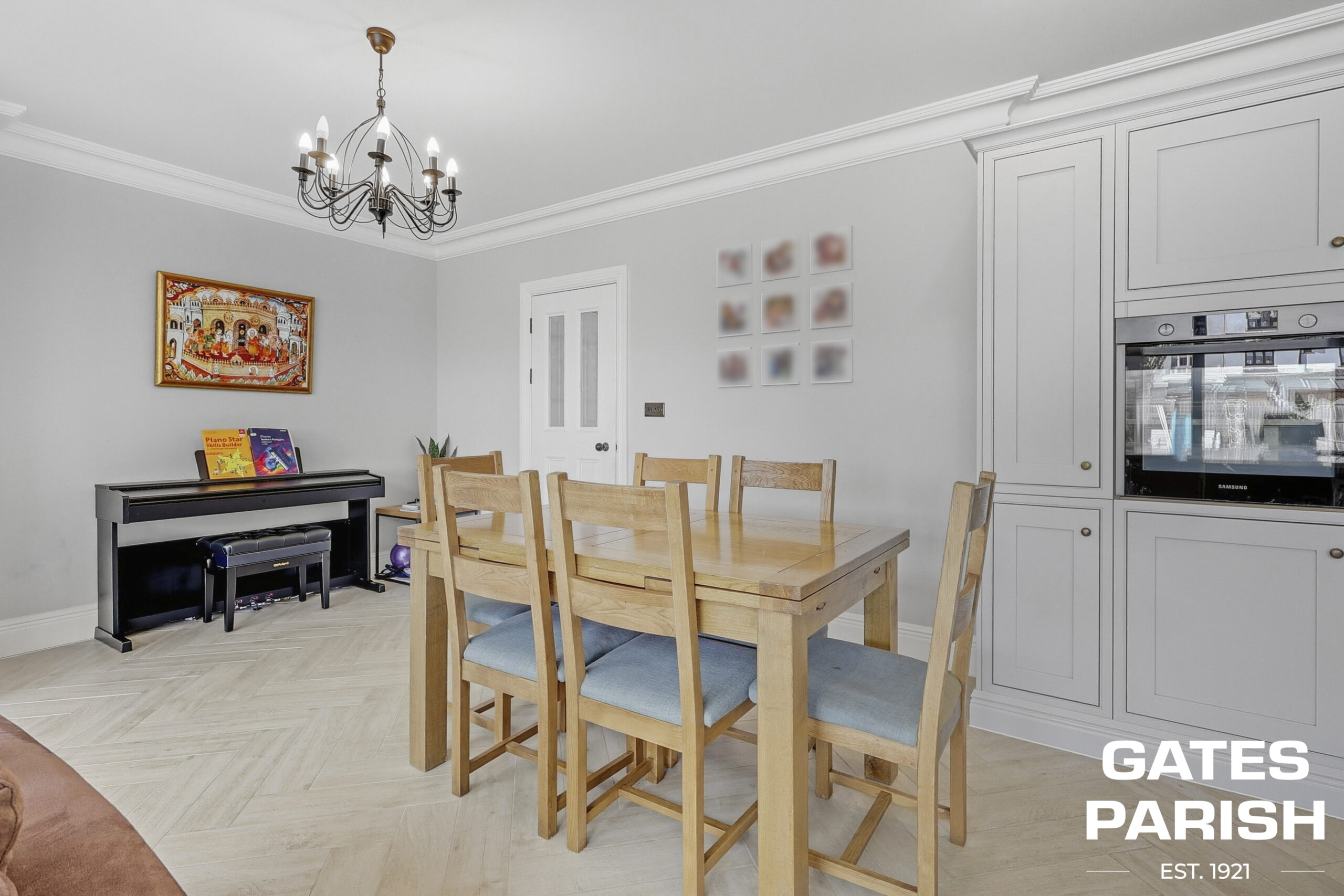 Undoubtedly the heart of the home is the beautifully extended open-plan kitchen, family and dining space, perfectly designed for modern living and entertaining. The stunning shaker-style kitchen is complemented by high-end integrated appliances and elegant stone worktops, while underfloor heating ensures year-round comfort. Large aluminium sliding doors open onto the rear garden, flooding the space with natural light and creating a seamless connection between indoor and outdoor living.