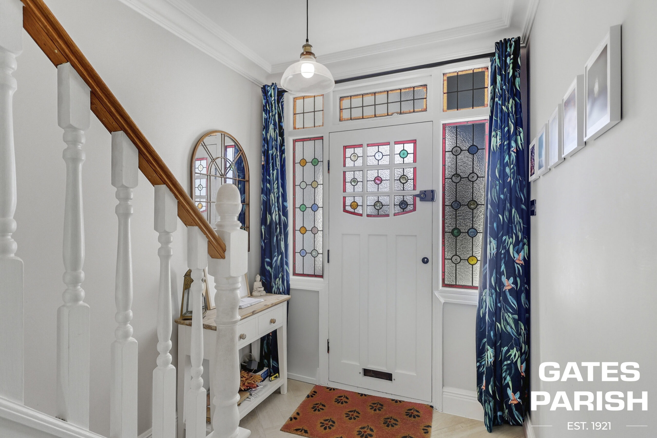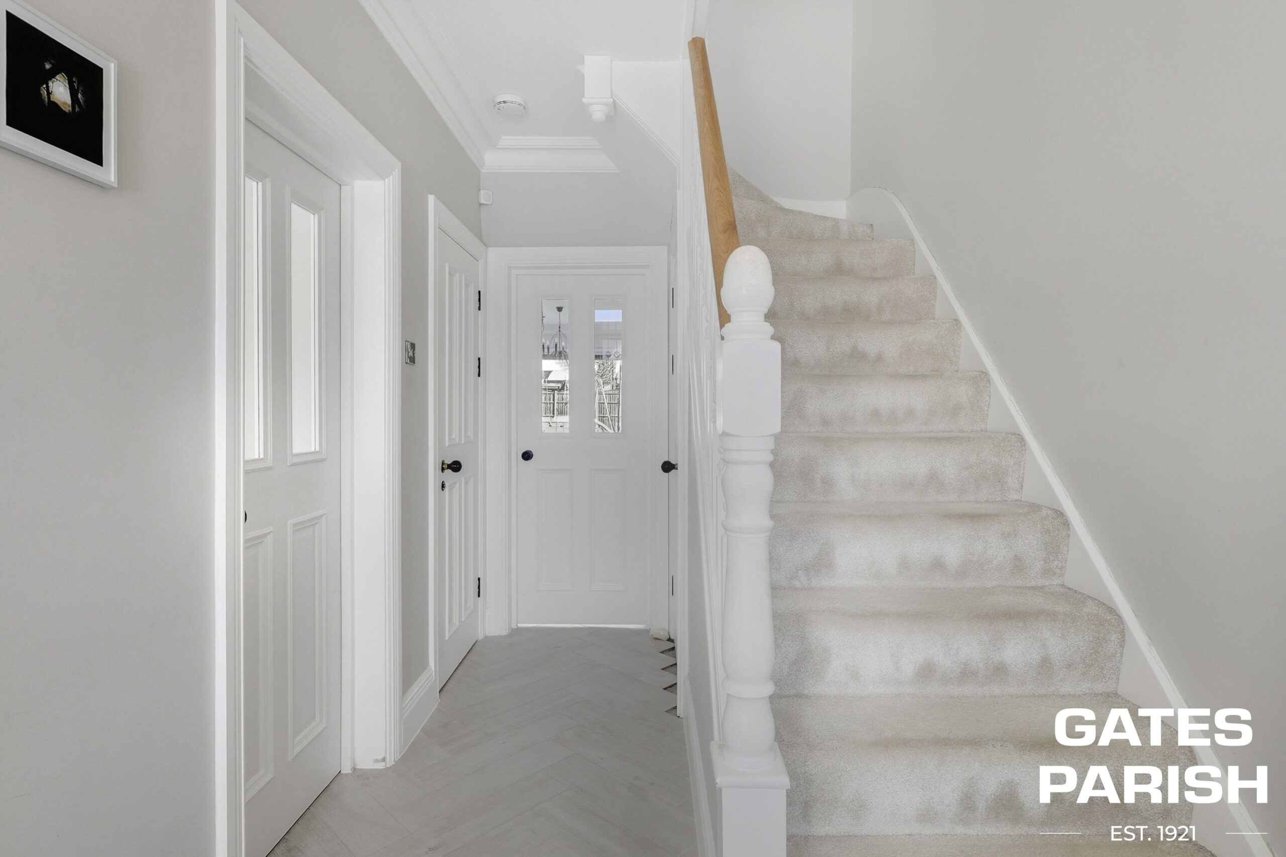 Upon entering through the original front door, you are welcomed by a spacious hallway which immediately sets the tone for the rest of the home. Natural light pours through the property, leading you into a bright and inviting layout which includes a separate lounge featuring a large bay window, a convenient downstairs cloakroom, and stairs rising to the first floor.
