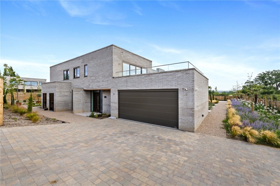 The views extend south to the rolling hills of the South Downs and west across open fields, offering constant reminders of the home’s exceptional location. A row of Liquidambar trees lines the western edge, forming a living green screen that provides privacy without limiting the sense of space. Every element has been thoughtfully executed, from gravel-stabilised driveways and triple bin storage to architectural fencing and a bespoke lighting scheme that softly illuminates paths and garden features after dark.