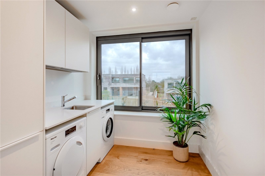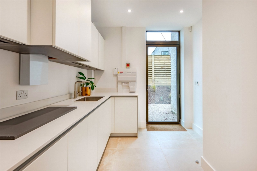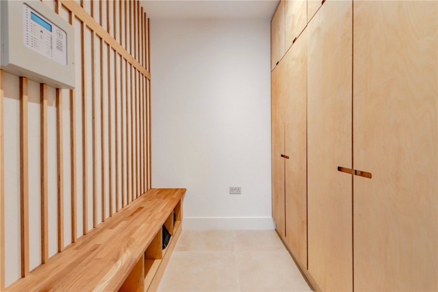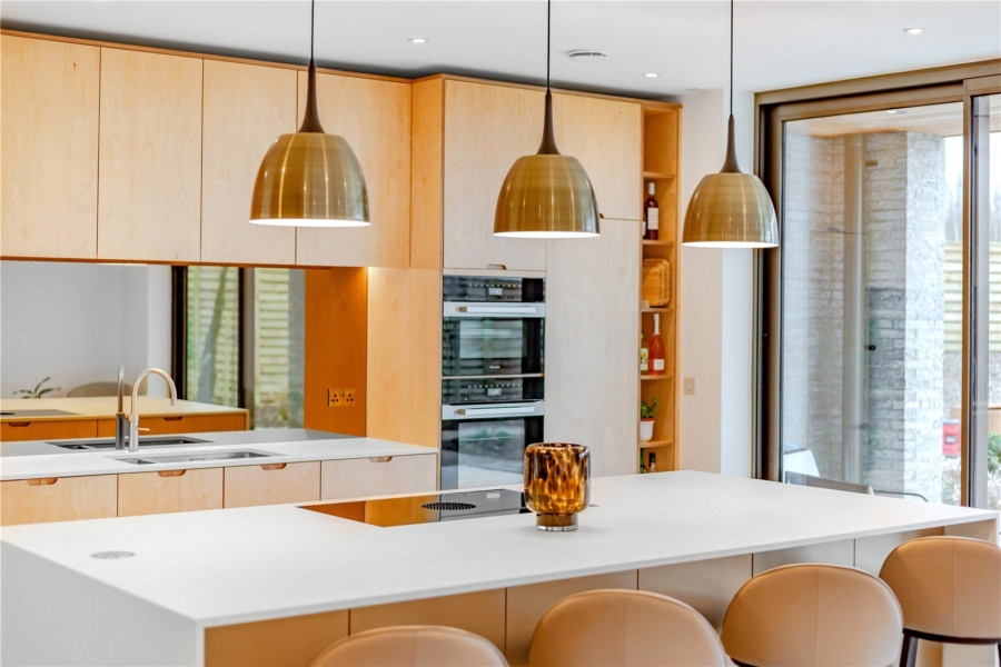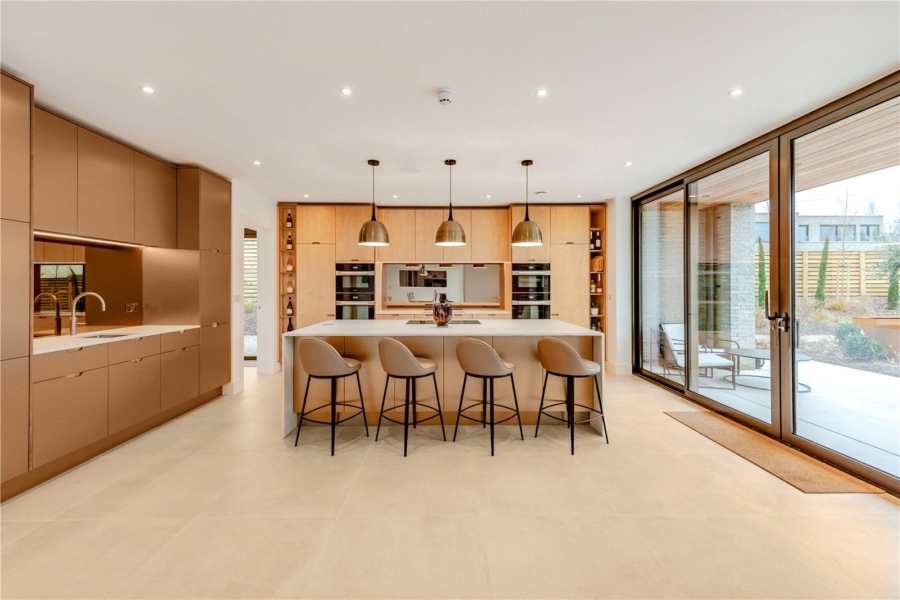 At the heart of the home, the kitchen blends hand-built craftsmanship with sophisticated engineering. Custom cabinetry in Latvian birch is paired with Hanex worktops polished to a soft satin glow. Integrated Siemens appliances, a Quooker boiling water tap, and a Bora hob with downdraft extraction ensure the space remains as practical as it is elegant. A walk-in pantry, a dedicated utility area, and access to the boot room add seamless functionality behind the scenes.