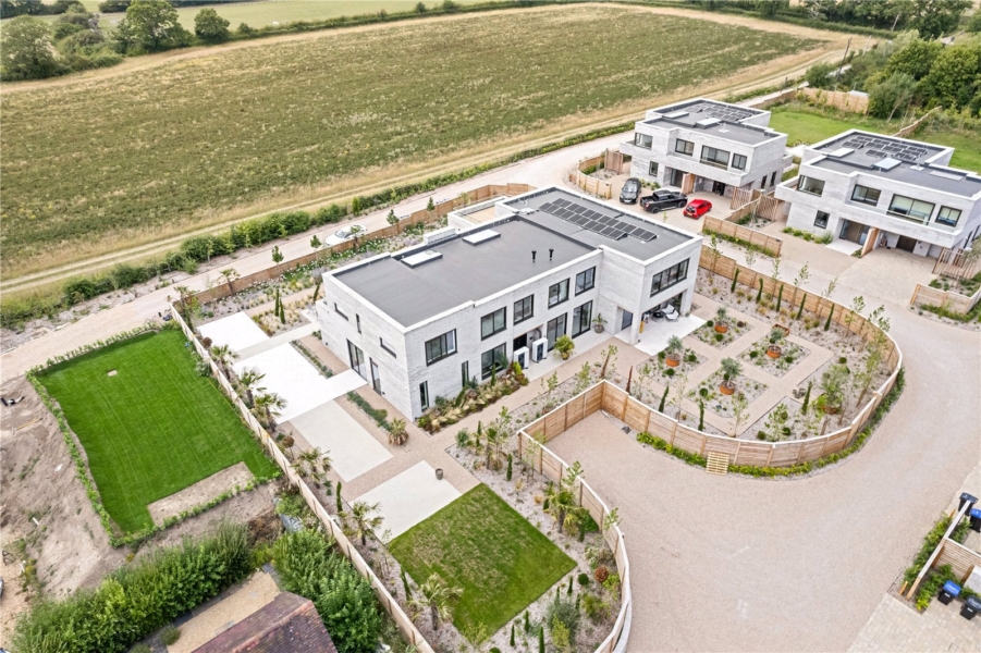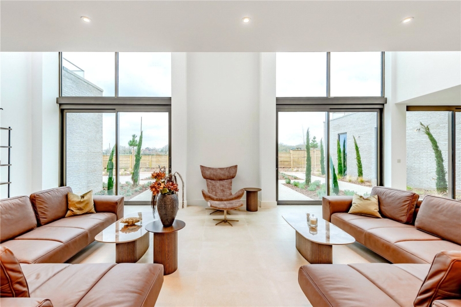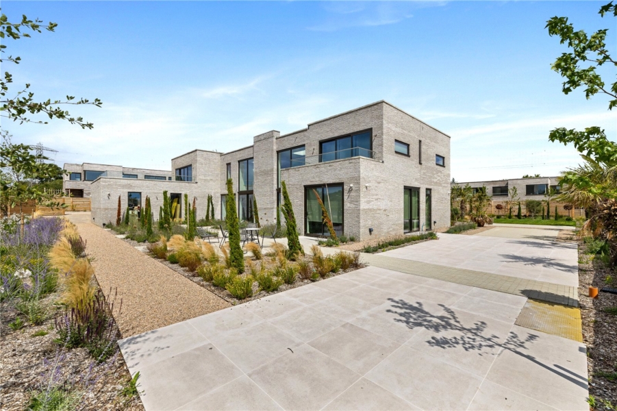 As you pass through the secure gates and approach via the long, tree-fringed drive, the atmosphere shifts. There’s a stillness here. A clarity. Clean-lined silhouettes and natural materials anchor the homes into their landscape, while generous glazing and timber accents hint at what lies within.