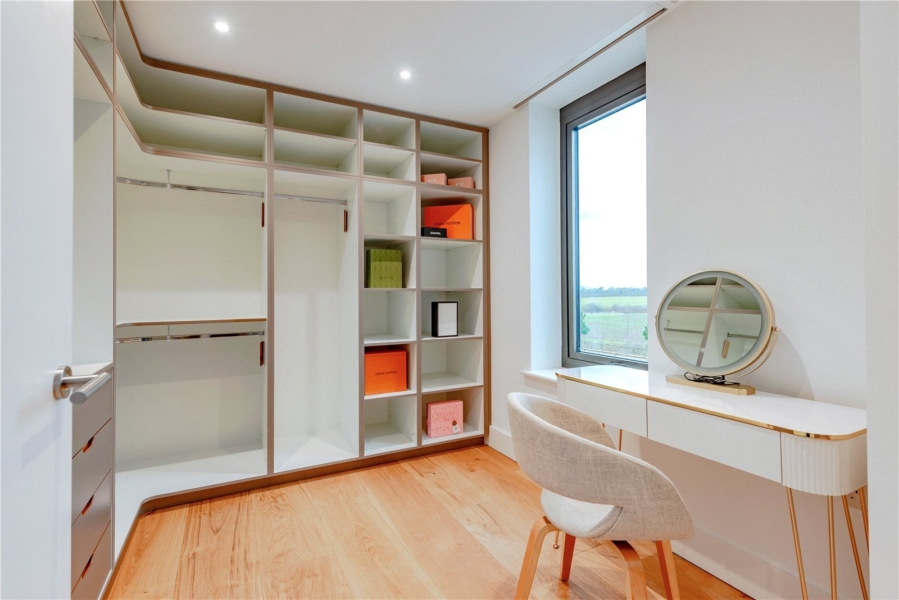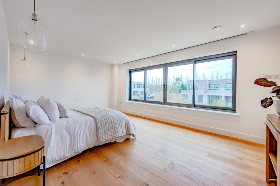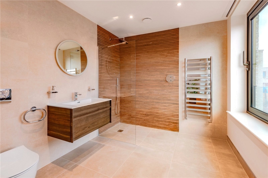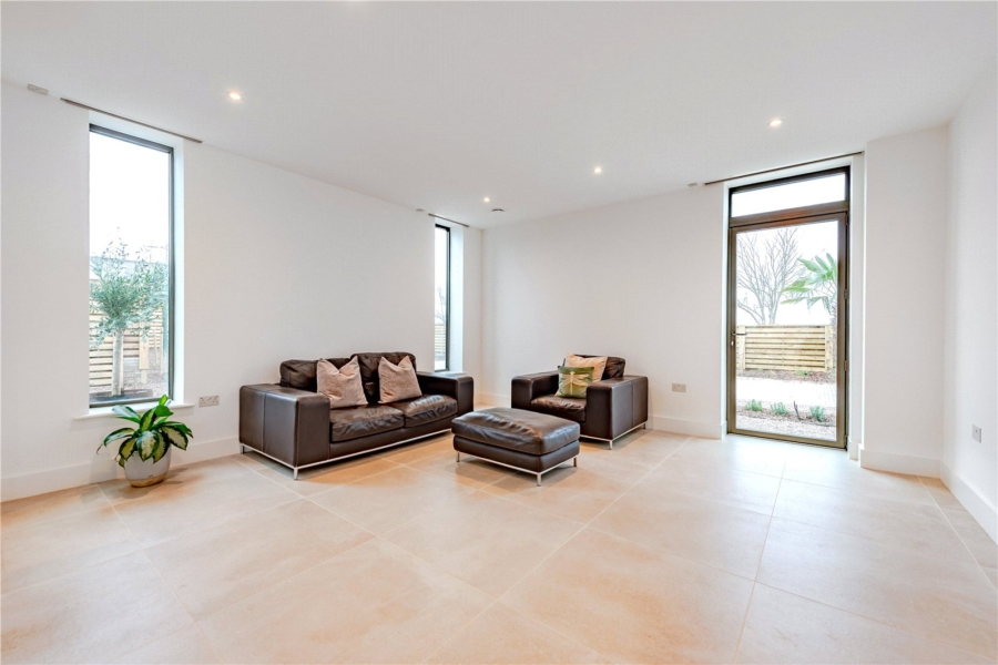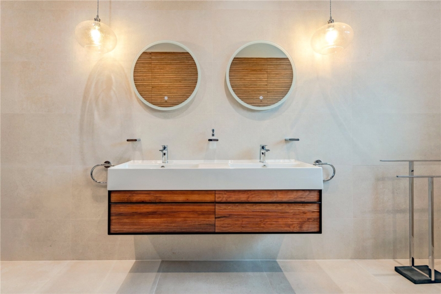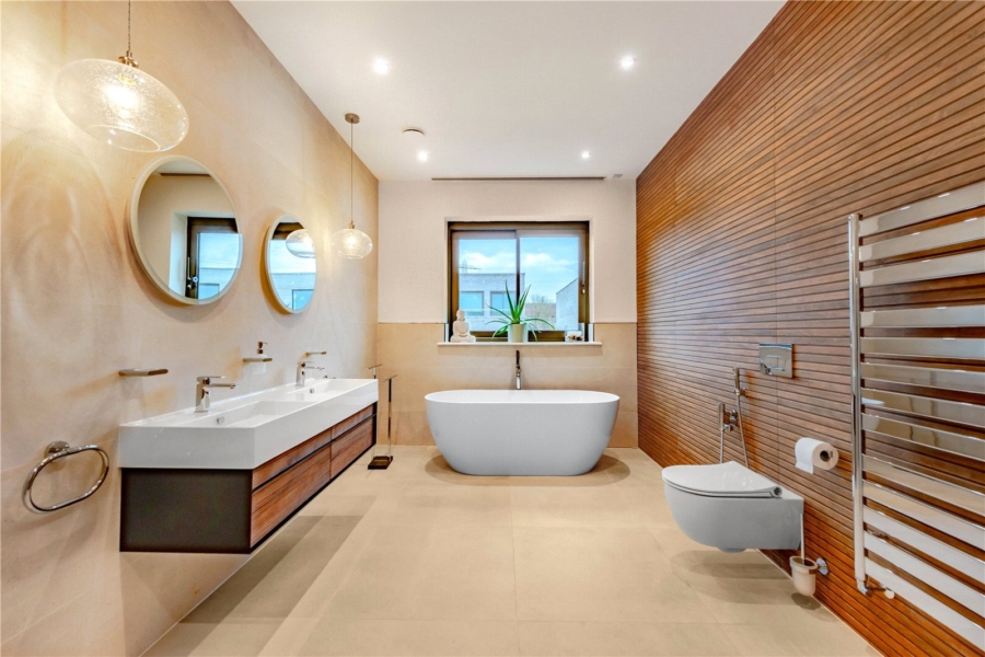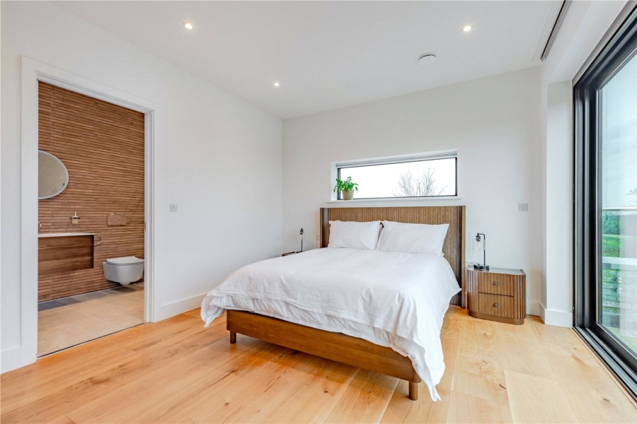 All four principal bedrooms are designed as personal retreats. Each features bespoke Italian wardrobes with soft-close doors and indulgent en suites wrapped in warm-toned Porcelanosa tiles. On the ground floor, a private guest suite opens directly to the garden, offering a quiet escape for visiting friends or extended family.
