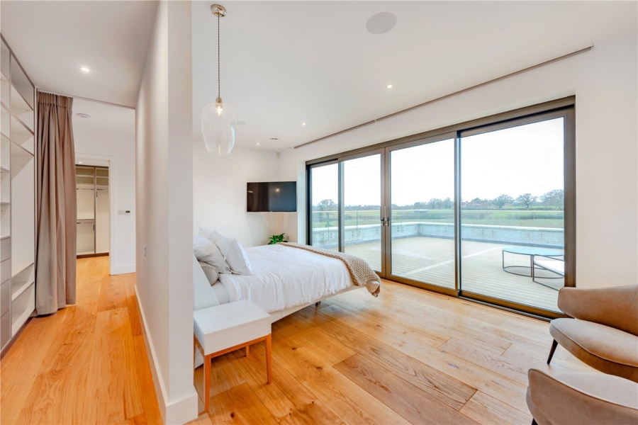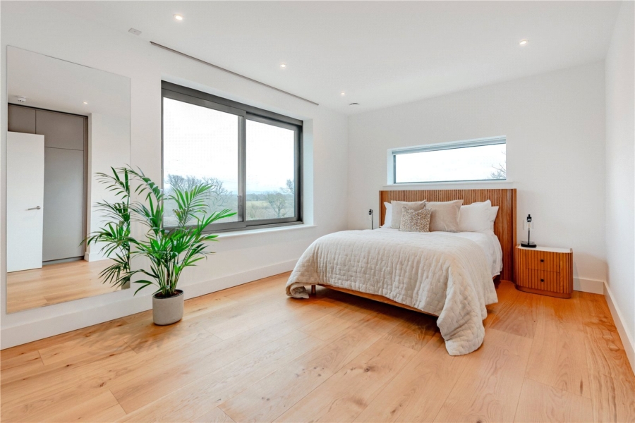 Upstairs, the principal bedroom spans an entire wing. A sanctuary in every sense, with a walk-in wardrobe, spa-style bathroom, and access to a private sun terrace overlooking the Downs. From the freestanding tub to the rainfall shower, every element speaks of calm, considered luxury. Wide oak floorboards run throughout, and the views from every window offer a daily connection to nature.