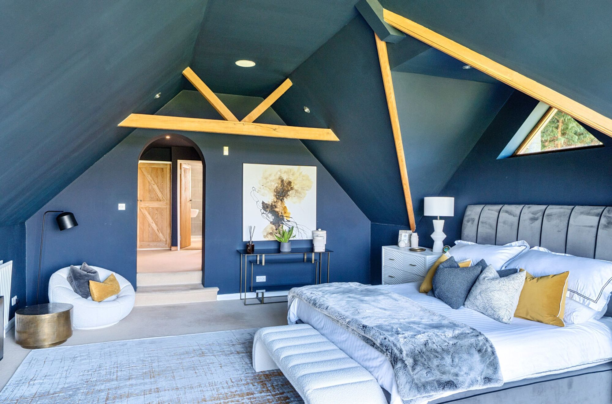 Upstairs, the principal bedroom suite is truly impressive, featuring a spacious dressing area with fitted wardrobes and a luxurious en suite bathroom, the space is colour-drenched providing a striking and stylish space. There is a lovely second bedroom with vaulted ceiling and Juliette balcony and two further double bedrooms all served by a family bathroom.