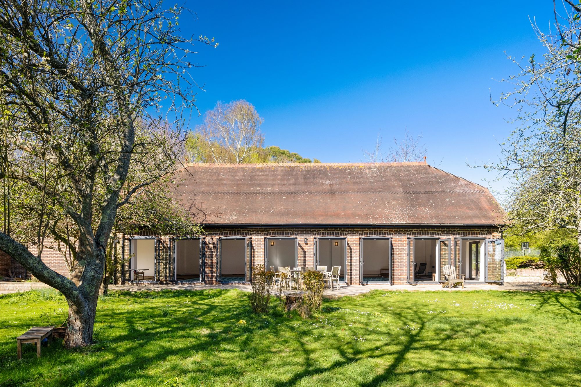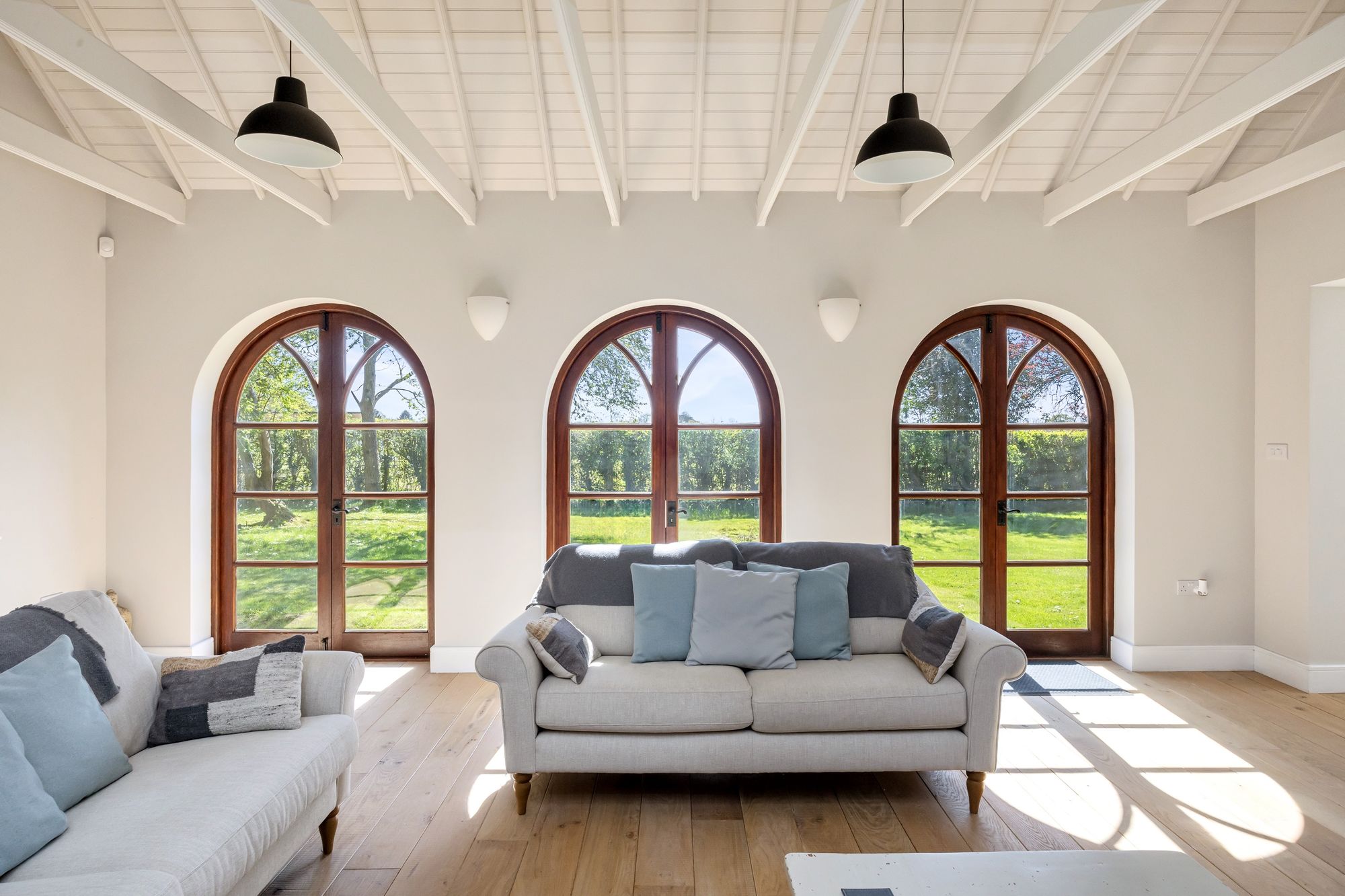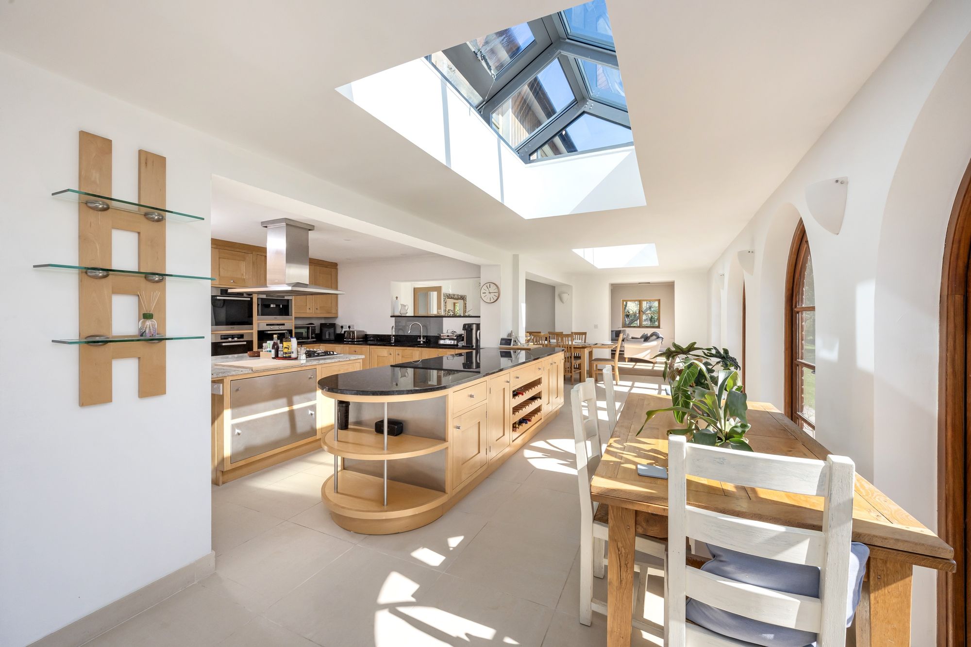 The main house welcomes you with an elegant double-height entrance hall. From the entrance hall you can walk in through to the heart of the home; the elegant, bespoke fitted kitchen/breakfast room with open-plan entertaining and dining space. The kitchen features an extensive range of floor and eye level units with black granite worktops and high-end integrated appliances. The large central island offers plenty of space for everyone to gather. The southern aspect of this space is flanked by a series of attractive arched doorways contributing to an abundance of natural daylight. Adjacent is spacious sitting room with a vaulted ceiling that provides a fantastic space for families to relax with views over the garden.