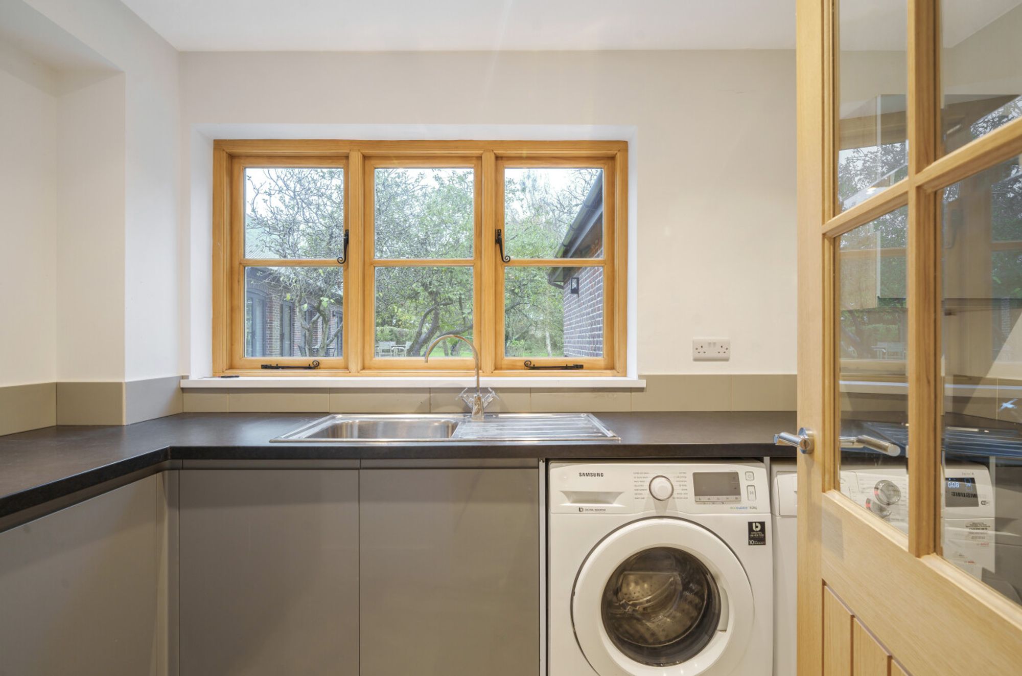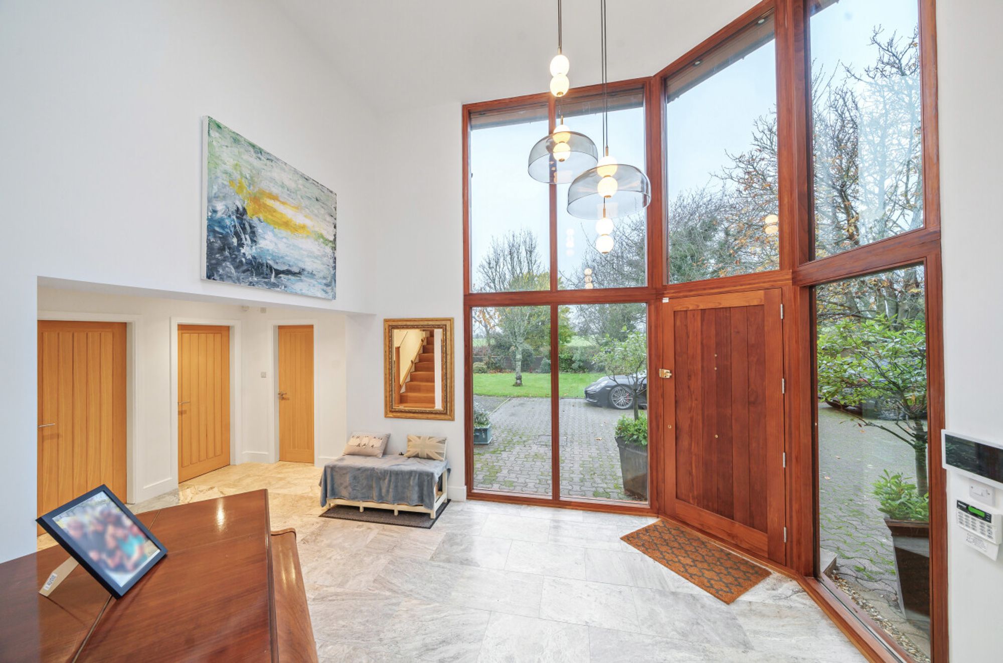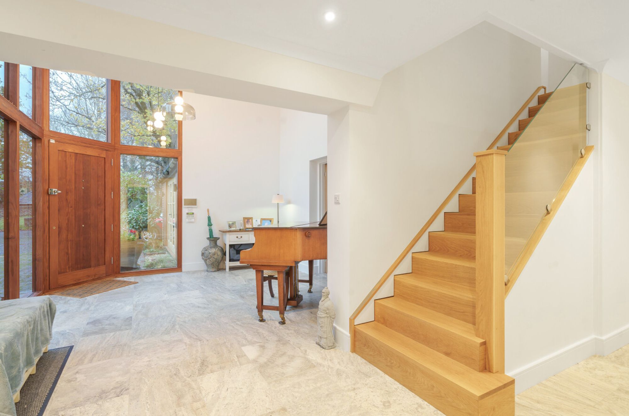 The main house welcomes you with an elegant double-height entrance hall. From the entrance hall you can walk in through to the heart of the home; the elegant, bespoke fitted kitchen/breakfast room with open-plan entertaining and dining space. The kitchen features an extensive range of floor and eye level units with black granite worktops and high-end integrated appliances. The large central island offers plenty of space for everyone to gather. The southern aspect of this space is flanked by a series of attractive arched doorways contributing to an abundance of natural daylight. Adjacent is spacious sitting room with a vaulted ceiling that provides a fantastic space for families to relax with views over the garden.