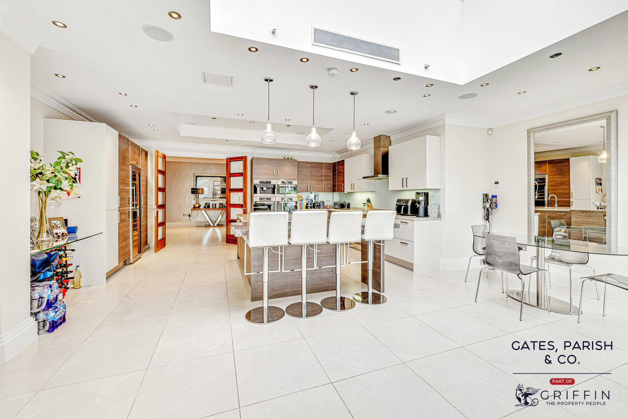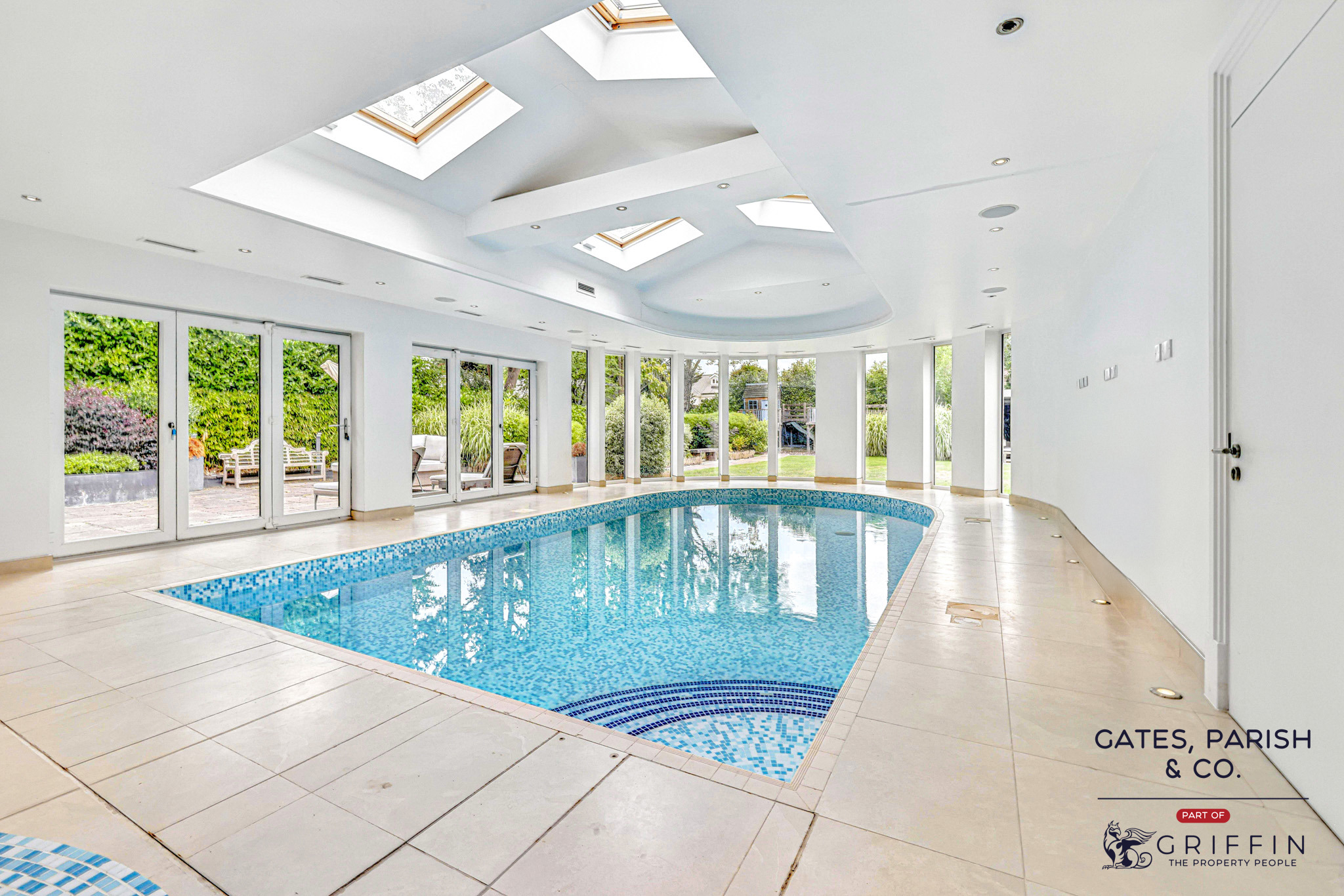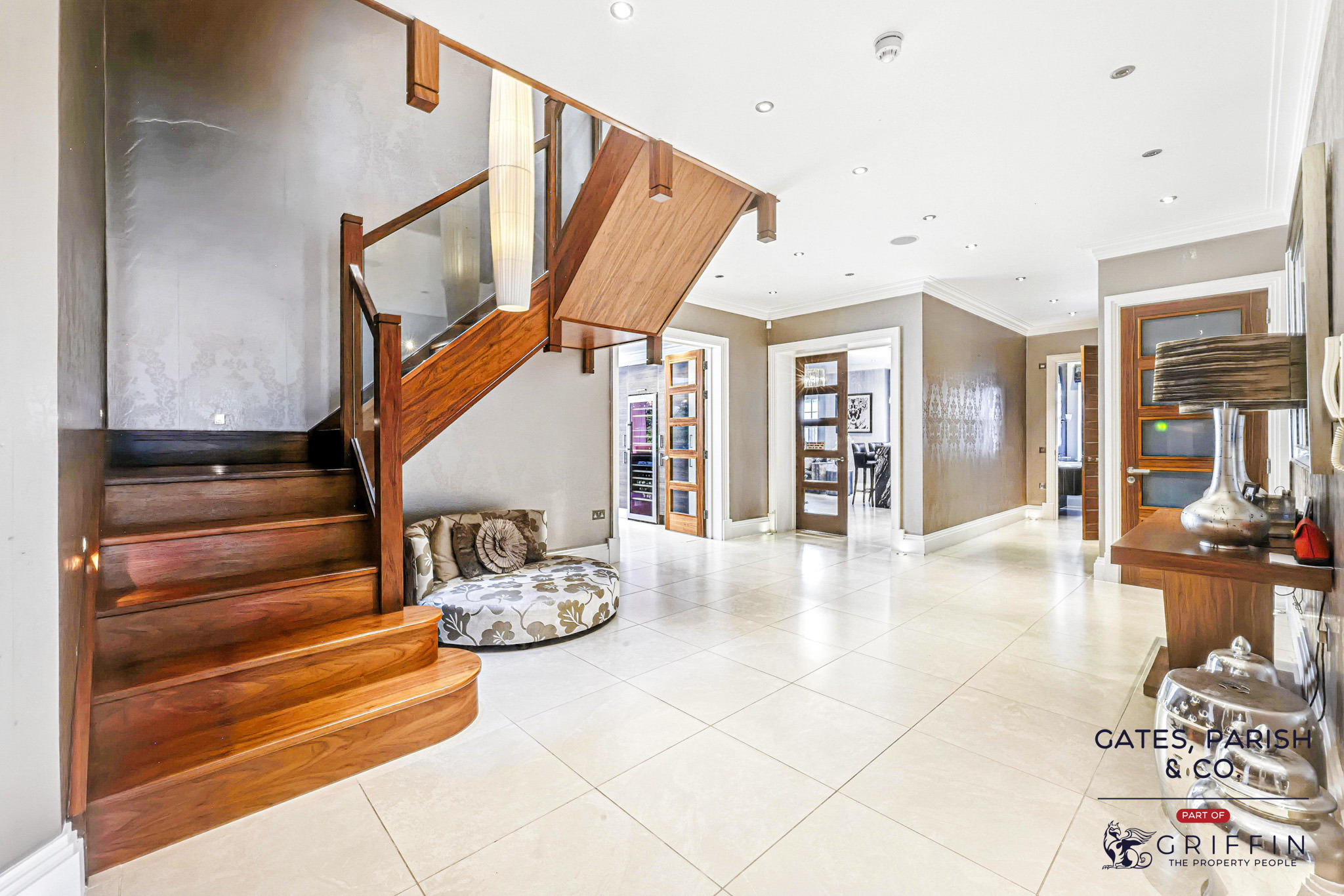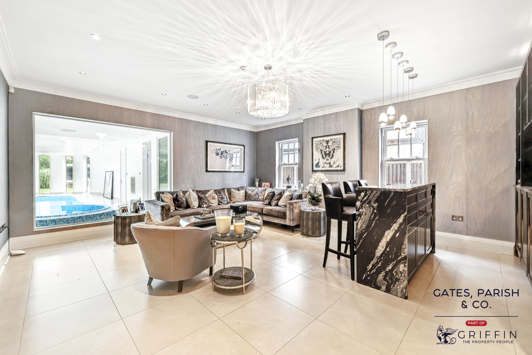 Upon entering the home, visitors are welcomed by an impressive hallway featuring a striking walnut and glass staircase that sets the tone for the craftsmanship and design throughout. The ground floor hosts a variety of opulent reception areas, including formal drawing and family rooms, a dedicated study or home office, and a family room with a custom marble bar overlooking the pool. Many of these spaces open onto the landscaped gardens through large bi-folding doors, encouraging an effortless indoor-outdoor lifestyle. At the heart of the home lies a bespoke designer kitchen created by Fusion Interior Design. This space combines elegance and functionality, fitted with premium Miele appliances, a Quooker boiling water tap, coffee machine, wine cooler, pop-up power points, and beautiful garden and pool views. A separate utility area and cloakroom further support daily living needs.