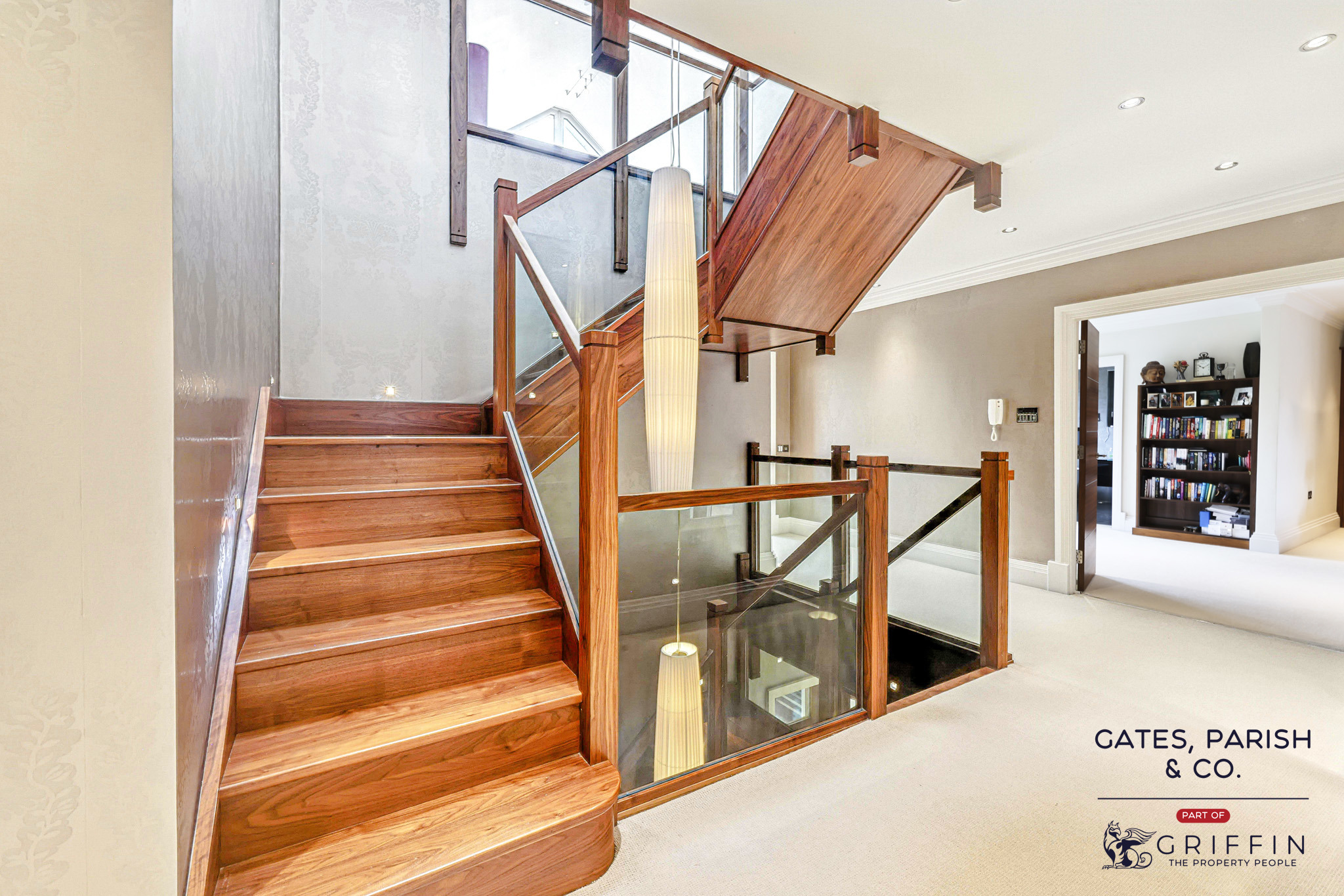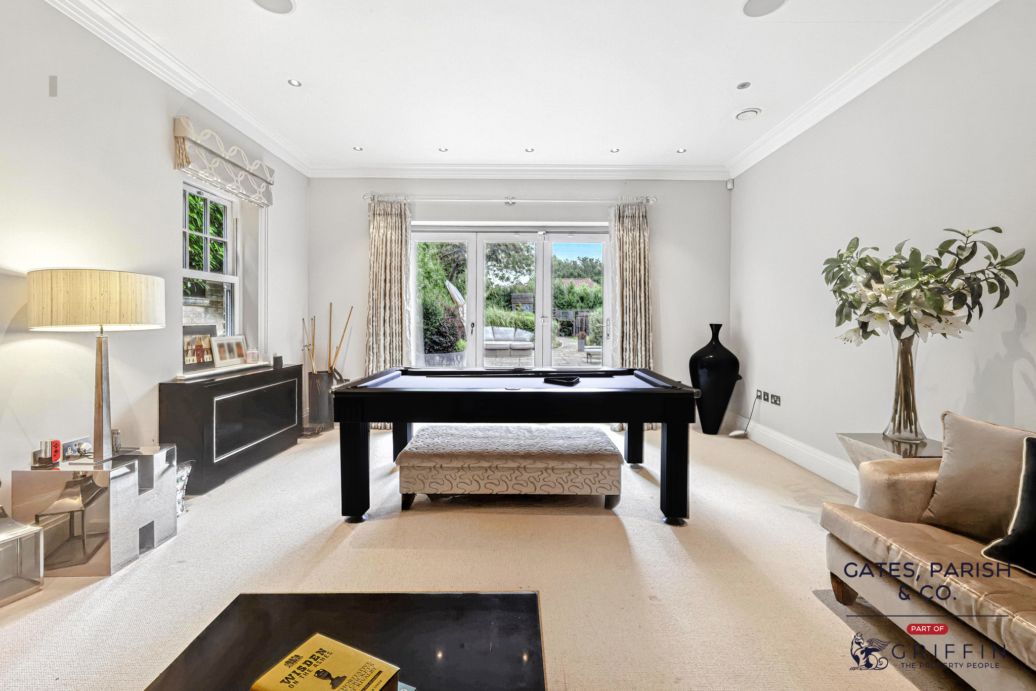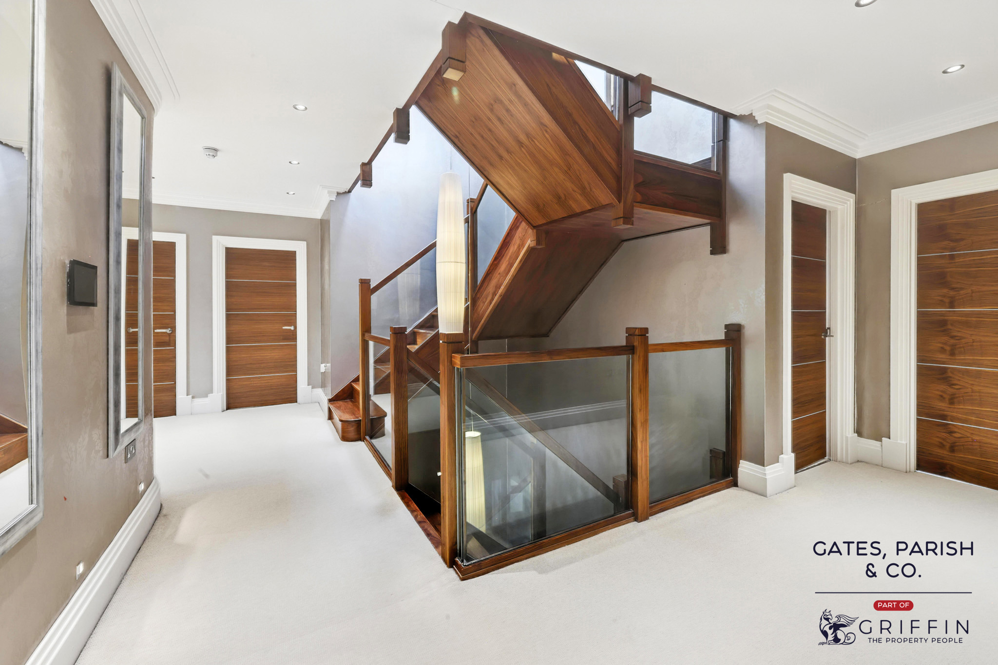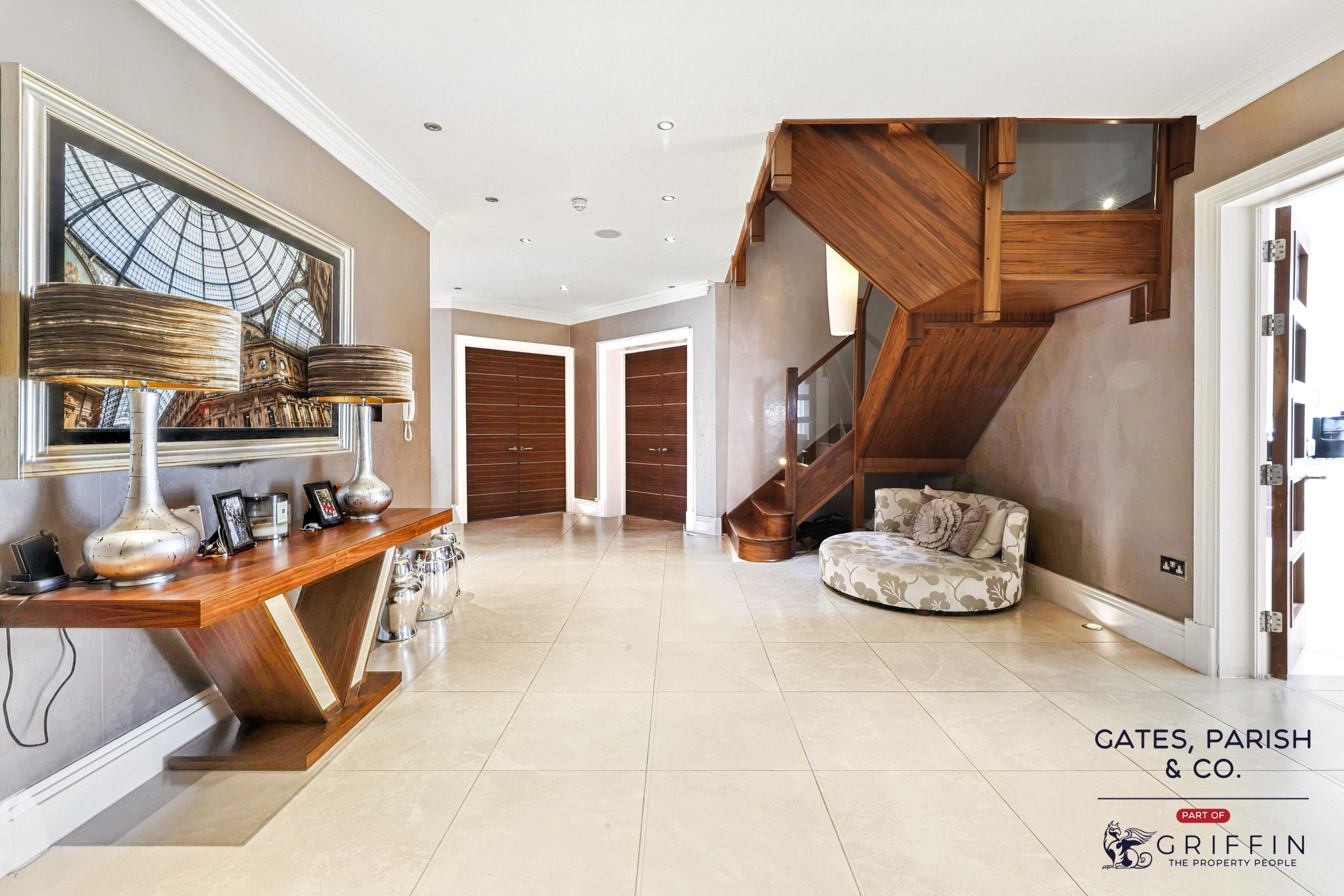 Upon entering the home, visitors are welcomed by an impressive hallway featuring a striking walnut and glass staircase that sets the tone for the craftsmanship and design throughout. The ground floor hosts a variety of opulent reception areas, including formal drawing and family rooms, a dedicated study or home office, and a family room with a custom marble bar overlooking the pool. Many of these spaces open onto the landscaped gardens through large bi-folding doors, encouraging an effortless indoor-outdoor lifestyle. At the heart of the home lies a bespoke designer kitchen created by Fusion Interior Design. This space combines elegance and functionality, fitted with premium Miele appliances, a Quooker boiling water tap, coffee machine, wine cooler, pop-up power points, and beautiful garden and pool views. A separate utility area and cloakroom further support daily living needs.