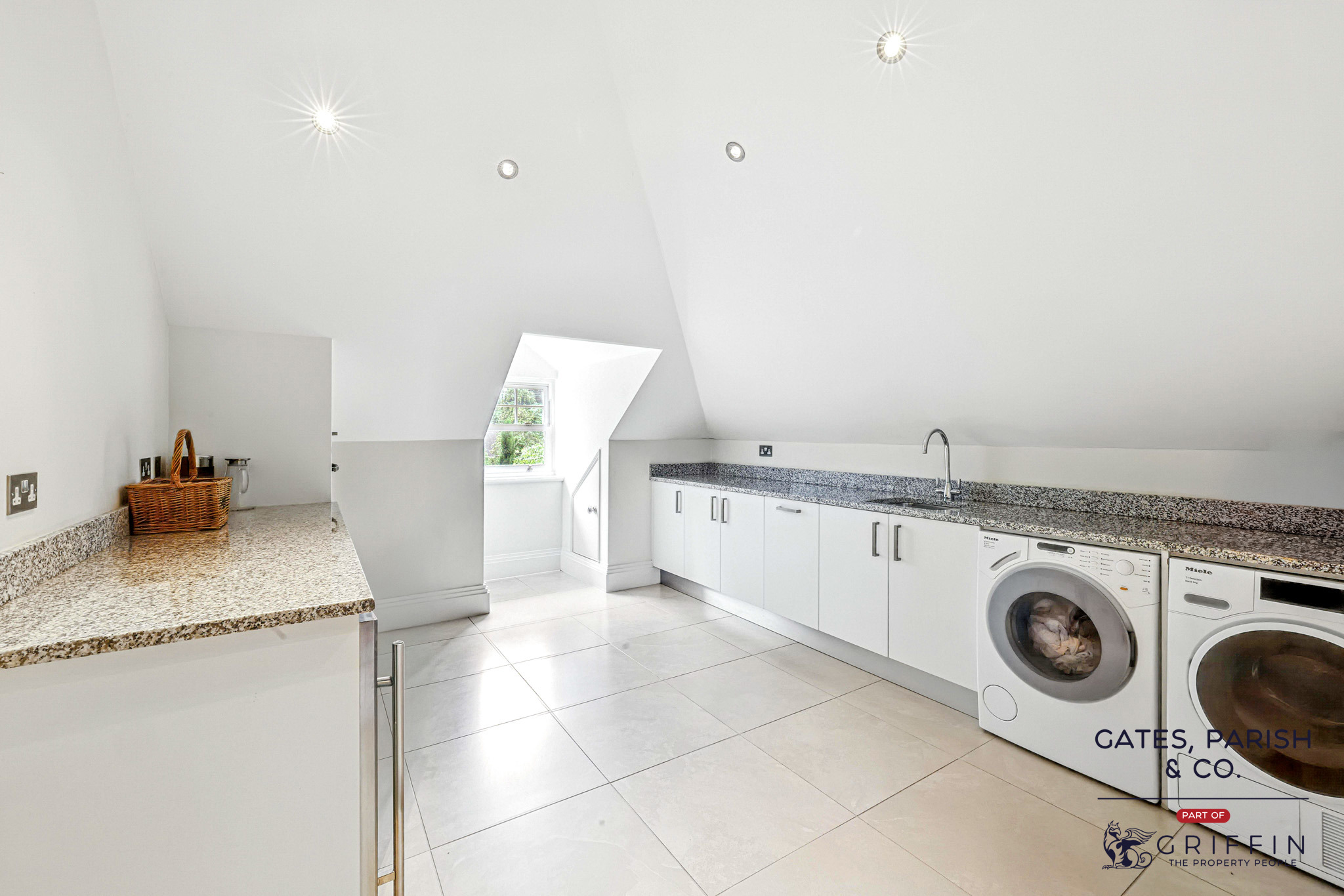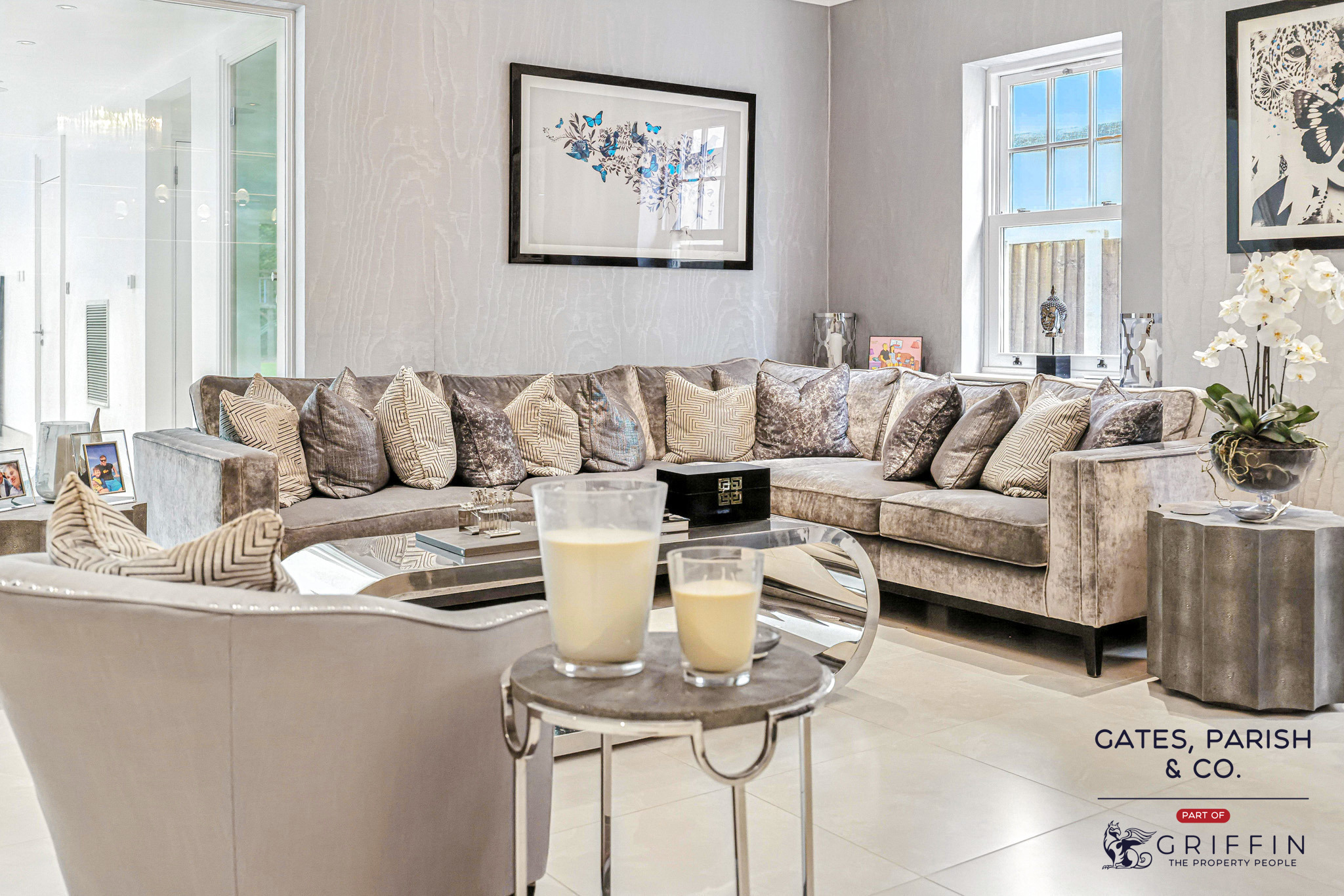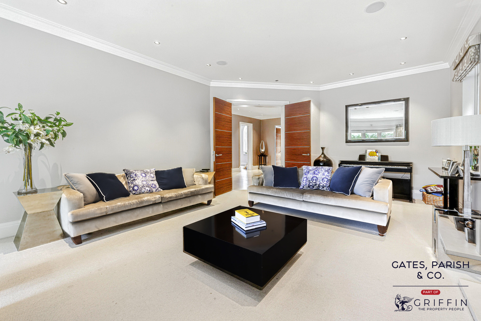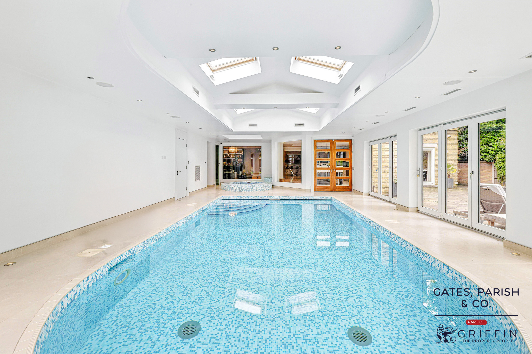 Upon entering the home, visitors are welcomed by an impressive hallway featuring a striking walnut and glass staircase that sets the tone for the craftsmanship and design throughout. The ground floor hosts a variety of opulent reception areas, including formal drawing and family rooms, a dedicated study or home office, and a family room with a custom marble bar overlooking the pool. Many of these spaces open onto the landscaped gardens through large bi-folding doors, encouraging an effortless indoor-outdoor lifestyle. At the heart of the home lies a bespoke designer kitchen created by Fusion Interior Design. This space combines elegance and functionality, fitted with premium Miele appliances, a Quooker boiling water tap, coffee machine, wine cooler, pop-up power points, and beautiful garden and pool views. A separate utility area and cloakroom further support daily living needs.