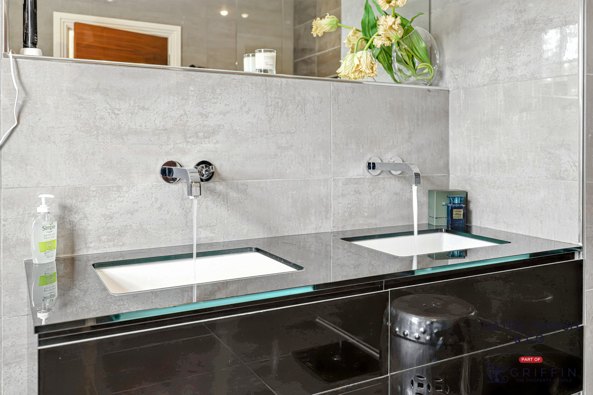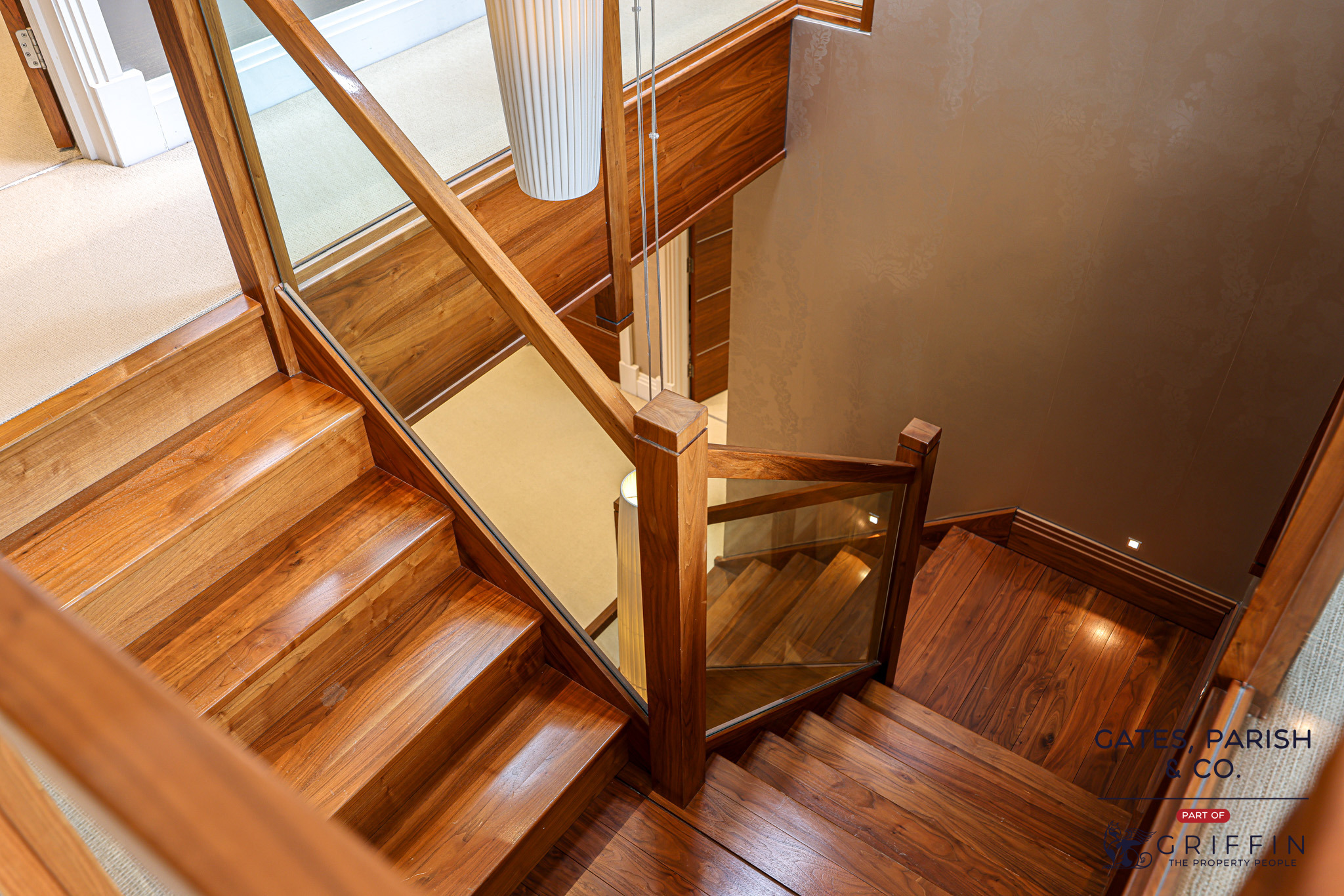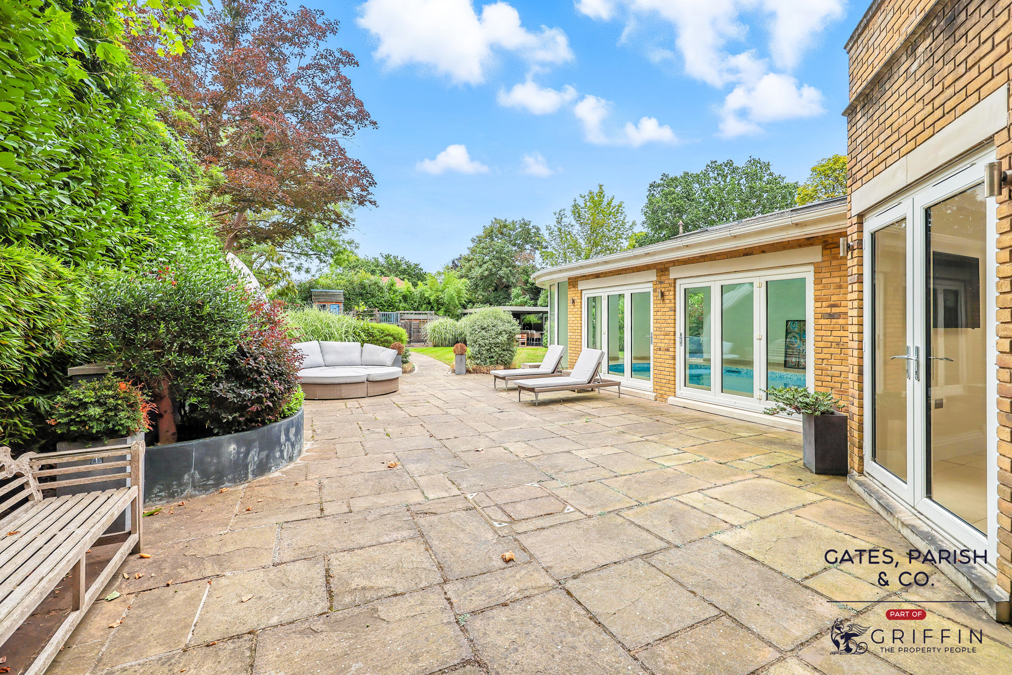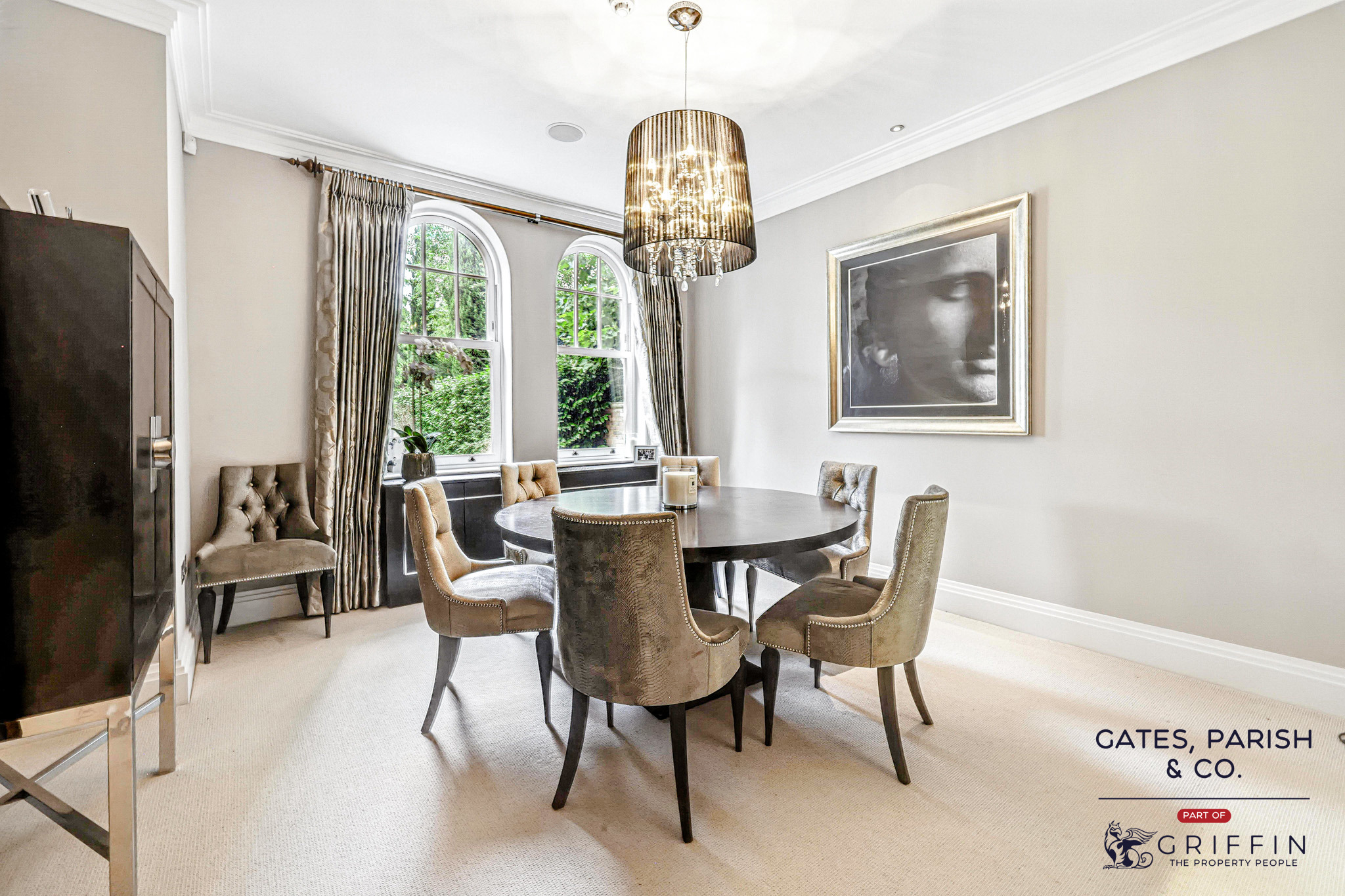 Upon entering the home, visitors are welcomed by an impressive hallway featuring a striking walnut and glass staircase that sets the tone for the craftsmanship and design throughout. The ground floor hosts a variety of opulent reception areas, including formal drawing and family rooms, a dedicated study or home office, and a family room with a custom marble bar overlooking the pool. Many of these spaces open onto the landscaped gardens through large bi-folding doors, encouraging an effortless indoor-outdoor lifestyle. At the heart of the home lies a bespoke designer kitchen created by Fusion Interior Design. This space combines elegance and functionality, fitted with premium Miele appliances, a Quooker boiling water tap, coffee machine, wine cooler, pop-up power points, and beautiful garden and pool views. A separate utility area and cloakroom further support daily living needs.