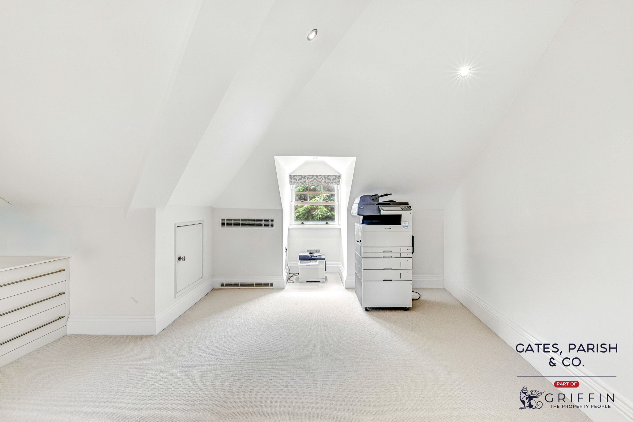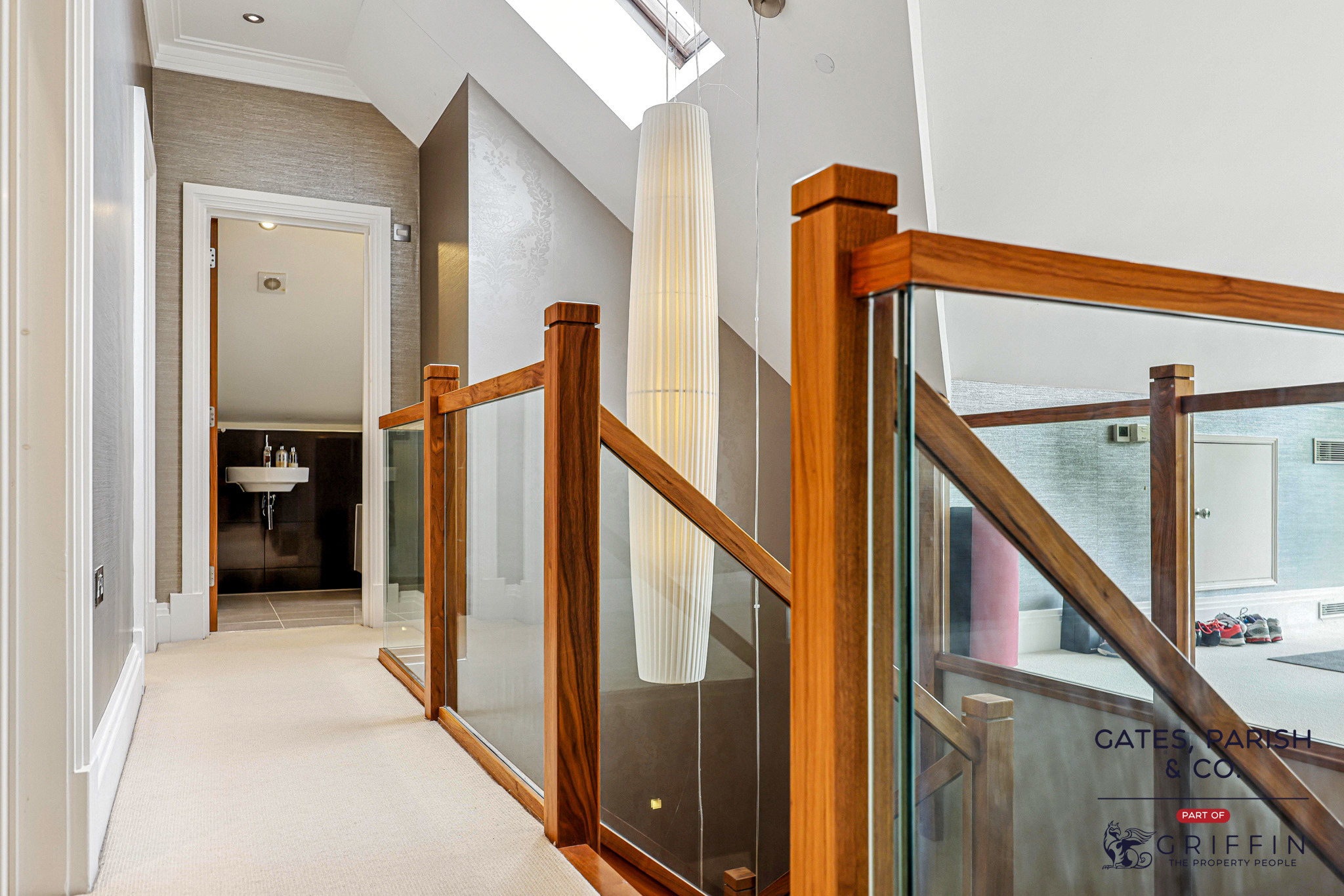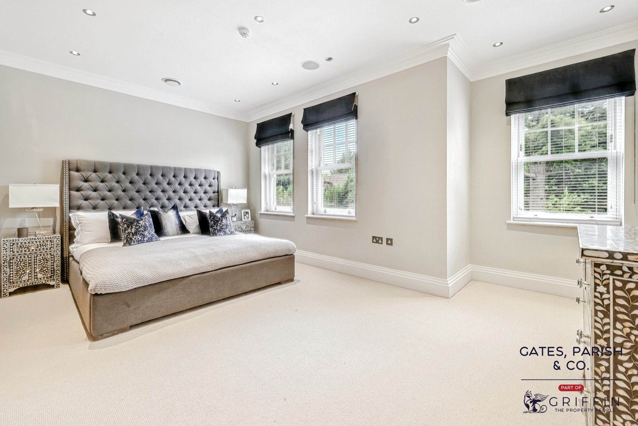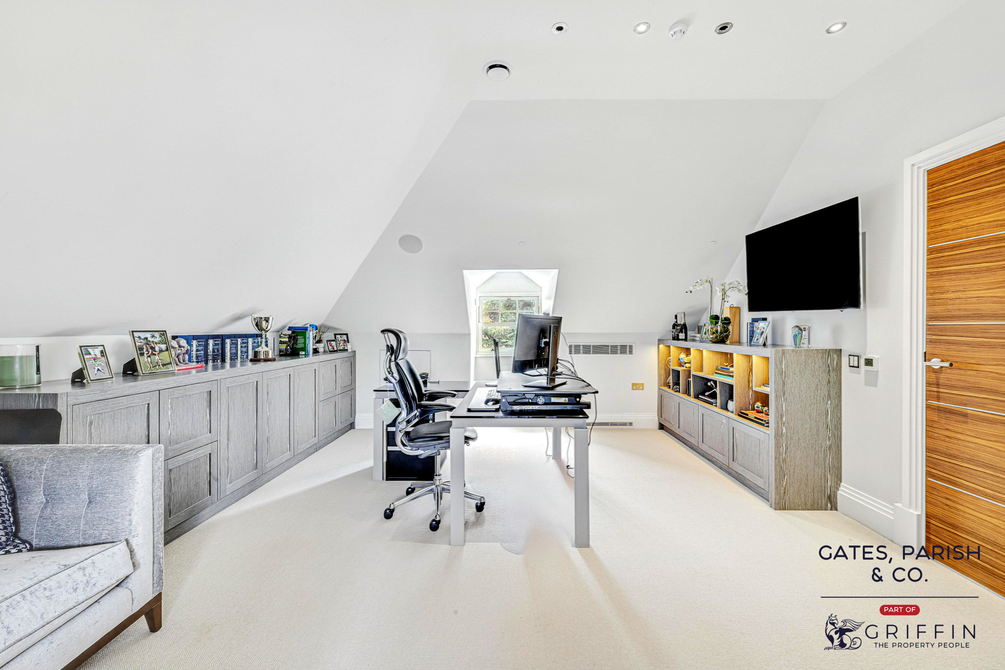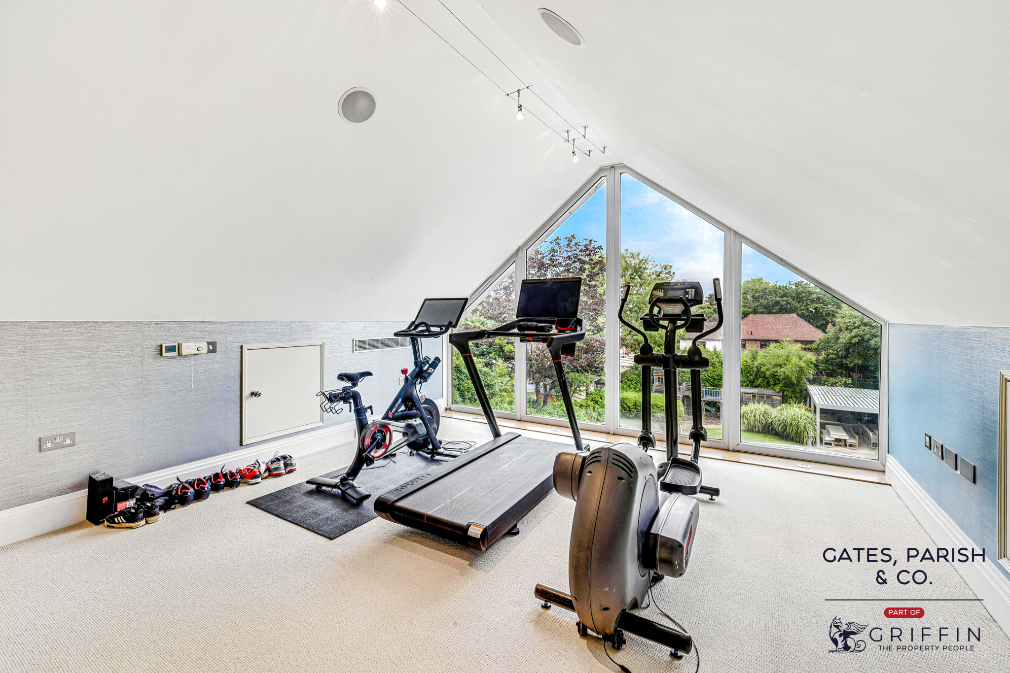 The indoor leisure complex is a standout feature, comprising a heated swimming pool, jacuzzi, sauna, and dedicated bathroom and changing facilities, offering year-round wellness and relaxation. On the first floor, the grand principal bedroom suite provides an exquisite retreat, complete with a private balcony, dressing area, and beautifully appointed en-suite bathroom. This floor also includes three further bedrooms with their own en-suites, a large double bedroom, and an additional stylish bathroom. The second floor offers two more bedrooms?currently used as home office spaces?a gym area with floor-to-ceiling glazing overlooking the gardens, a utility room, and a further bathroom, delivering remarkable flexibility for a modern lifestyle.