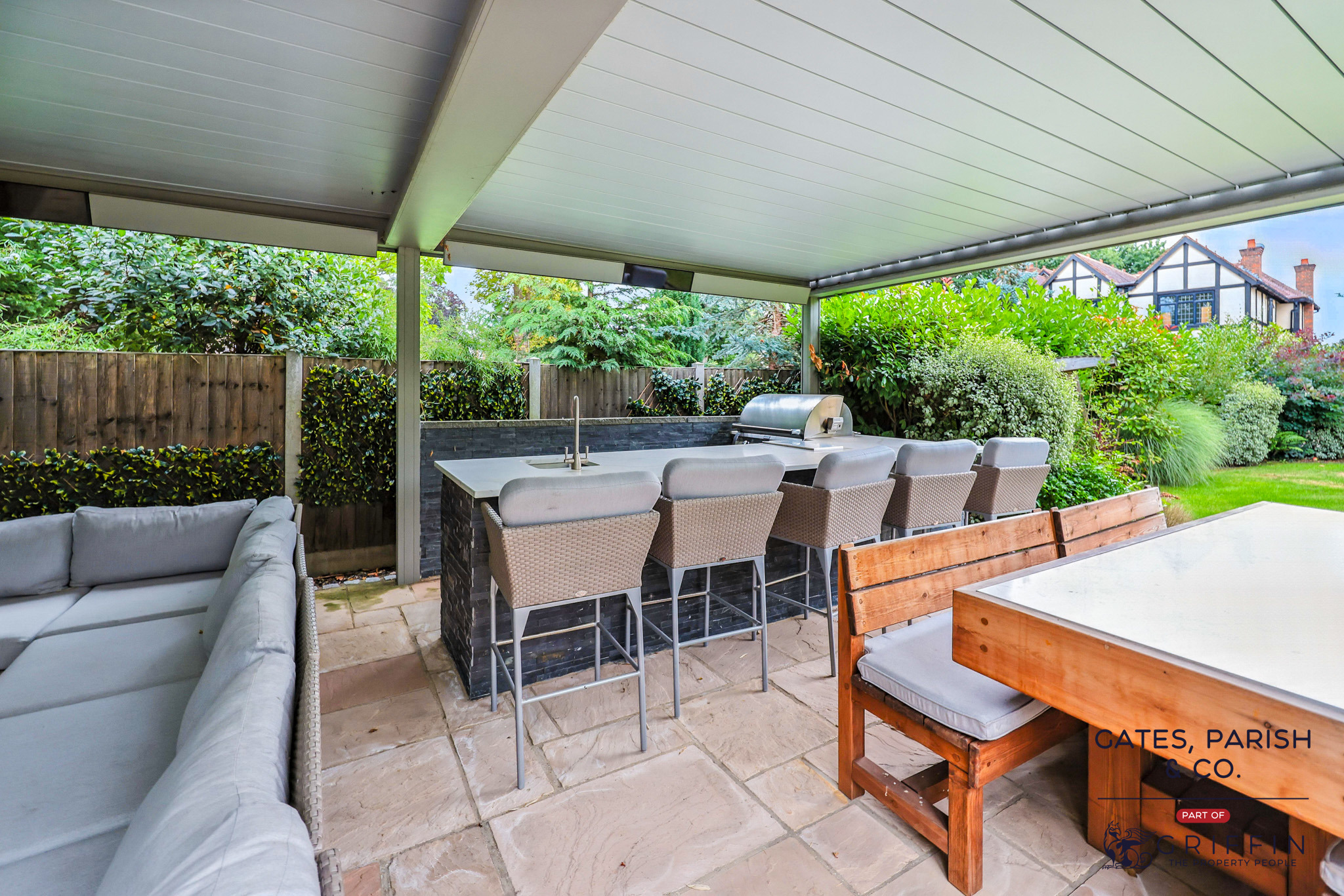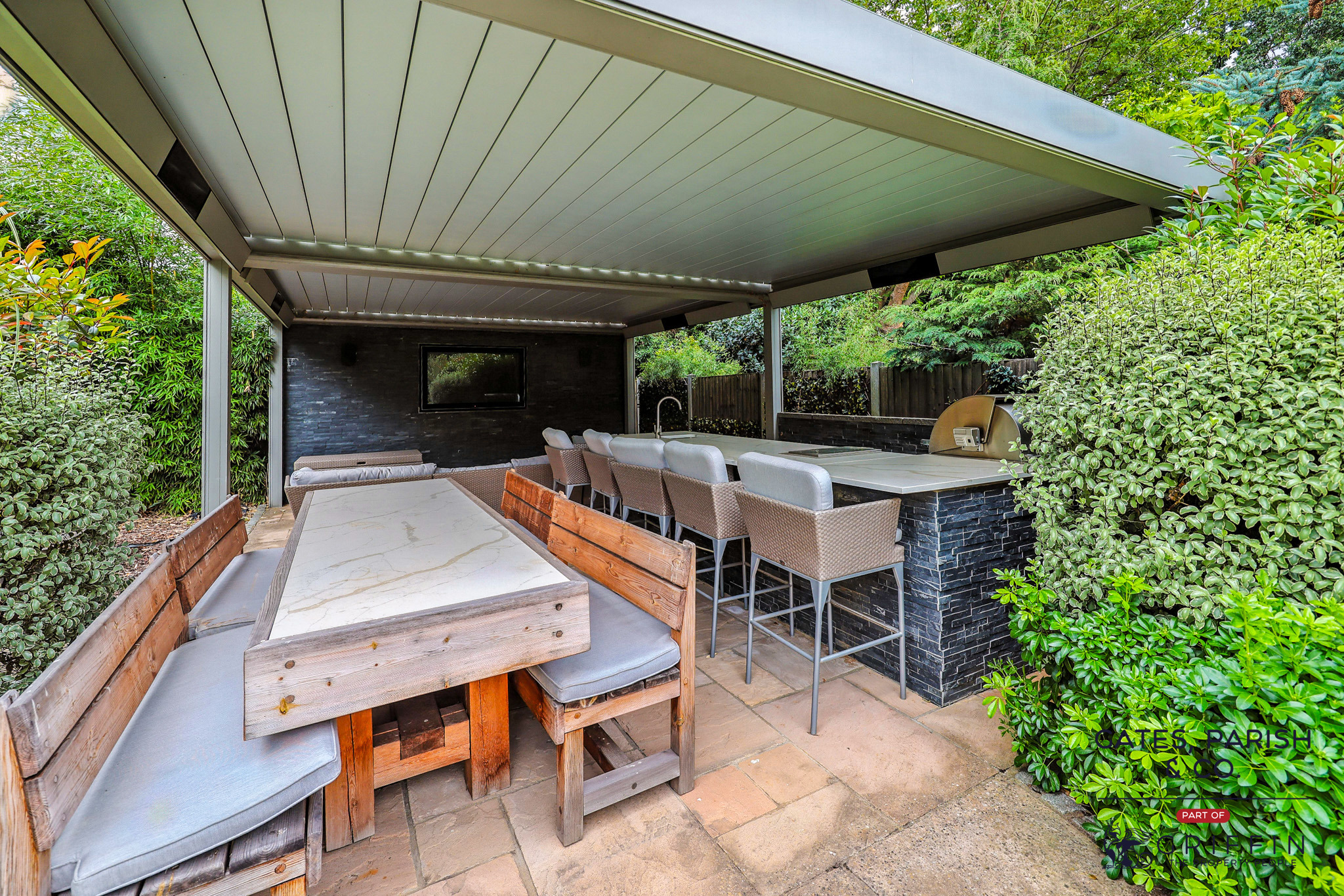 Every aspect of the home has been curated for comfort and sophistication, with features such as underfloor heating, mood lighting, and integrated music systems throughout. Externally, Heywood House offers a secure and private environment, accessed via a gated entrance that leads to a carriage driveway with ample parking. A Crestron Home Management system ensures peace of mind with video entry and comprehensive security alarms. The landscaped gardens are a true sanctuary, equipped with an irrigation system, zoned outdoor music, and lighting to create a vibrant yet ambient atmosphere. A generous Indian sandstone sun terrace, children?s play area, and a professionally designed putting green further enhance the outdoor experience. The entertainment space is completed with a state-of-the-art outdoor kitchen, integrated BBQ, dining and lounging zones, a wall-mounted TV, and a modern pergola with retractable roof and blinds, complete with built-in heating?creating an al fresco home cinema experience that can be enjoyed all year round.