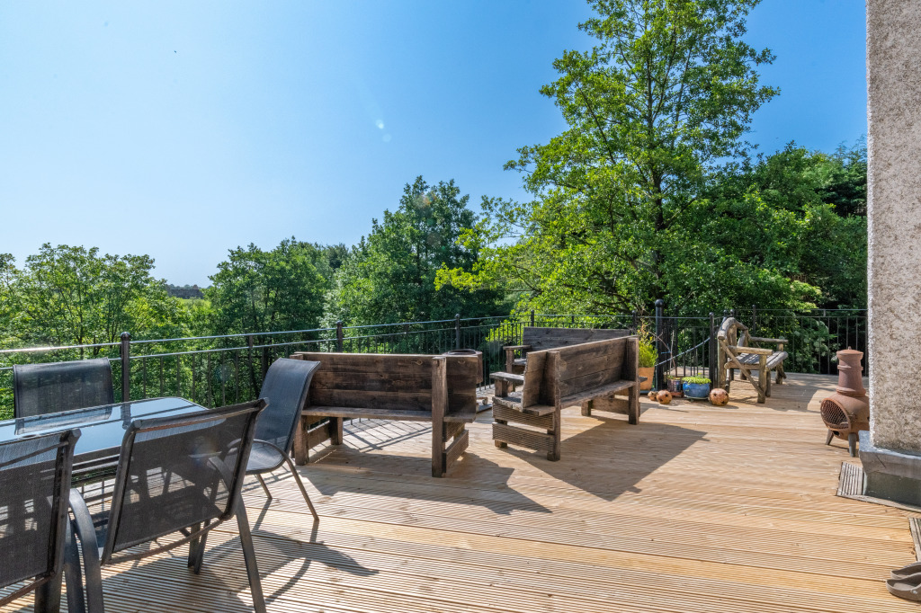 The garden itself is a truly remarkable feature, predominantly laid to lawn and enclosed by established hedging and mature trees that provide privacy and a tranquil setting. A generous balcony which covers two side of the property offers attractive seating, perfect for enjoying the outdoors while overlooking the expansive garden. There is plenty of space for additional seating throughout the grounds which also has a pleasant stream running through. There is a bunk house providing additional accommodation and a splendid hot tub room with views over the garden and beyond. The property also benefits from a garage, car port and a driveway providing ample parking and ease of access.