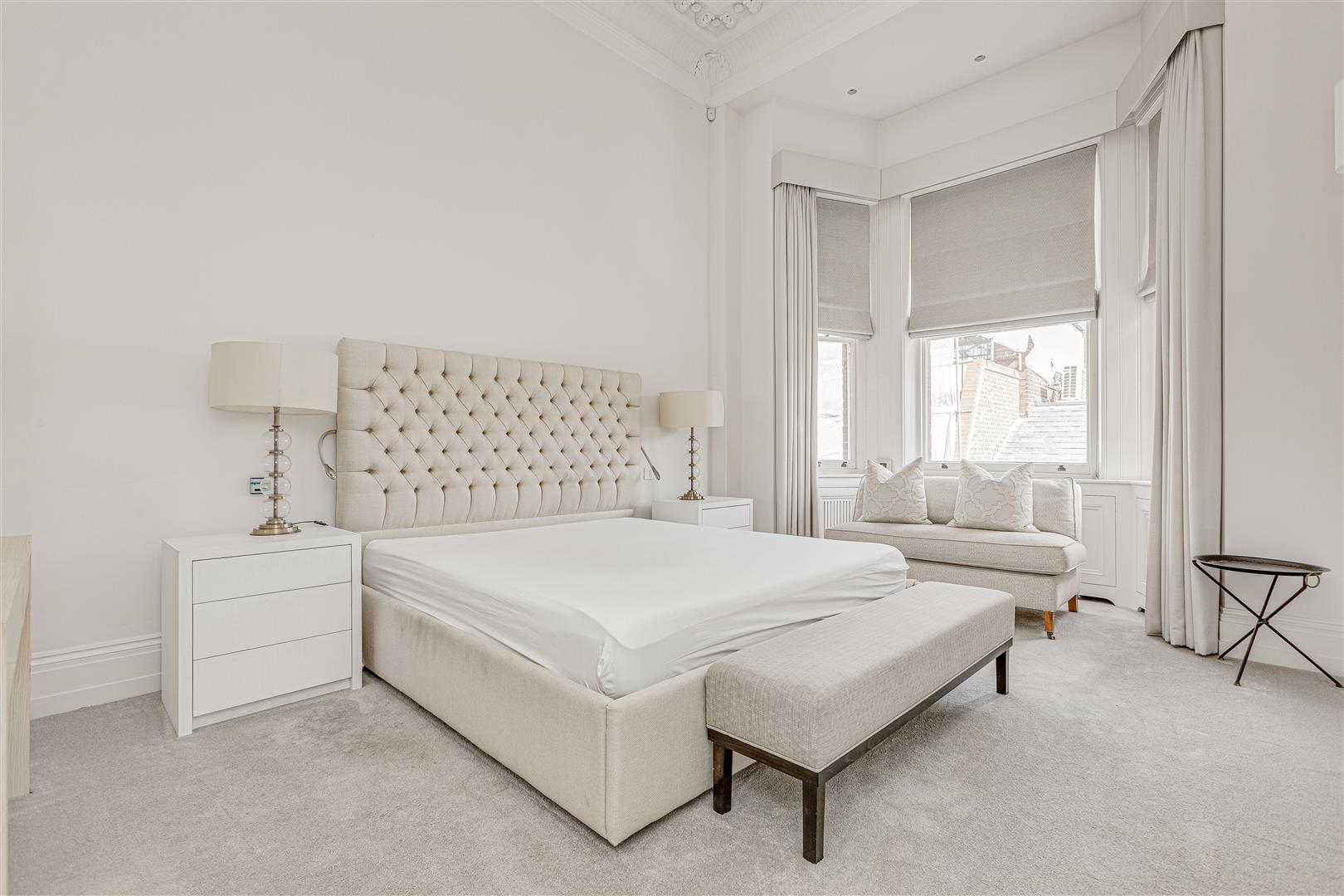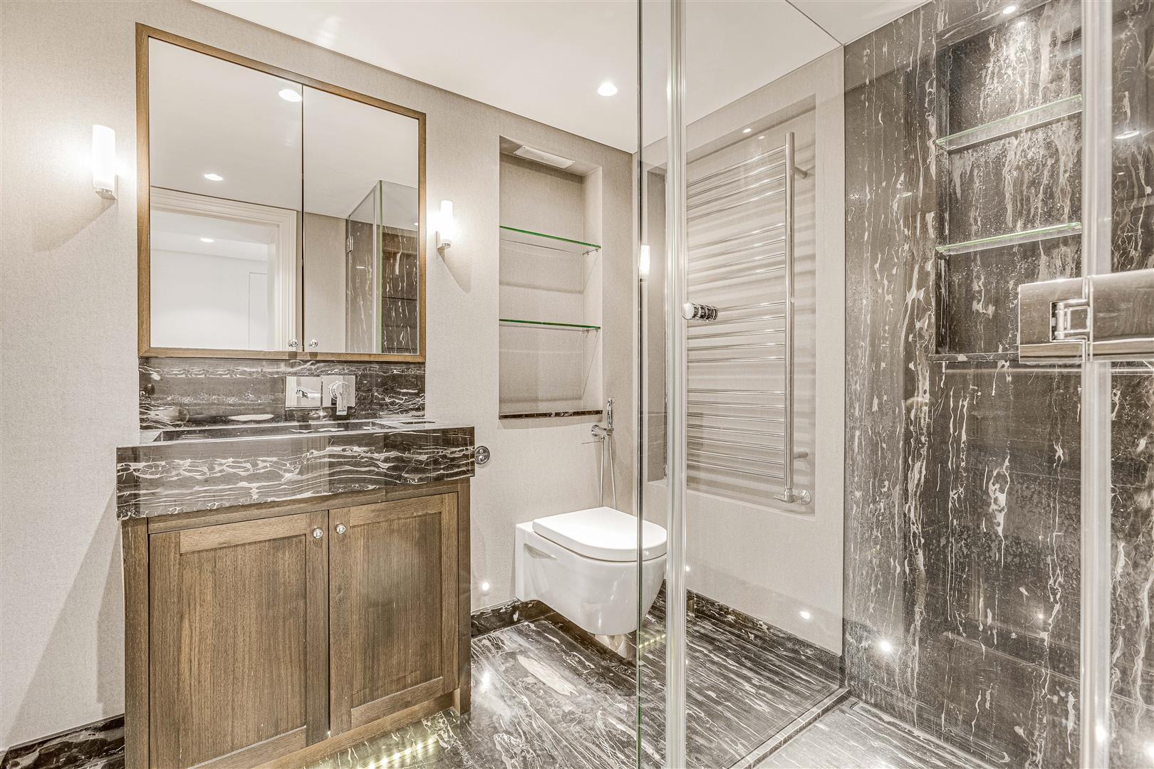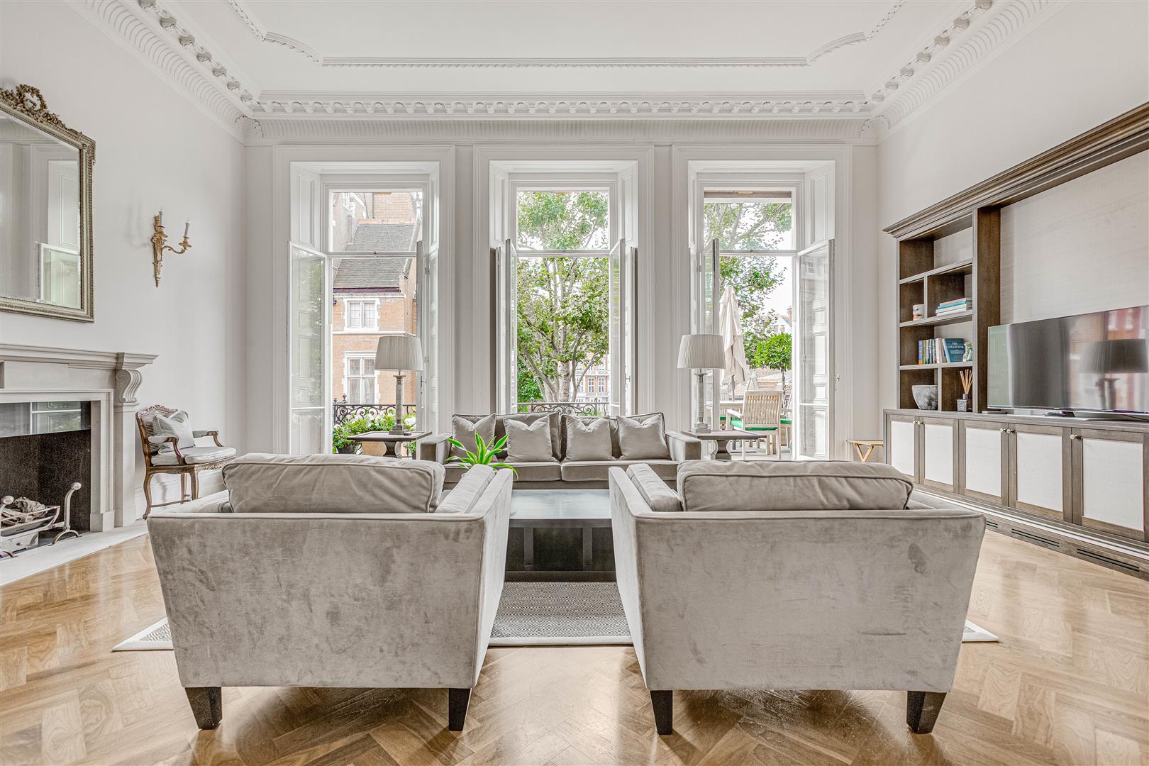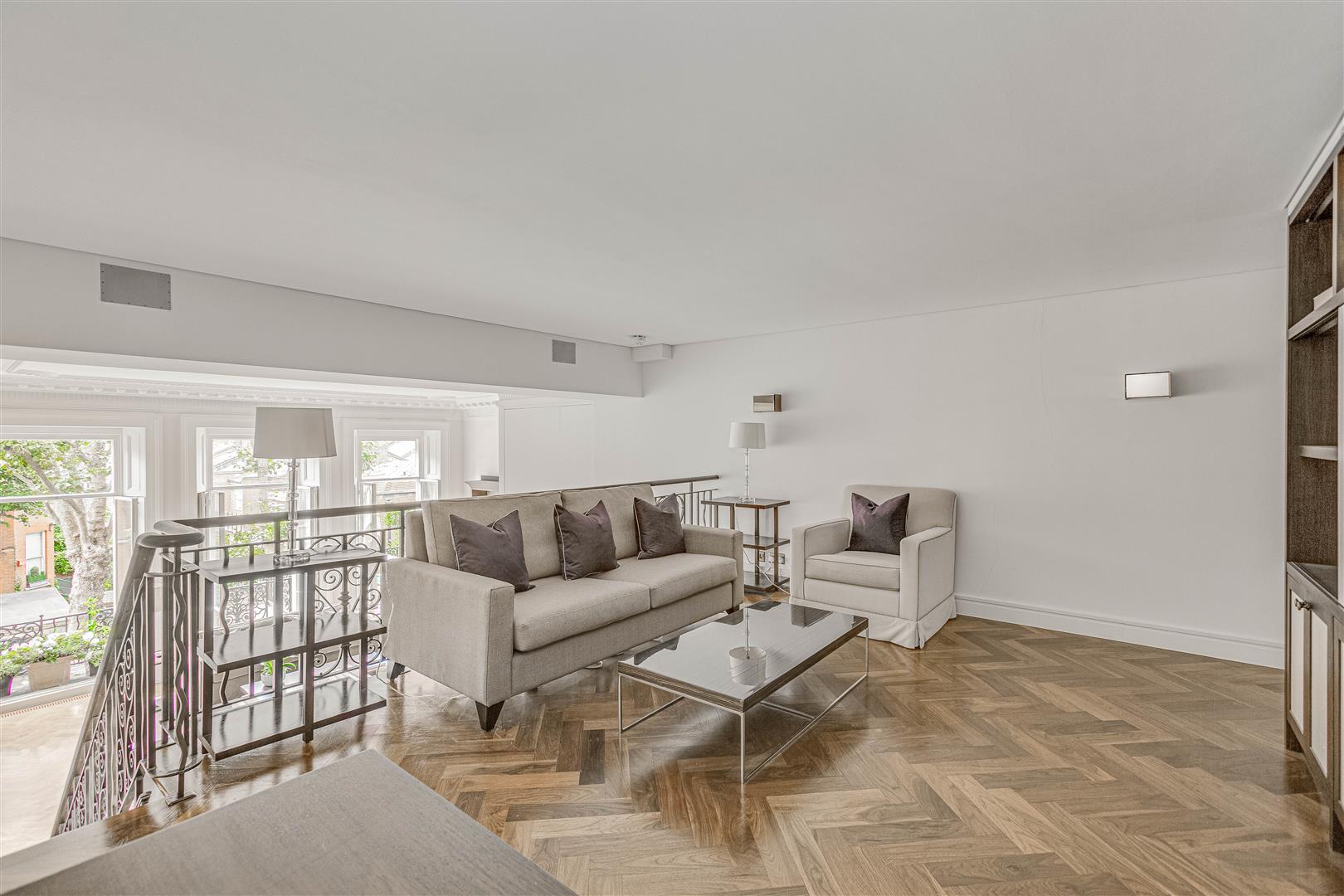 The apartment features a spacious layout, including an elegant reception room with floor-to-ceiling French doors that open onto a west-facing terrace. A stylish mezzanine adds character and creates additional living or office space. The sleek kitchen boasts minimalist cabinetry and a marble breakfast bar, providing a refined and functional space. The master bedroom is complemented by a walk-in wardrobe and luxurious en-suite bathroom, while the generous second bedroom retains its original fireplace and offers built-in storage. The third bedroom, accessed via the mezzanine, also boasts en-suite shower room and built in wardrobes.