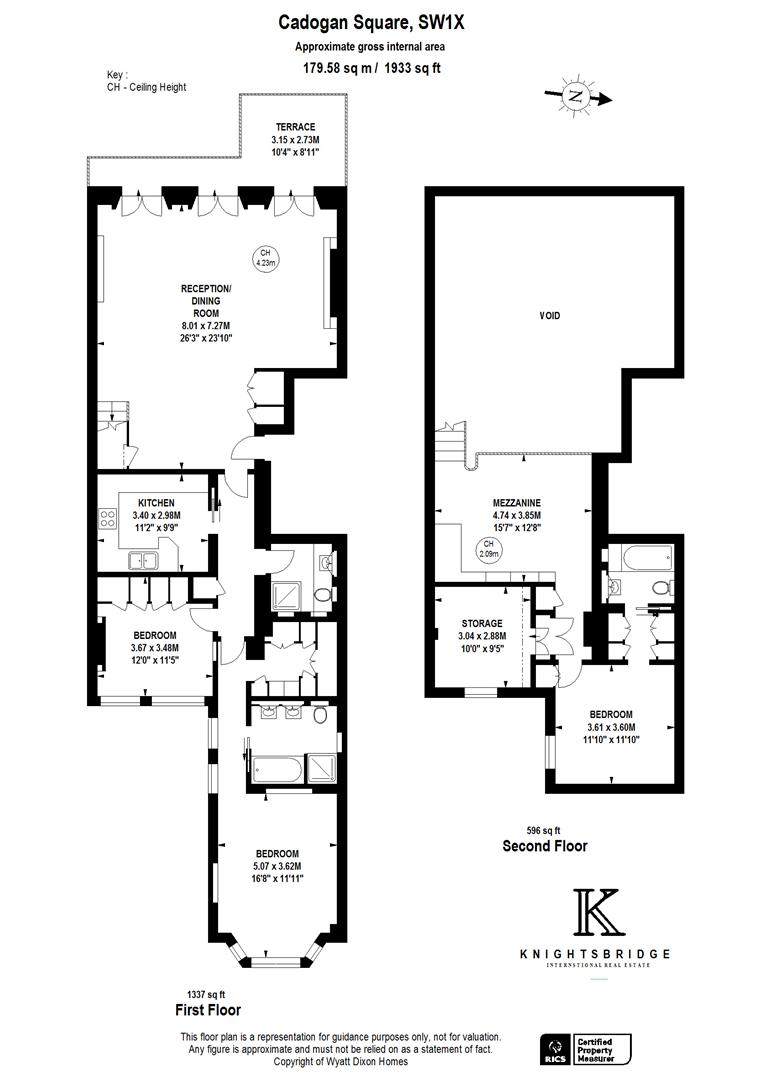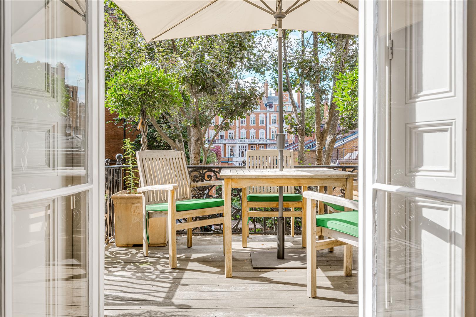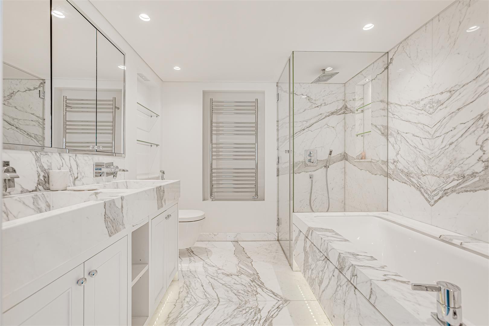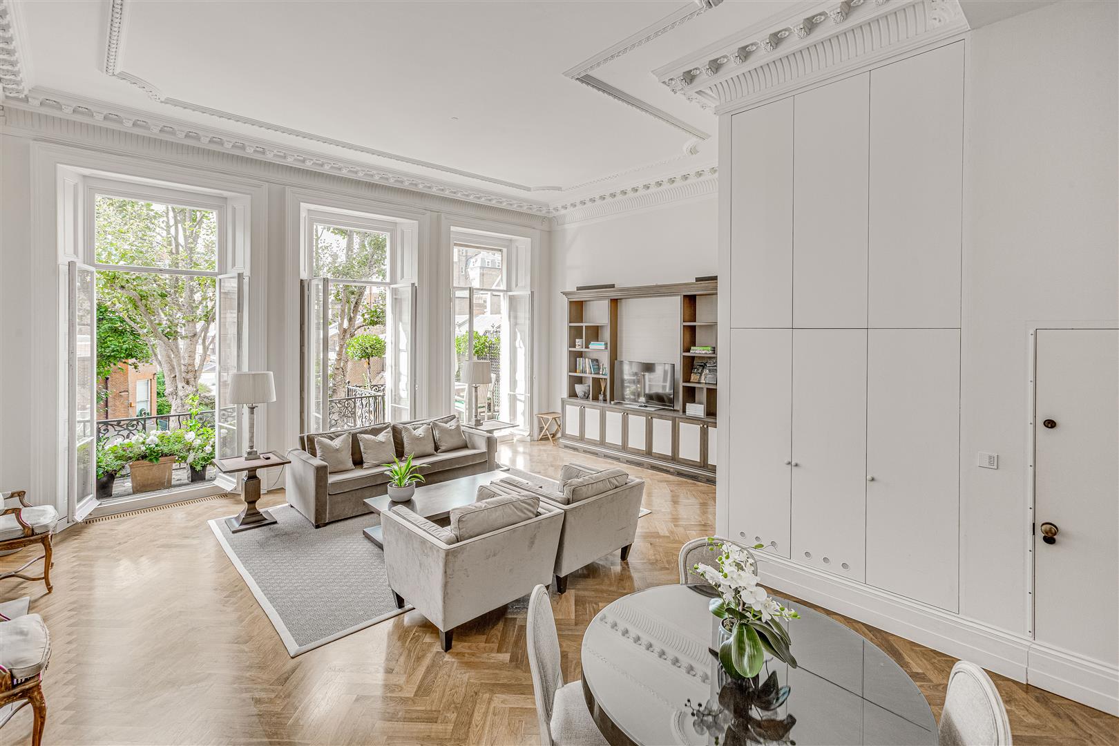 The apartment features a spacious layout, including an elegant reception room with floor-to-ceiling French doors that open onto a west-facing terrace. A stylish mezzanine adds character and creates additional living or office space. The sleek kitchen boasts minimalist cabinetry and a marble breakfast bar, providing a refined and functional space. The master bedroom is complemented by a walk-in wardrobe and luxurious en-suite bathroom, while the generous second bedroom retains its original fireplace and offers built-in storage. The third bedroom, accessed via the mezzanine, also boasts en-suite shower room and built in wardrobes.