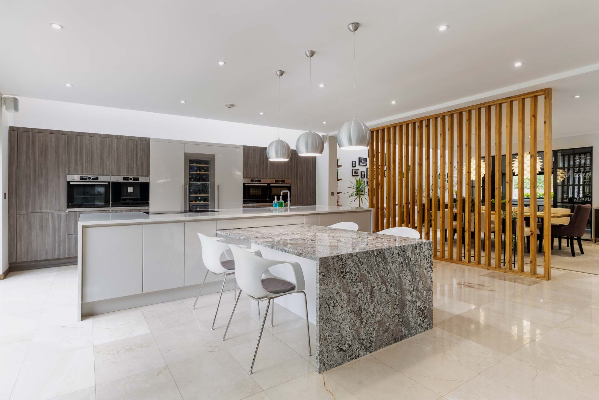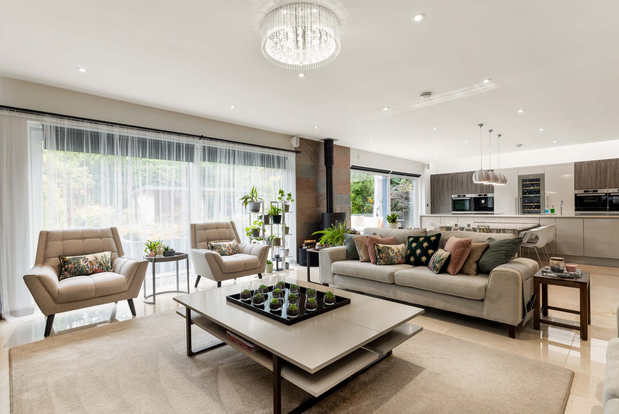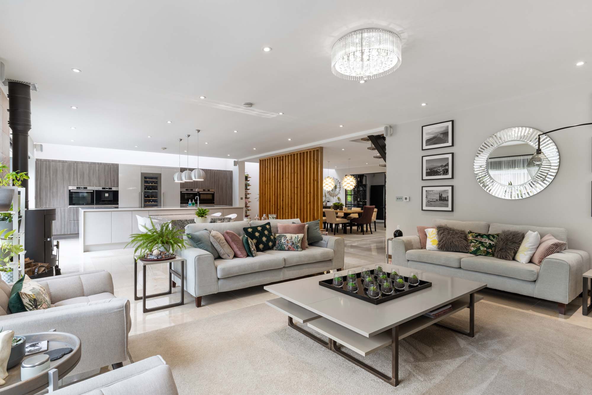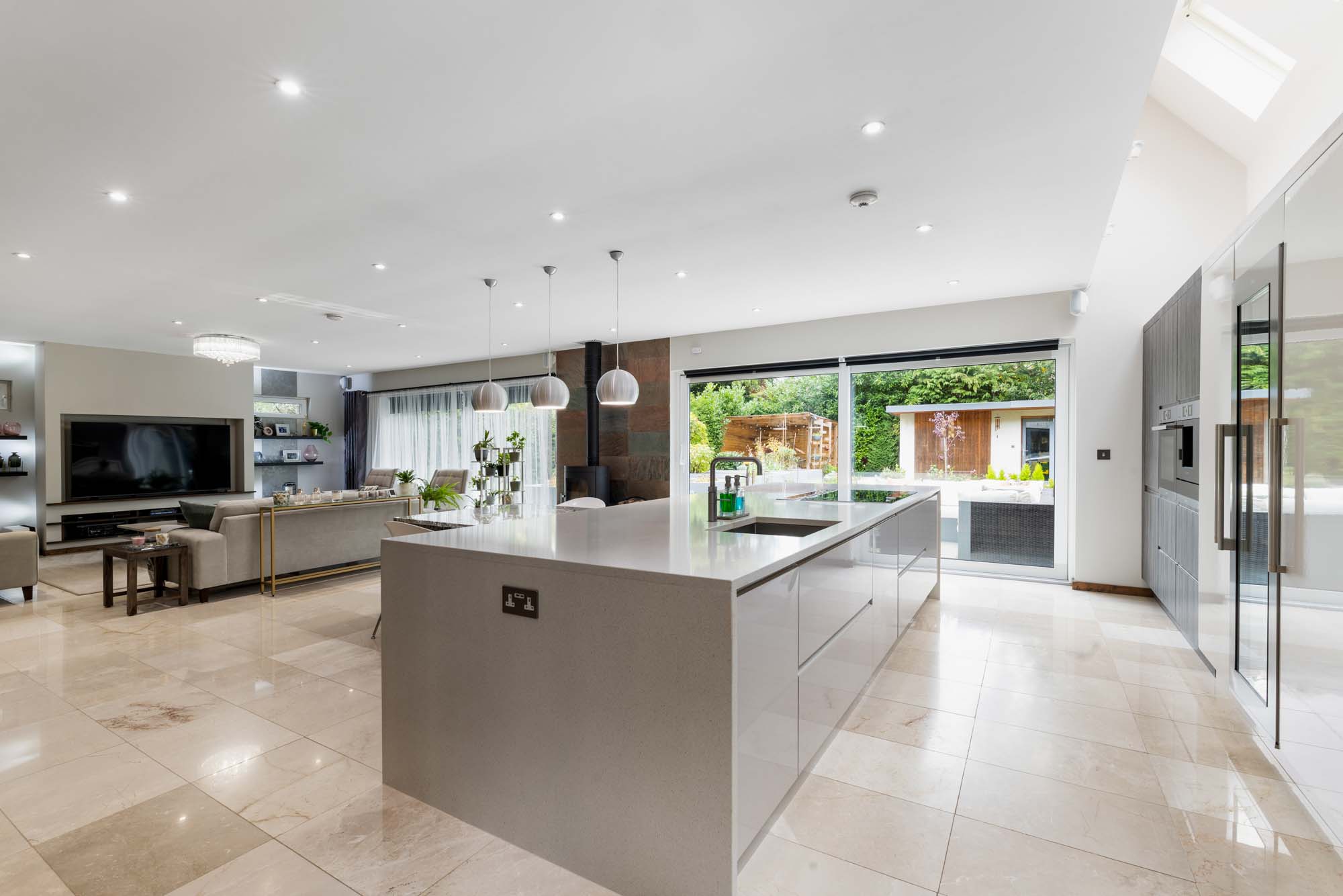 A vast and bright, open plan kitchen, dining and living area perfect for entertaining and family living, featuring a large kitchen with ample storage, a utility room, and multiple reception areas including a gym/games room and an office.