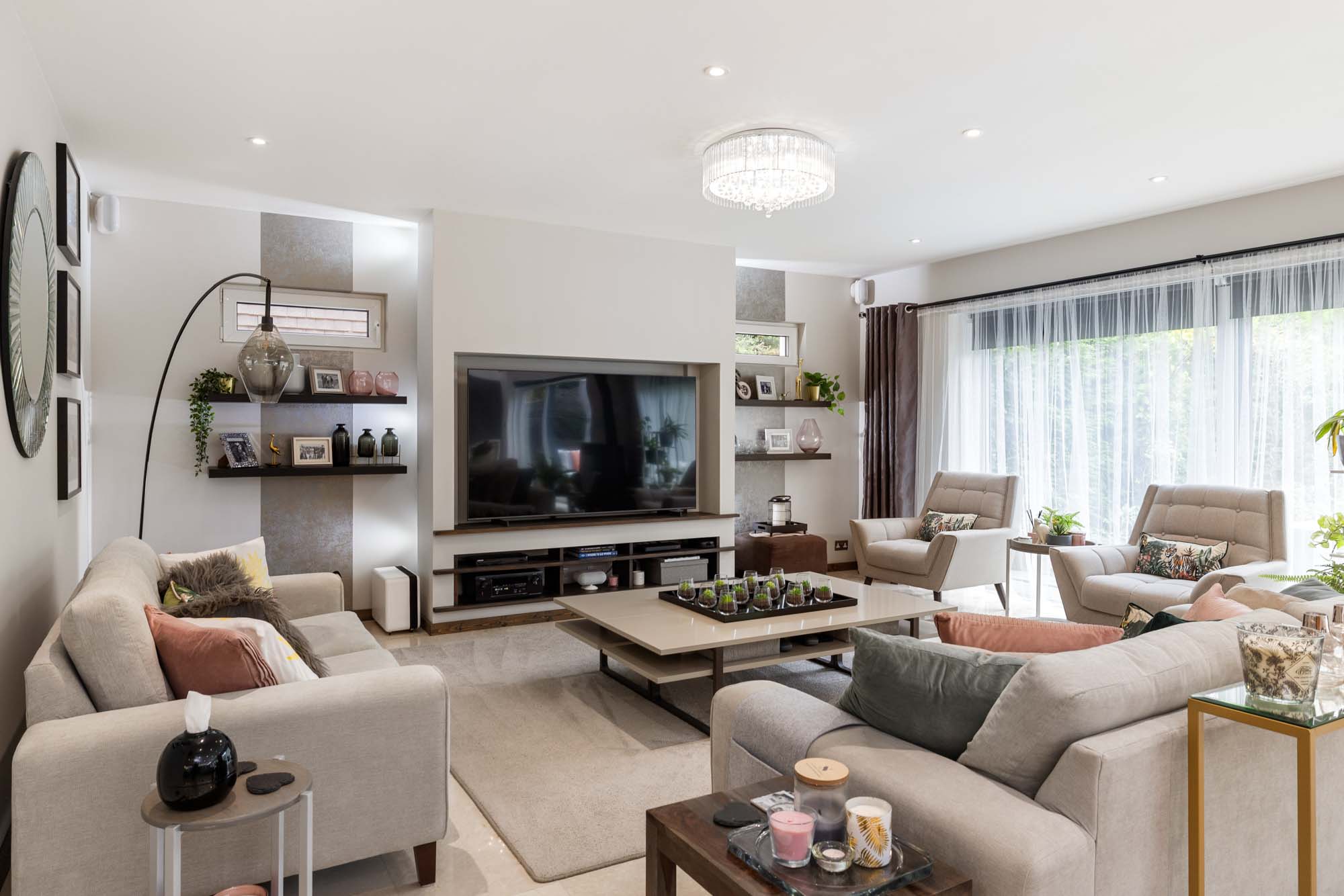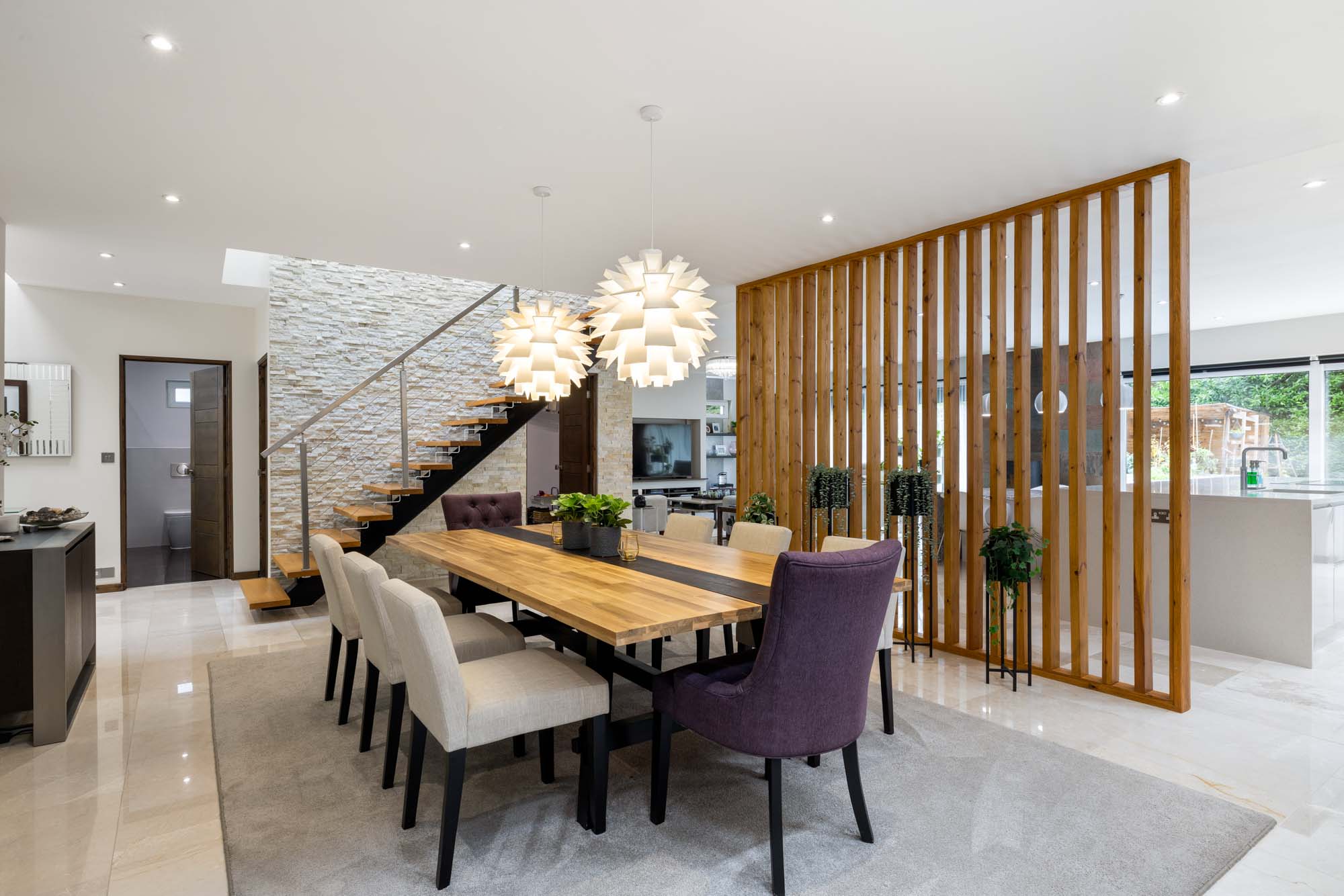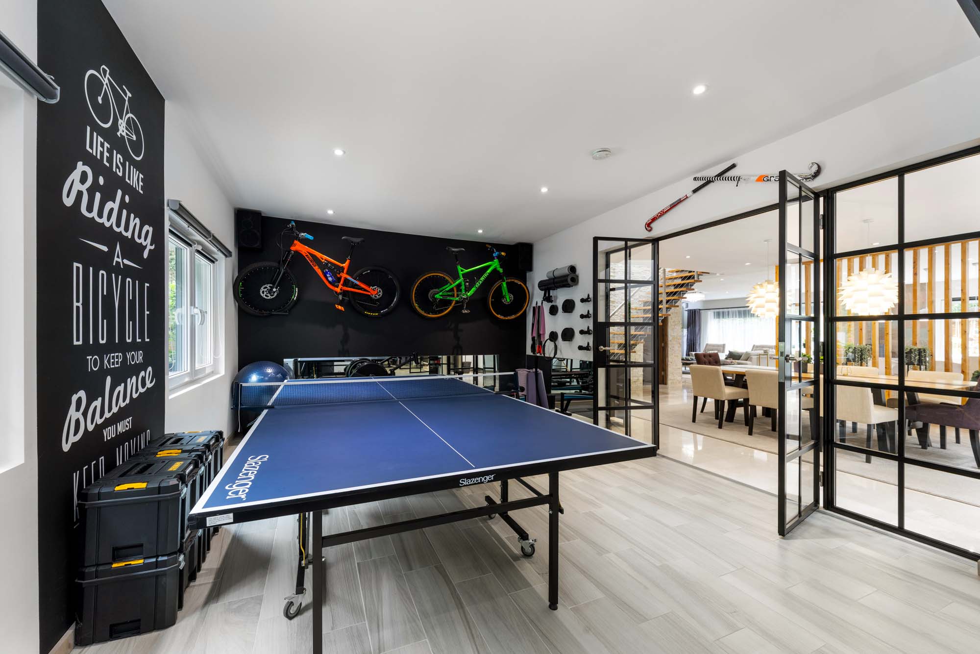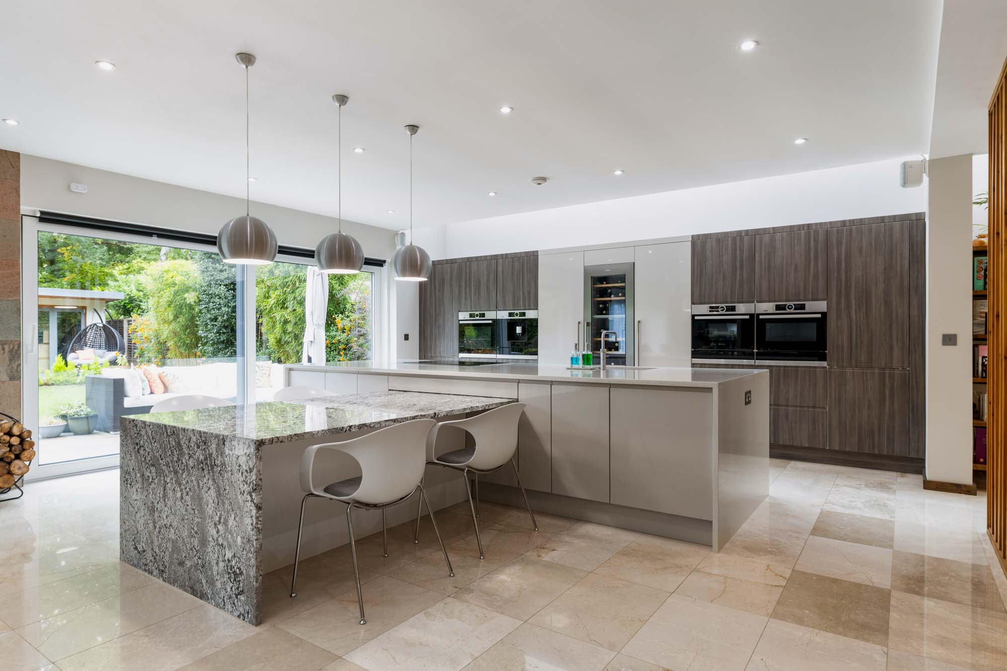 A vast and bright, open plan kitchen, dining and living area perfect for entertaining and family living, featuring a large kitchen with ample storage, a utility room, and multiple reception areas including a gym/games room and an office.