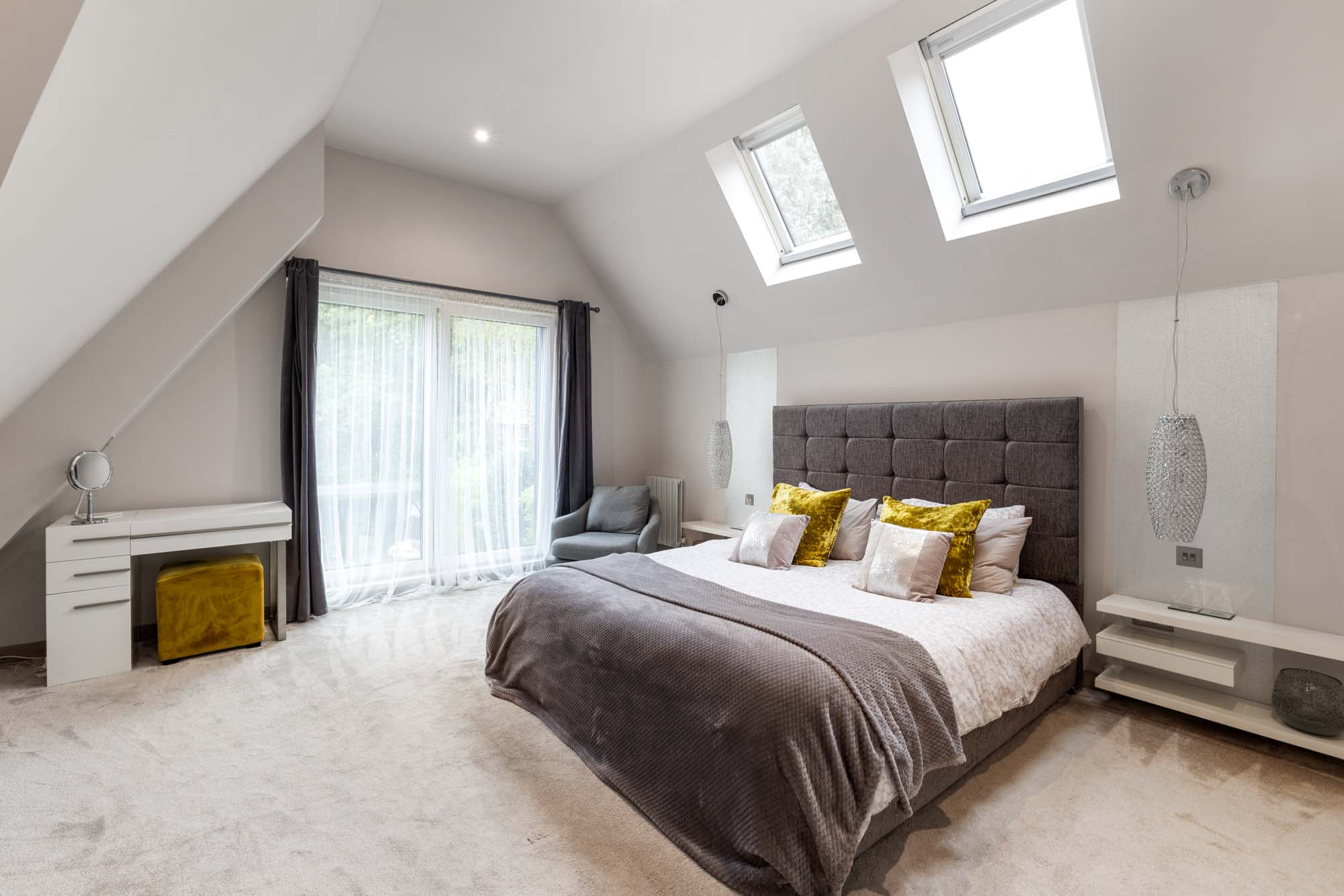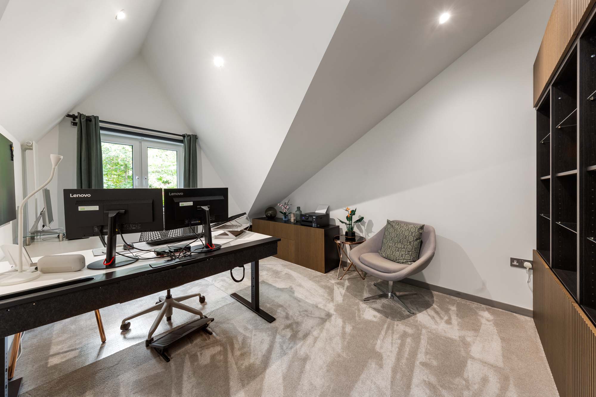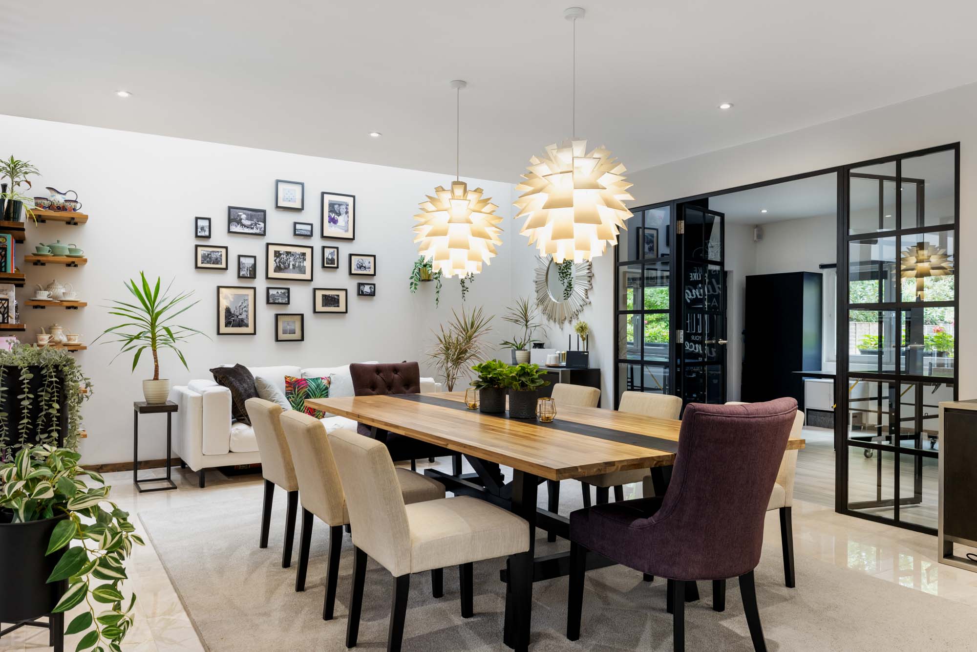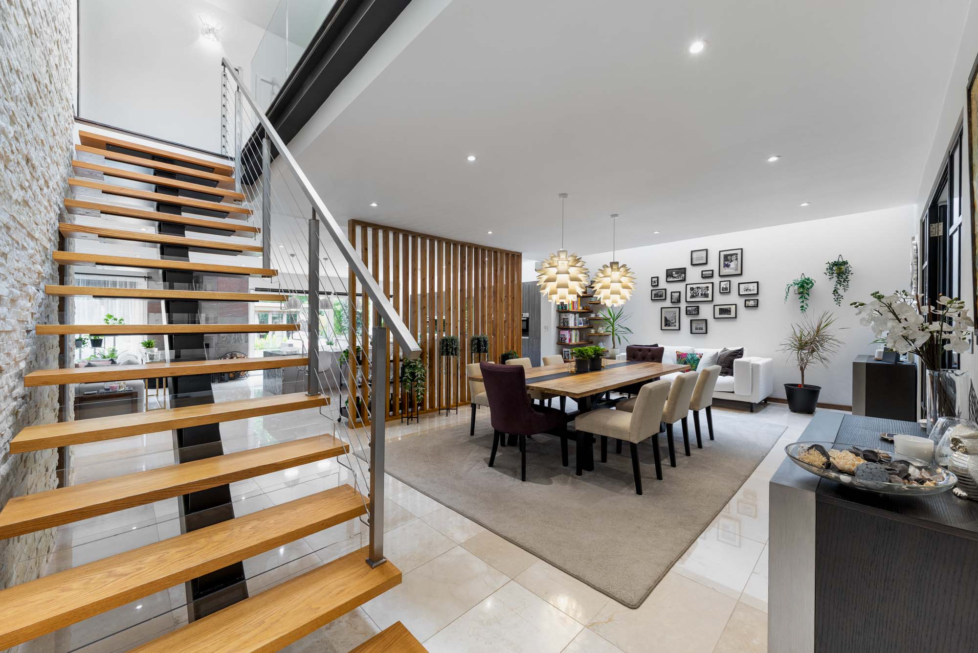 A vast and bright, open plan kitchen, dining and living area perfect for entertaining and family living, featuring a large kitchen with ample storage, a utility room, and multiple reception areas including a gym/games room and an office.