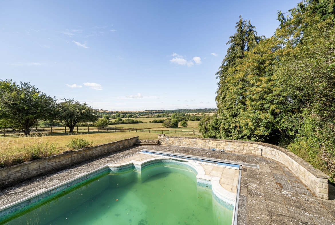 A particular highlight is the large private swimming pool, positioned to enjoy outstanding countryside views, making it perfect for both leisure and entertaining. The grounds feature a mix of formal gardens, a paddock, mature trees, and extensive driveway parking alongside the double garage.