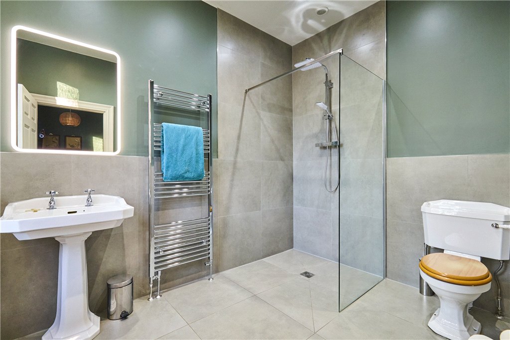 sliding patio doors that open onto the terrace. To this floor there is also a further utility room and cloak room. To the first floor of the main house, the beautiful return staircase leads to five double bedrooms, the master bedroom enjoying a large en-suite with modern walk in shower and underfloor heating, and a further large house family bathroom with separate bath and walk in shower – a luxurious space. There is a further sixth bedroom, shower room and lounge above the garage the former coach house and accessed via the rear door, which is ideal annex accommodation for a nanny or a relative, providing a separate private space.