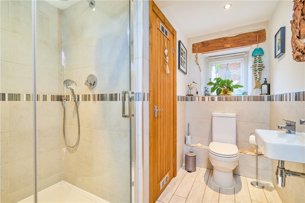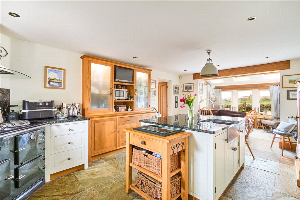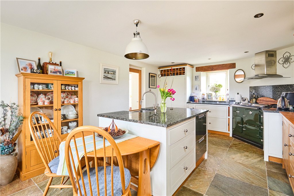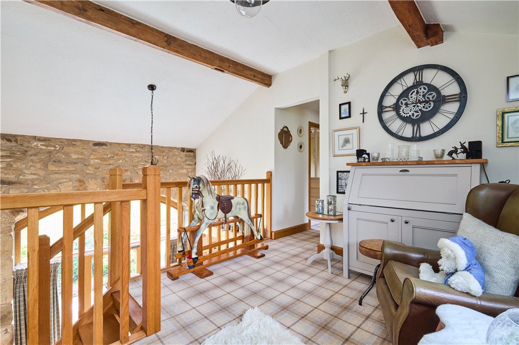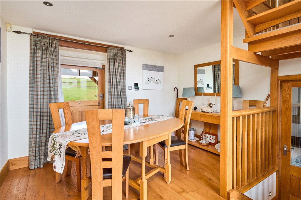 The accommodation in brief includes to the ground floor a welcoming entrance hall with access to a useful utility and rear boot room. The entrance hall leads to characterful living kitchen featuring a central island and hand-built units, and being open to a snug area with wood burning stove, fantastic views and access to the outdoor seating area. Beyond the kitchen is a large dining hall with feature window within the old barn opening. There is also a modern fitted shower room and guest WC to this level. Steps lead down to the spacious formal sitting room with exposed beams and feature fireplace, also providing access to a garden room which could be used for a number of purposes, whilst also having its own access to the gardens.