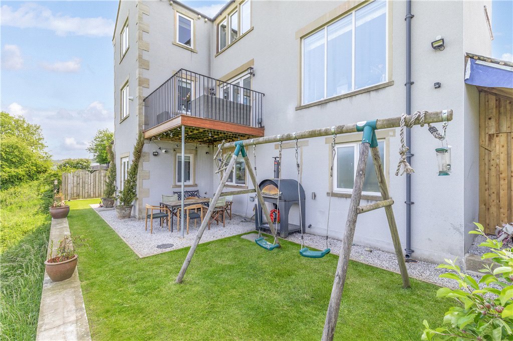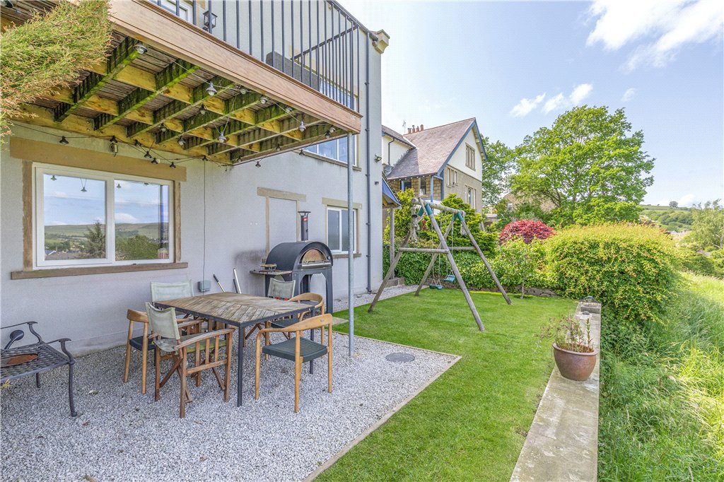 Externally, Gravelled driveway with parking for two cars and storage in a part garage to the front with a single access doorway. To the side of the house is a lawned area runs down from ground floor level to lower ground floor level and a staircase leads to the doorway to side of the garage. A small lawn to back with small play area with a Ha-ha looks over a recreational area of Cononley, bike storage space to the side.