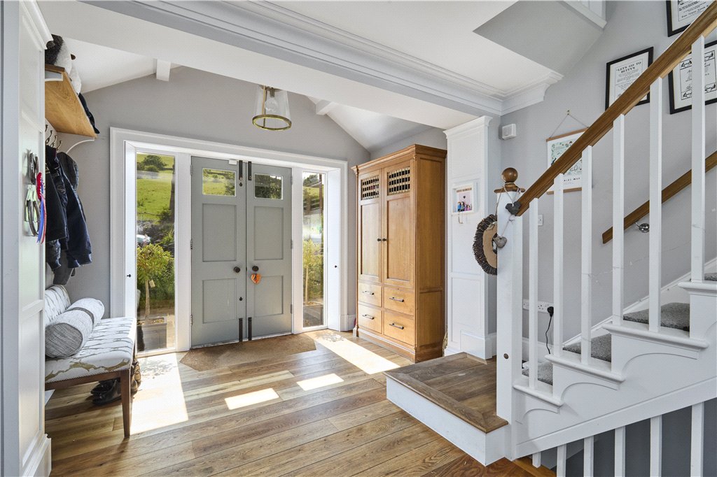 Through the front door into a spacious hallway with a staircase leading to the first floor, staircase leading to the lower ground floor, wooden flooring, a cloaks area, along with a stable door and window to the side.