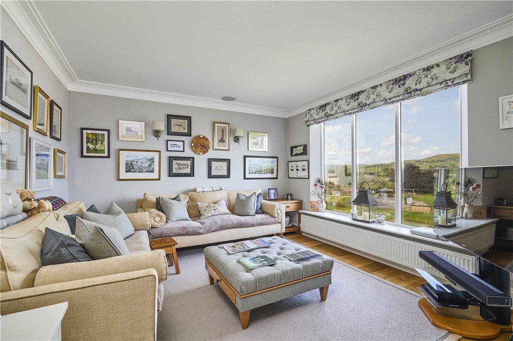 The kitchen is fitted with 'Secret Drawer' wall, drawer and base units along with hideaway cupboards. The Miele appliances include an integrated fridge, dishwasher, Gas and electric Aga, a double Belfast sink, a Quooker boiling tap, integrated wine cooler, integrated coffee machine and integrated bin store. A central Island consists of a prep sink with a marble top and cupboards. There is booth seating area with table and a window to the side. The lounge with Chesneys wood burning stove, decorative fireplace, BI folding doors leading out the balcony with wooden deck panels and a wrought iron balustrade this opens to the dining room, both giving the best of views. The lounge with wood burning stove, decorative fireplace, BI folding doors leading out the balcony with wooden deck panels and a wrought iron balustrade this opens to the dining room, both giving the best of views.