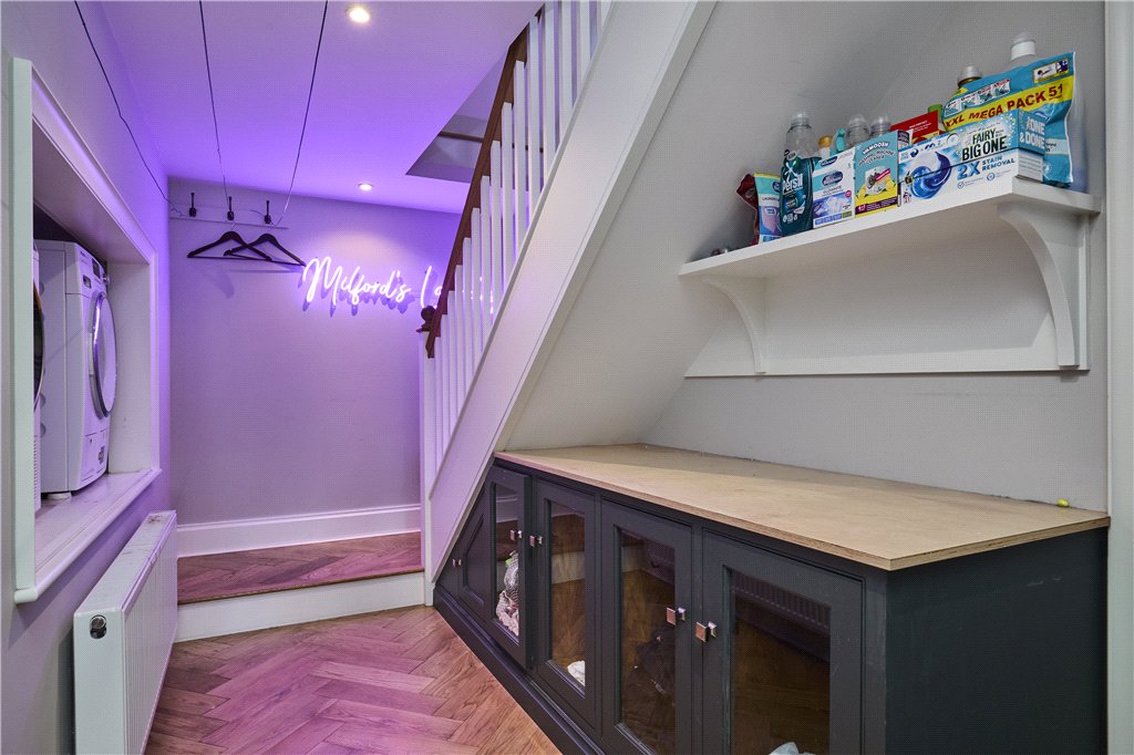 From the hall on the ground floor a corridor leads to the sitting/playroom and extends through into the cloaks and downstairs w.c. The cloakroom with Belfast sink with storage underneath. stretches through to a w.c. with concealed cistern, hand wash basin and vanity unit.