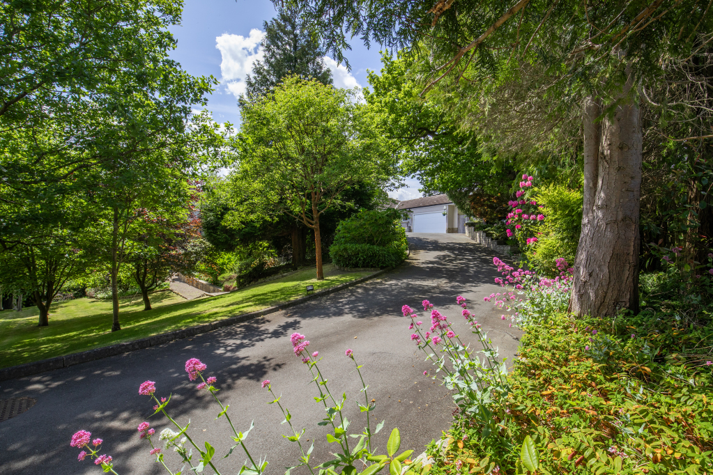 tarmacadam driveway which leads to an expansive turning area with a double garage to one side. There are lower level lawned gardens which form a sheltered play/amenity area; whilst to the southern elevation there is a fantastic terrace with multiple dining and seating areas, some cracking views and strategic planting.