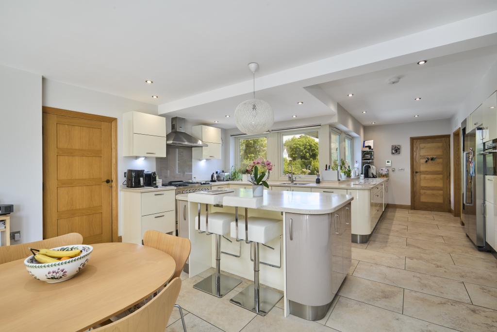 broad square bay having French doors to the Terrace;dual-aspect Dining Room, again generously sized and with direct Terrace access; Living Kitchen – comprising preparation, dining and seating areas, the former fitted with a comprehensive range of eye level and base storage cupboards as well as a substantial island unit. The seating area enjoys lovely views and immediate access onto the south facing Terrace – ideal for alfresco dining; Store Place, integral double garage access; Laundry and Boiler Room.