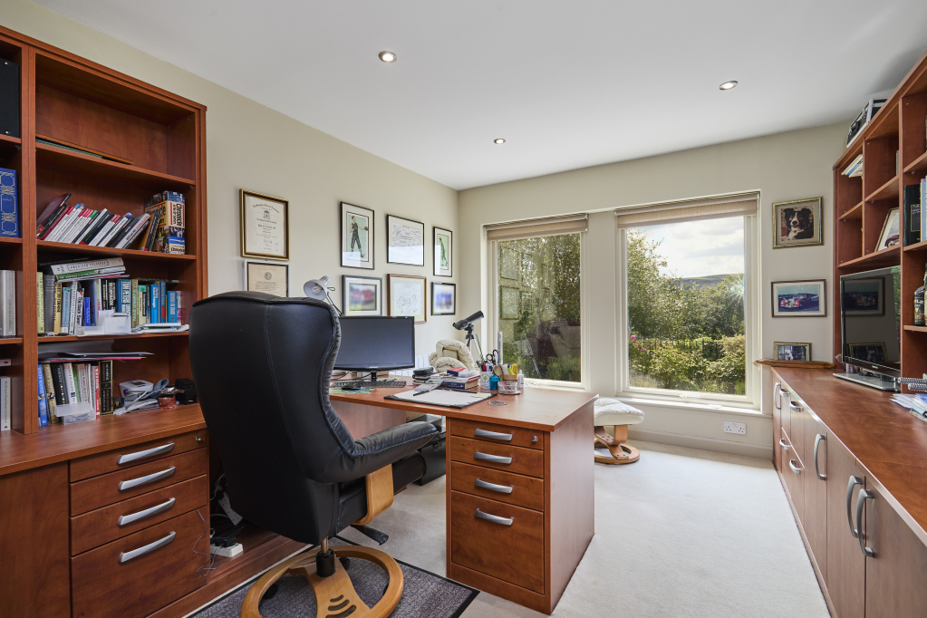 preparation, dining and seating areas; laundry facilities. Discreetly positioned study with fitted furniture and views to the south.