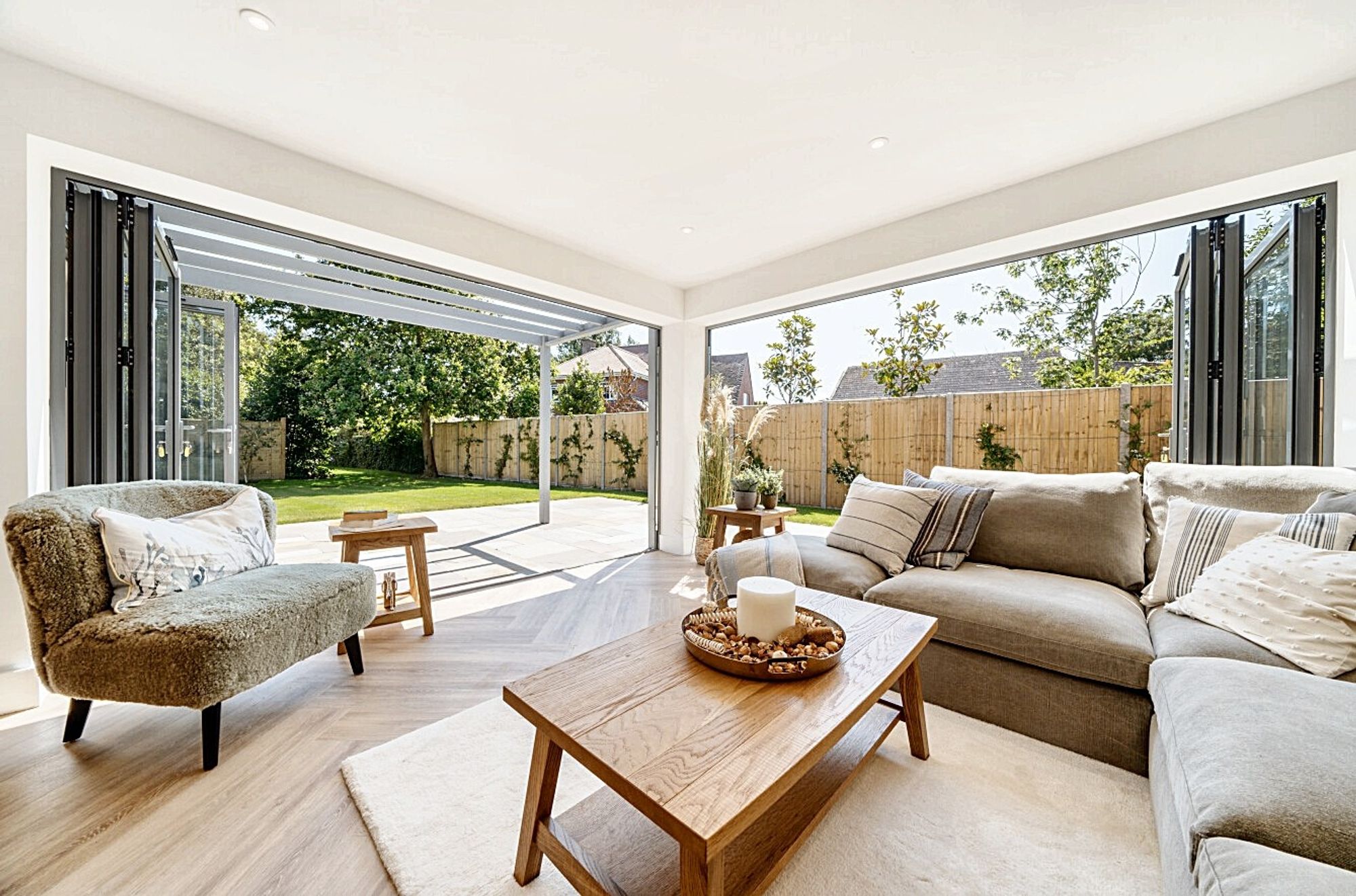 Enter the ground floor where Amtico flooring featuring a muted Oak Herringbone design and underfloor heating, create a backdrop of elegance. The open-plan kitchen/diner/lounge showcases the contemporary design, boasting a stylish kitchen with an island and breakfast bar highlighted by oak countertops and equipped with top-of-the-range appliances, including a Slate Rangemaster with induction hob, cooker hood, and American fridge freezer. Bifold doors seamlessly integrate indoor and outdoor spaces, while smart storage solutions, utility space, and a WC ensure convenience. A downstairs bedroom offers an en-suite bathroom with contemporary mirror and tiled flooring, which could be a versatile space for a bedroom, office or gym.