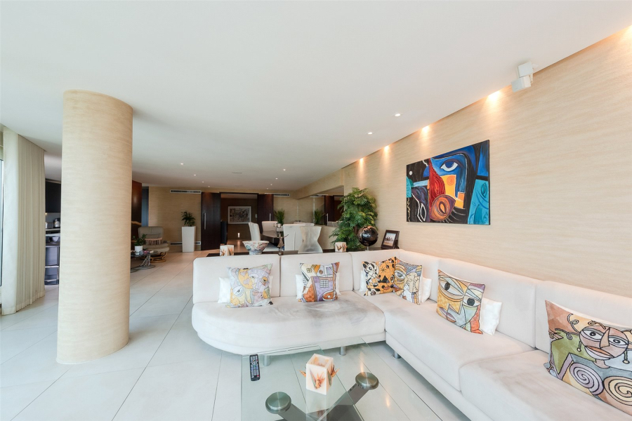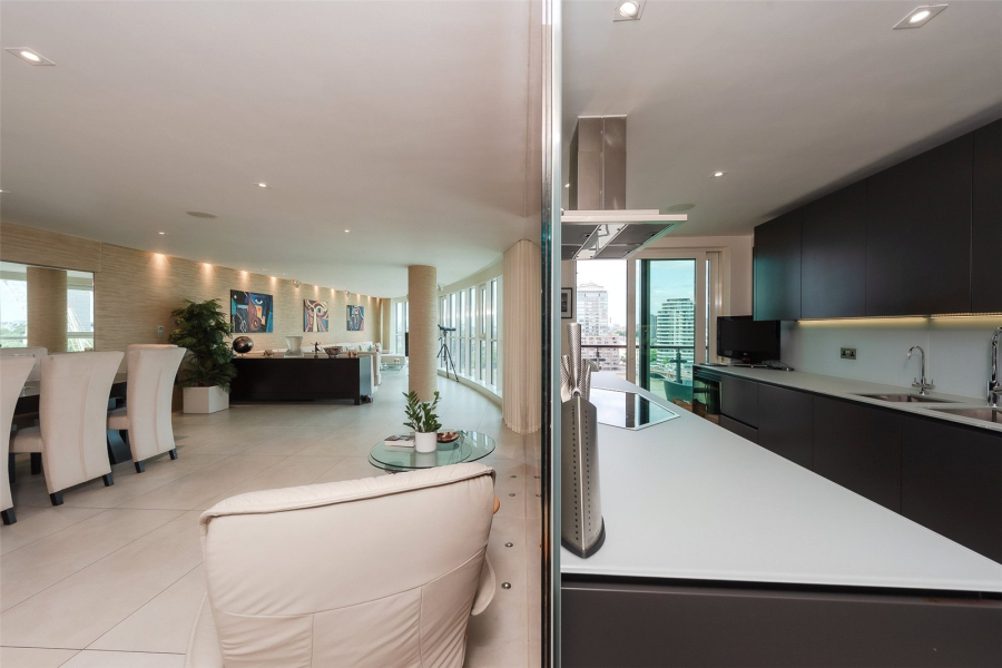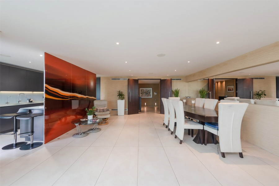 An impressive dining area that comfortably hosts a number of guests, a smart fitted kitchen with access to a private terrace is separated off by a stylish custom-made glass screen, and to the front of the apartment a more formal seating area enjoys fantastic views.