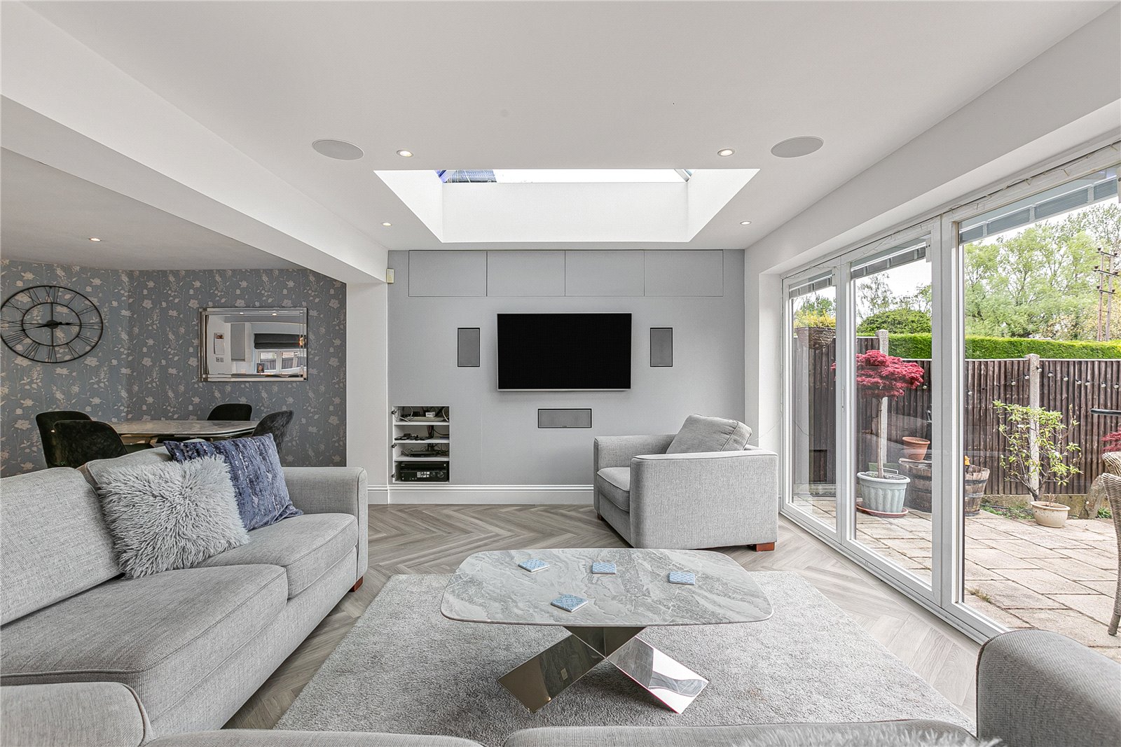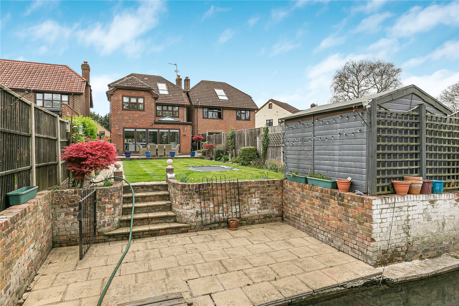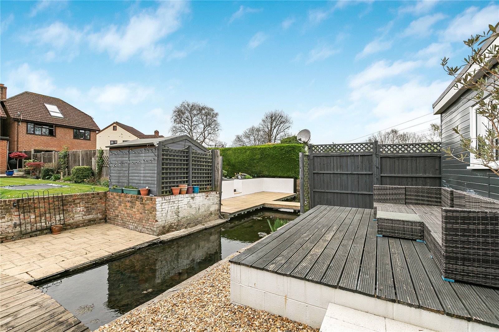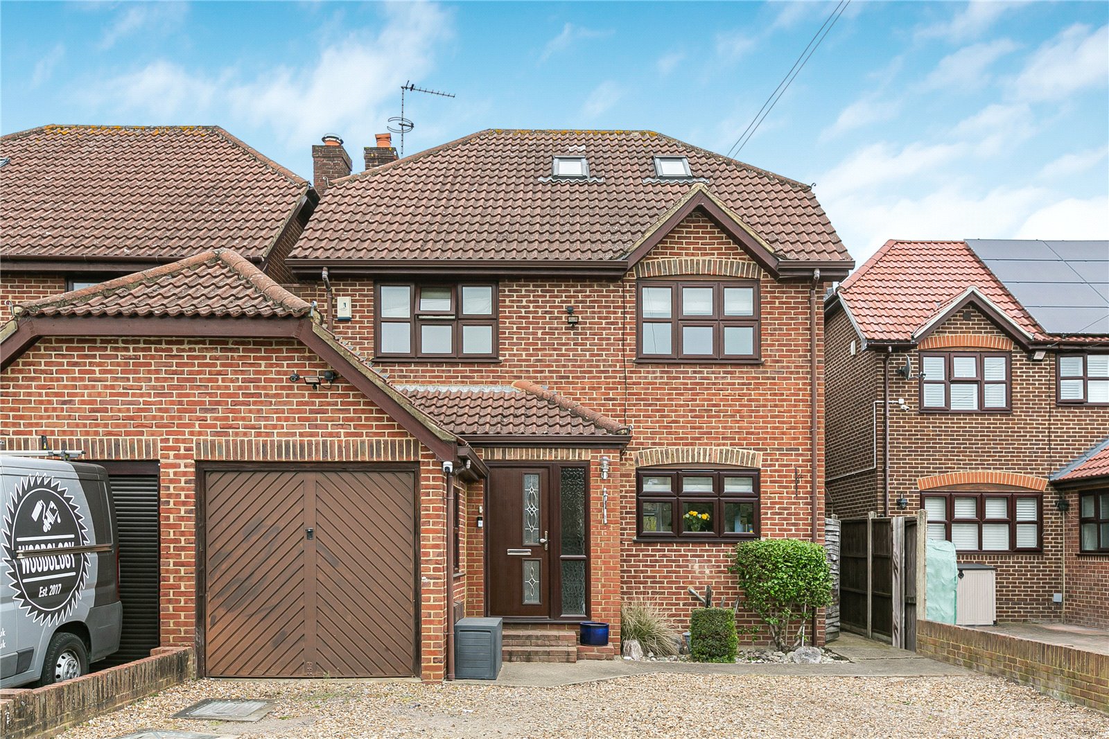 Externally, the property truly stands out with its large, well-maintained rear garden, uniquely enhanced by a charming running stream that creates a tranquil and picturesque setting. Additionally, there is a good-sized studio in the garden with electricity so this could be used as an office, gym or games room. To the front, the home benefits from a garage and ample off-street parking for multiple vehicles.