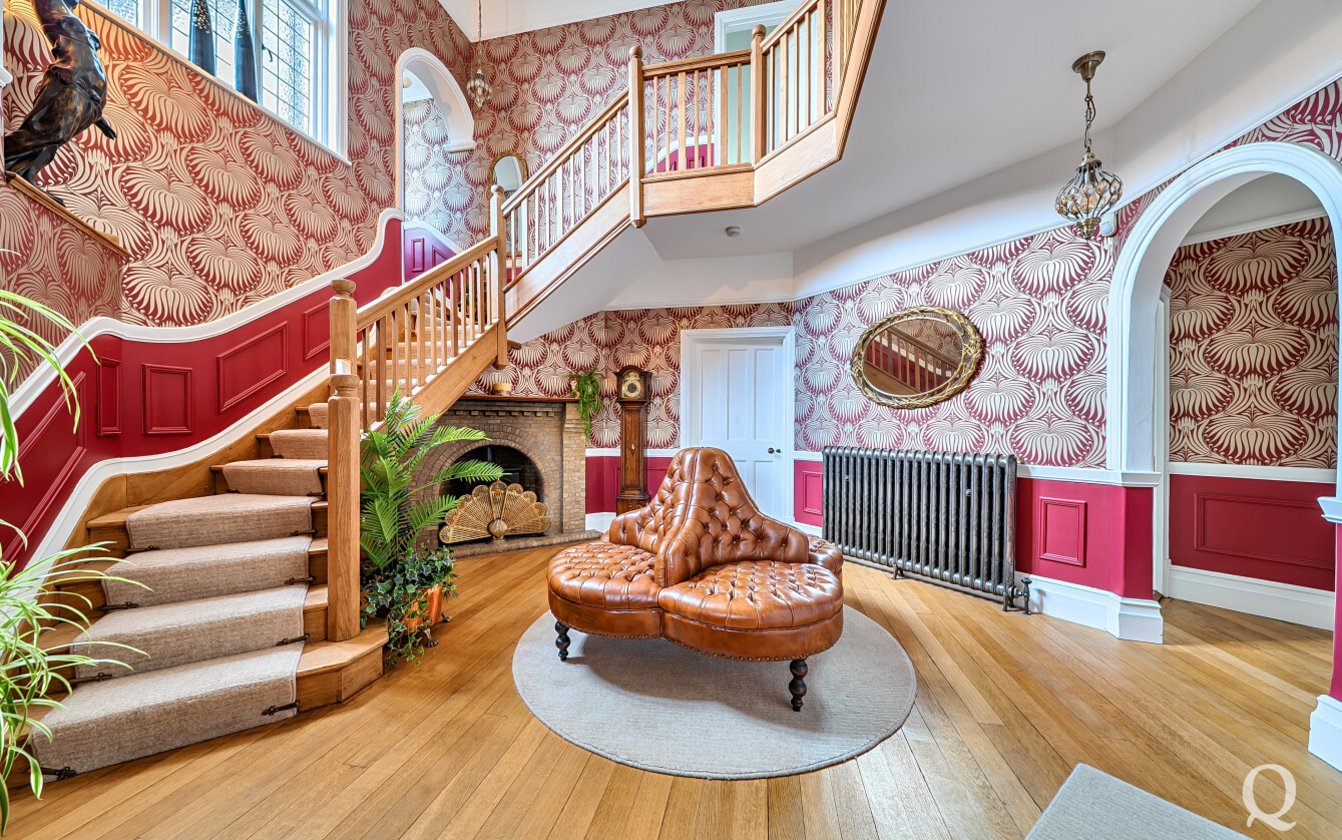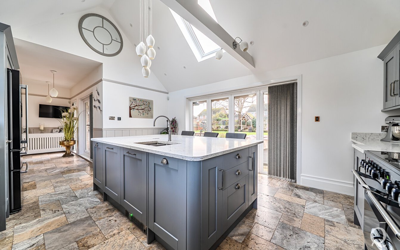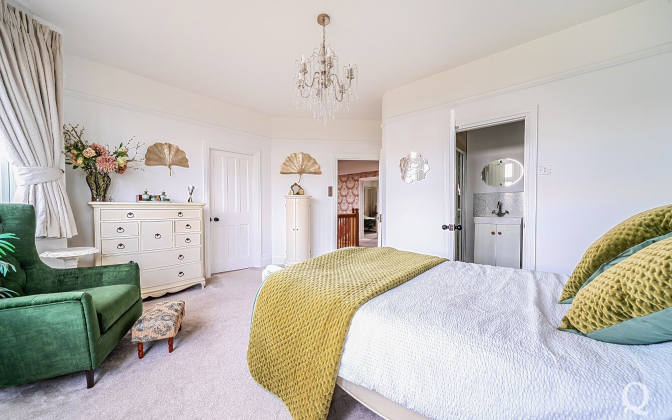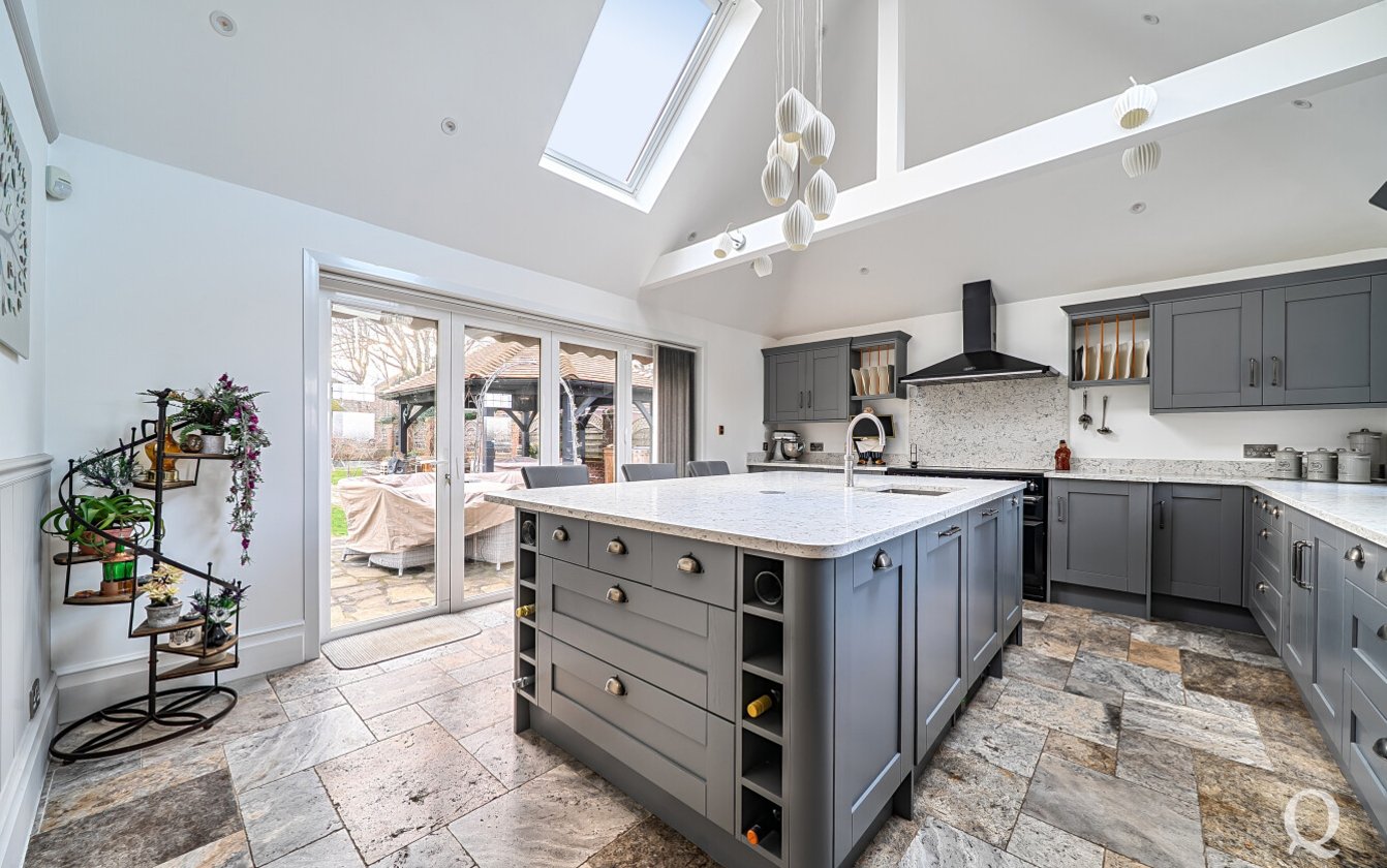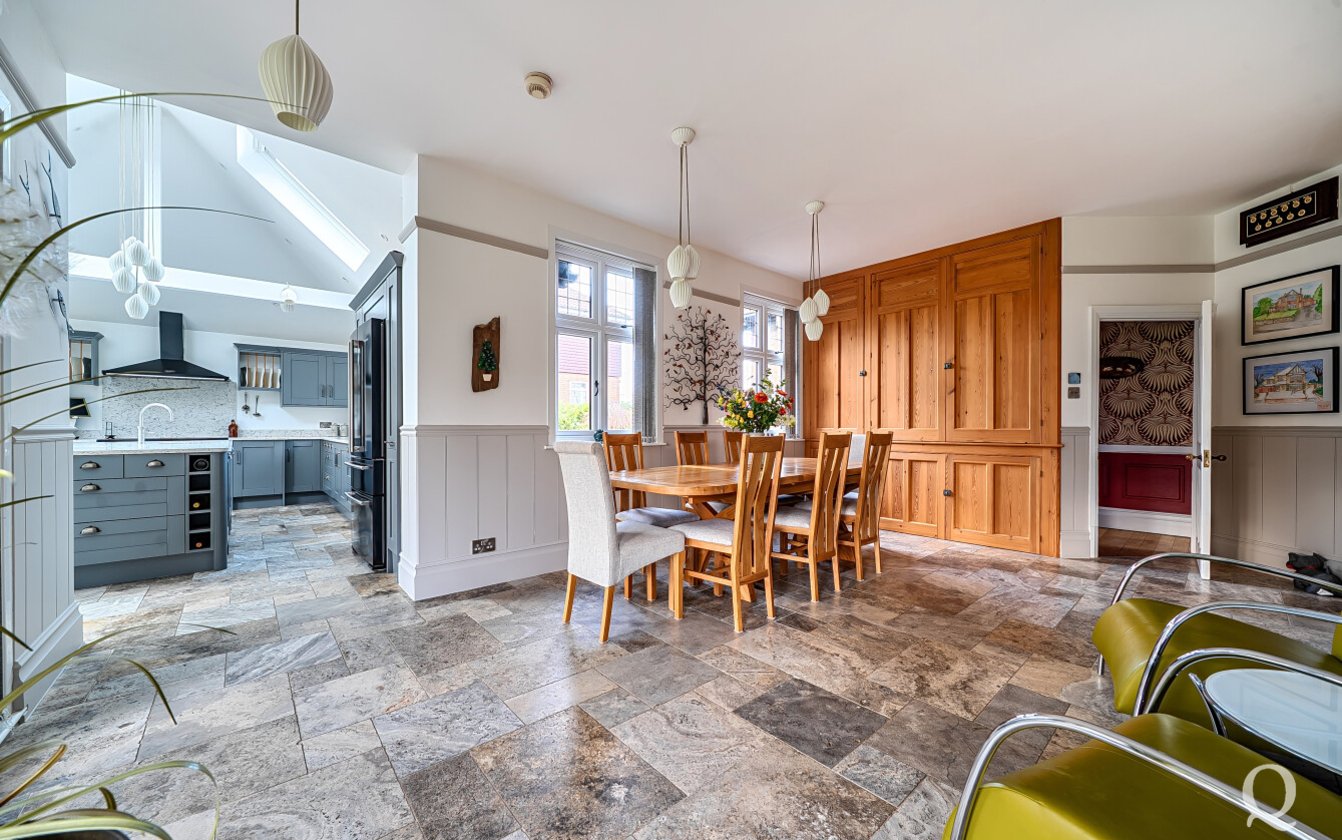 The property is approached through a large and impressive galleried entrance hall, setting the tone for the space and elegance found throughout. From here, a superb front reception room with a replacement wood burner enjoys a large bay window overlooking the frontage, while a separate dining room flows seamlessly into a fabulous modern kitchen, both of which benefit from electric underfloor heating. The kitchen also features solar powered Velux windows and bi-fold doors opening directly onto the rear garden – ideal for both family life and entertaining. A second reception room to the rear benefits from a replacement wood burner and French doors to the garden. A conveniently positioned downstairs WC completes the ground floor. To the first floor, the principal bedroom is located to the front of the house and features a large bay window, a stylish en-suite shower room and a dedicated dressing room. The second bedroom also benefits from its own en-suite shower room and a balcony, while two further generous double bedrooms are served by a spacious family bathroom, fitted with a freestanding bath and a separate shower cubicle. Externally, the property offers an impressive ‘in and out’ driveway providing parking for multiple vehicles, together with a double garage. To the rear is a large, south-facing landscaped garden, thoughtfully arranged and incorporating a range of useful and attractive outbuildings, including a Barbeque Hut Kota, a workshop, store, summer house with additional storage and an outside WC attached to the rear of the garage. This is a truly outstanding home, presented to a very high standard throughout and beautifully in keeping with the age and character of the property, in a highly sought-after location.