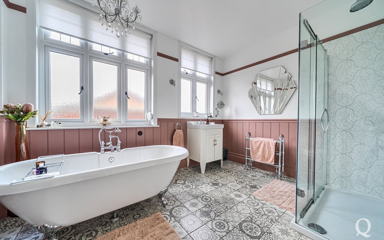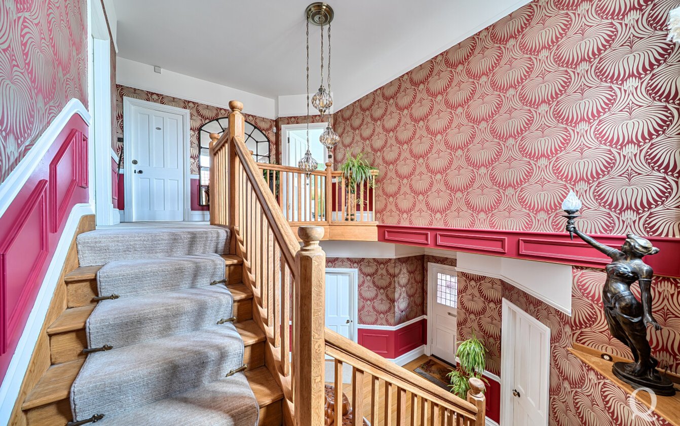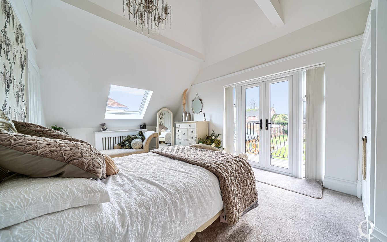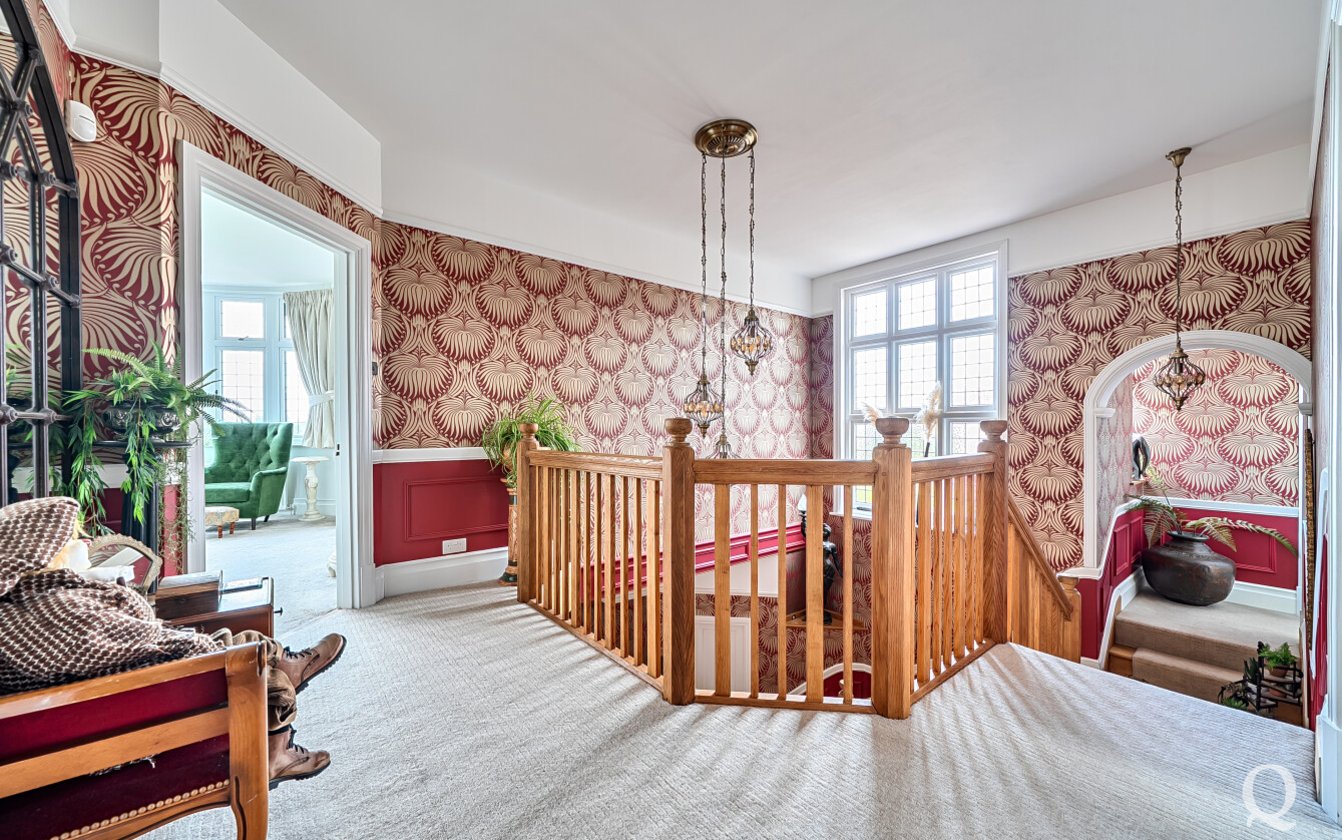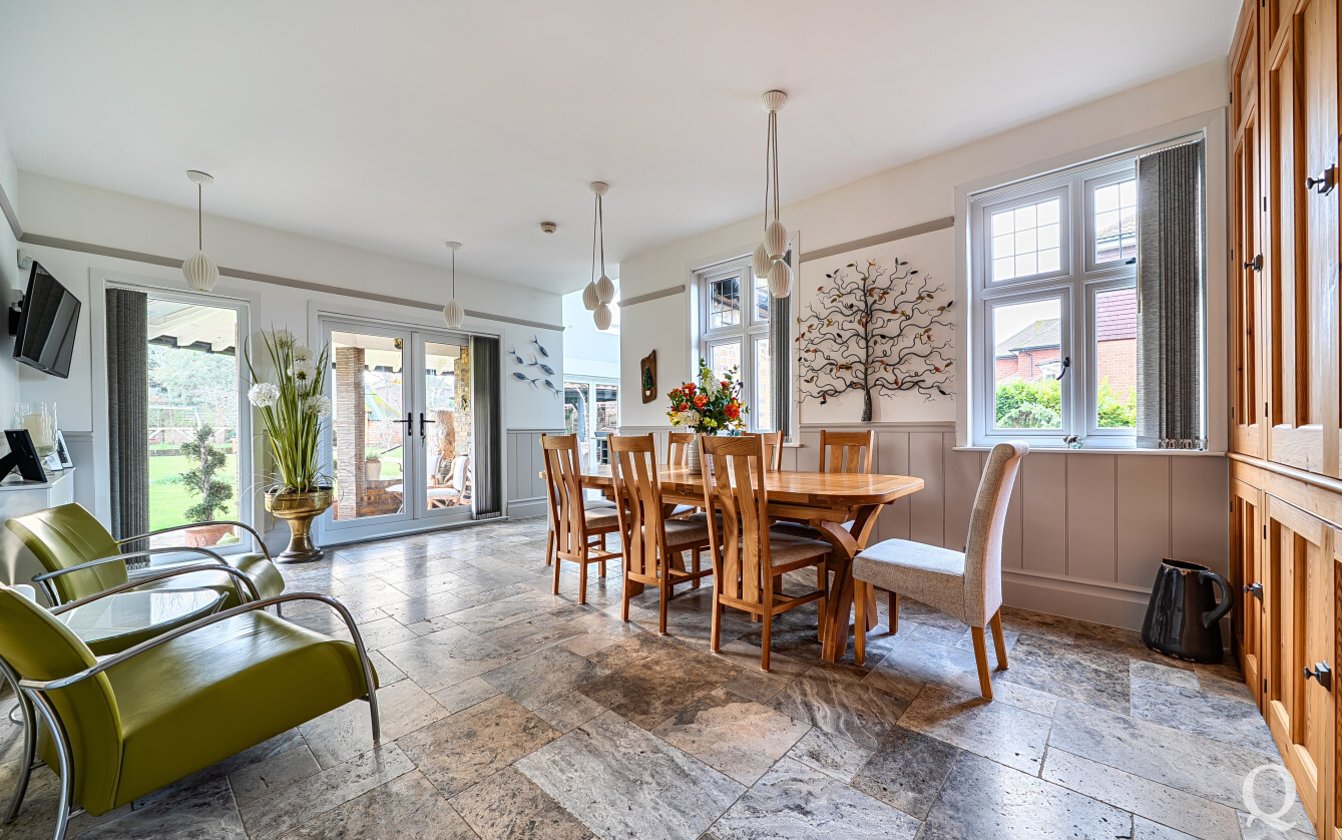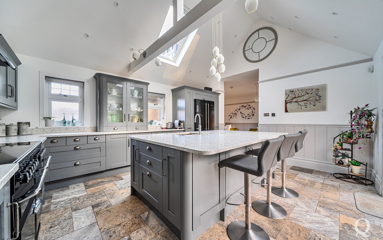 The property is approached through a large and impressive galleried entrance hall, setting the tone for the space and elegance found throughout. From here, a superb front reception room with a replacement wood burner enjoys a large bay window overlooking the frontage, while a separate dining room flows seamlessly into a fabulous modern kitchen, both of which benefit from electric underfloor heating. The kitchen also features solar powered Velux windows and bi-fold doors opening directly onto the rear garden – ideal for both family life and entertaining. A second reception room to the rear benefits from a replacement wood burner and French doors to the garden. A conveniently positioned downstairs WC completes the ground floor. To the first floor, the principal bedroom is located to the front of the house and features a large bay window, a stylish en-suite shower room and a dedicated dressing room. The second bedroom also benefits from its own en-suite shower room and a balcony, while two further generous double bedrooms are served by a spacious family bathroom, fitted with a freestanding bath and a separate shower cubicle. Externally, the property offers an impressive ‘in and out’ driveway providing parking for multiple vehicles, together with a double garage. To the rear is a large, south-facing landscaped garden, thoughtfully arranged and incorporating a range of useful and attractive outbuildings, including a Barbeque Hut Kota, a workshop, store, summer house with additional storage and an outside WC attached to the rear of the garage. This is a truly outstanding home, presented to a very high standard throughout and beautifully in keeping with the age and character of the property, in a highly sought-after location.