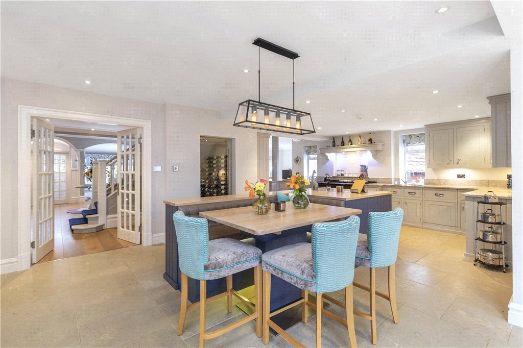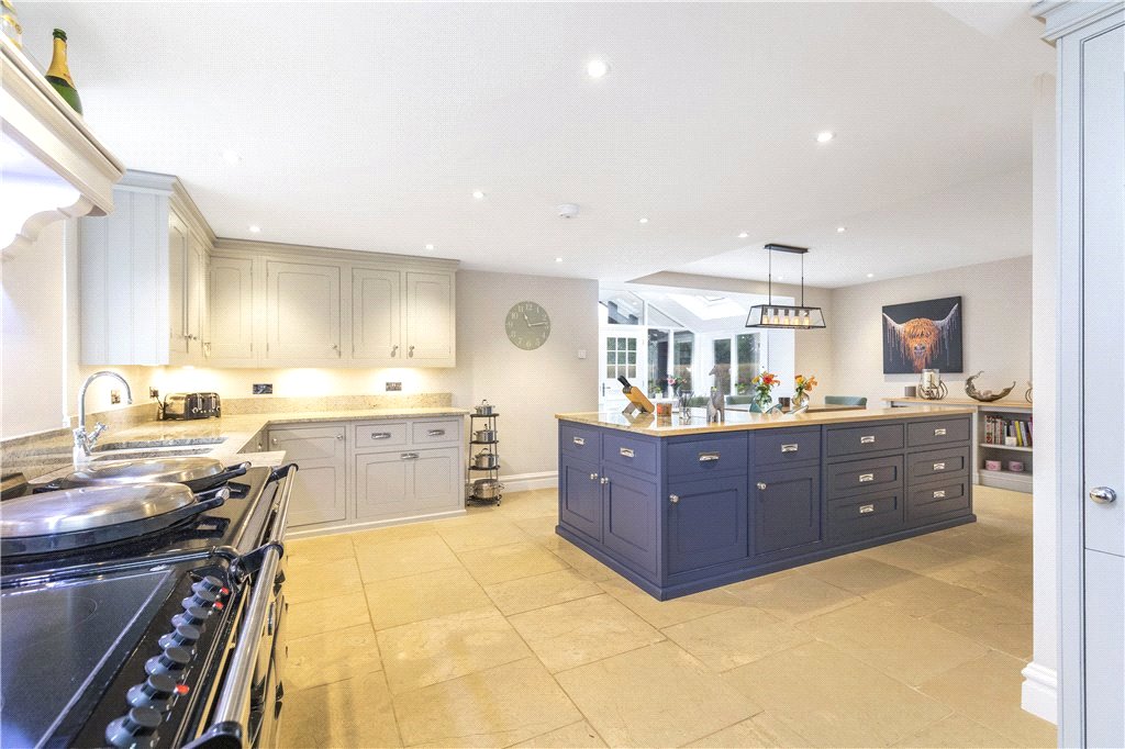 plan to the Sitting Room and thus creating a wonderful entertaining space - a broad square bay window overlooks the principal gardens; Breakfast Kitchen fitted with a comprehensive range of eye and base storage cupboards as well as integrated appliances including a four oven AGA. Generous central island, with integrated