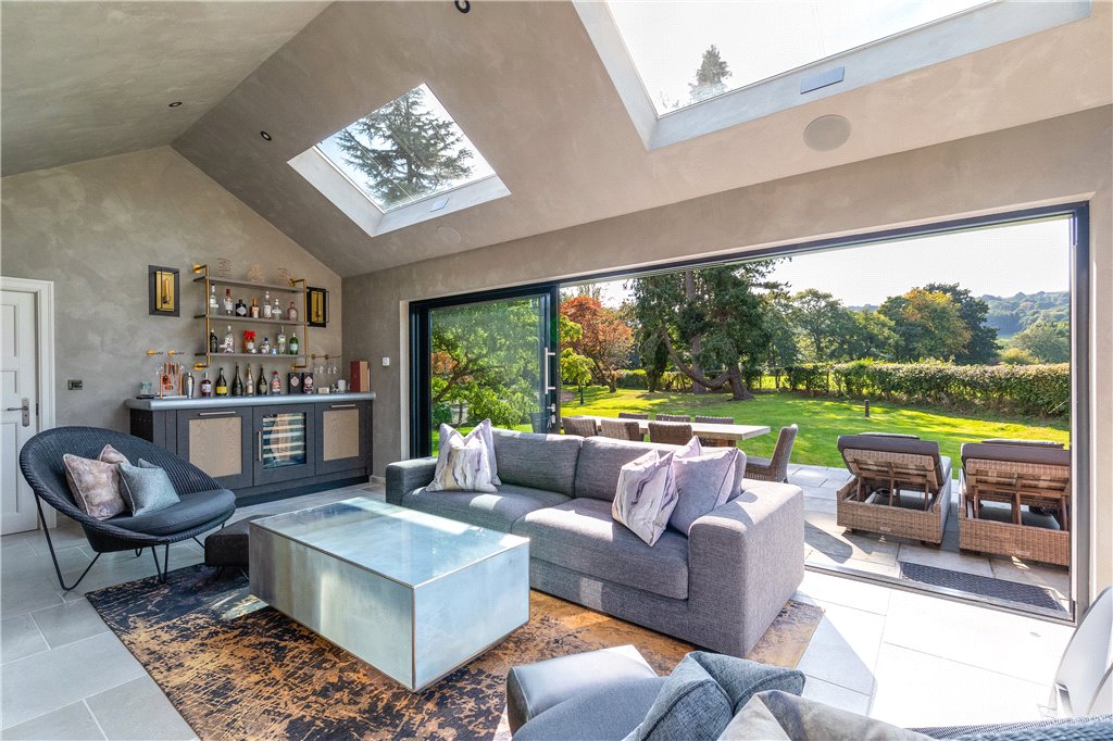 seating for the breakfast area; Family Room - a free flowing space easily accessed from the Kitchen; Garden Room - a relatively recent edition with large windows flooding this room with light and offering beautiful views onto adjoining countryside; WC and Coats Room. Lower Ground Floor: A more practical area of the house providing: - Playroom/Gym; A pair of stores;