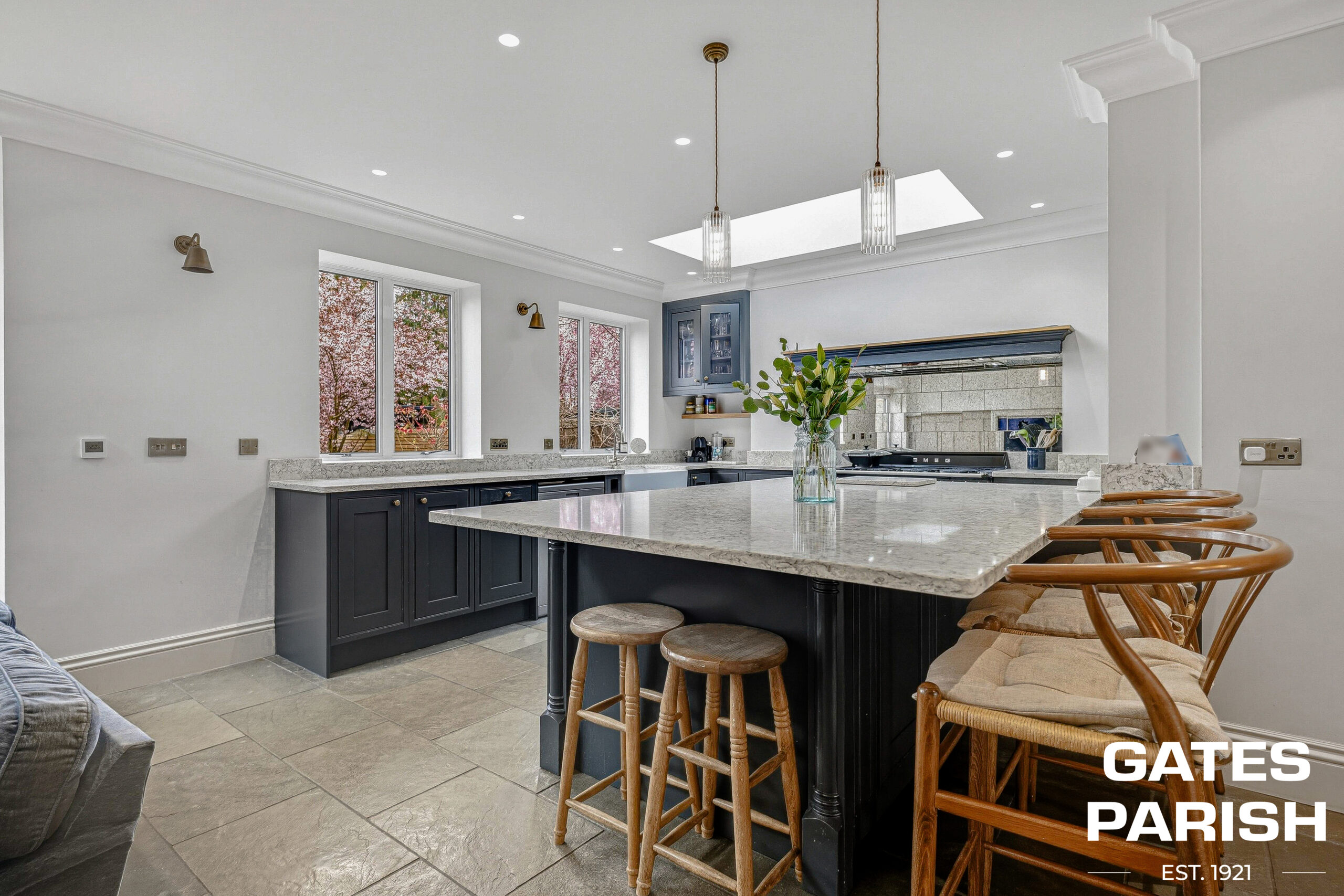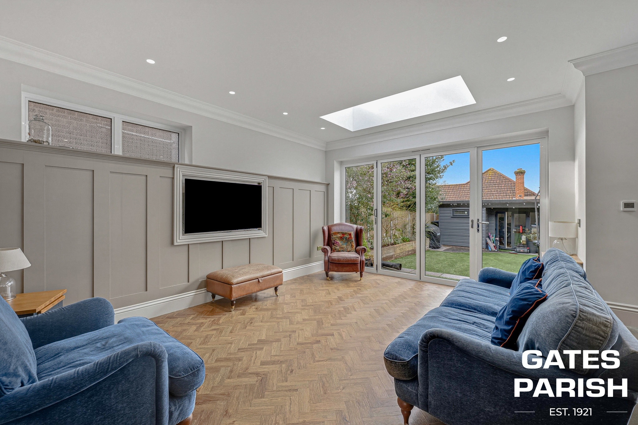 The stunning kitchen diner forms the true heart of the home, boasting a bespoke hardwood kitchen with quartz worktops, range oven, American-style fridge freezer, built-in microwave, hot water tap, and traditional butler sink. A large central island provides additional storage and seating. Bifold aluminium doors and two skylights allow natural light to flood the space, while limestone flooring in the kitchen and Amtico flooring in the seating area add to the sense of quality. The room also benefits from a built-in TV system, spotlights, and feature pendant lighting over the island.