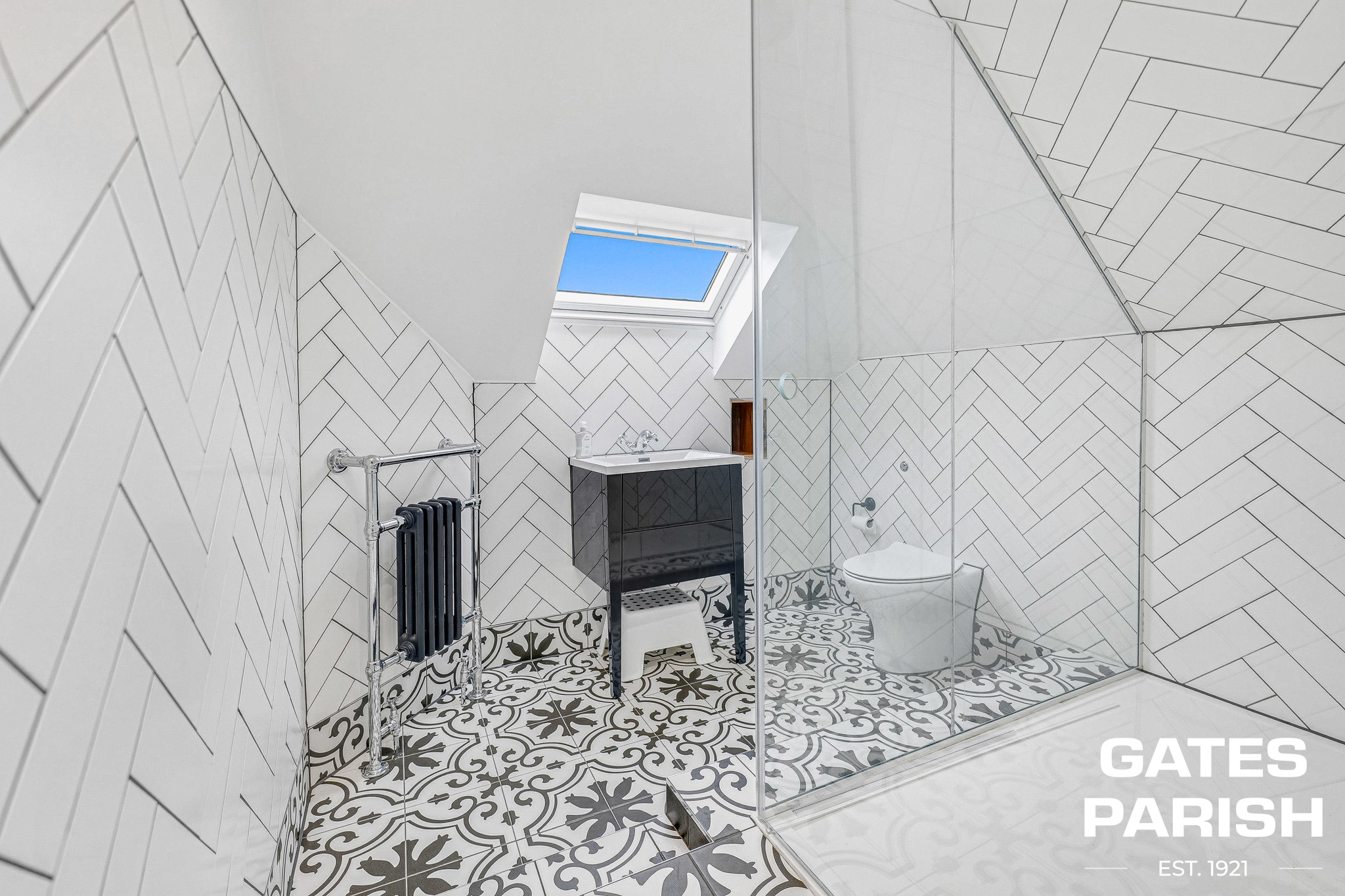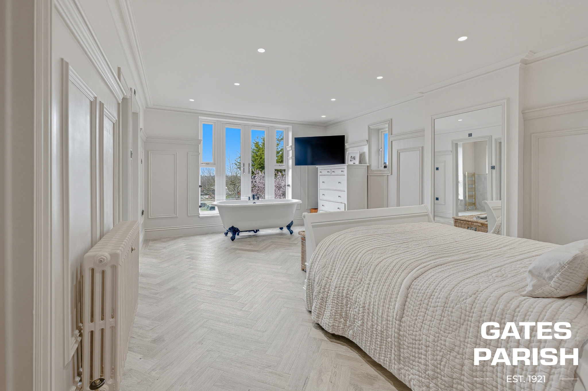 The first floor offers three generous bedrooms, each fitted with column radiators and concealed wiring for integrated TV points. The impressive master suite features French doors, a luxurious roll-top bath within the bedroom, a walk-in wardrobe, and a beautifully appointed en-suite bathroom finished with high specification fittings and Amtico flooring. The second bedroom enjoys double aspect front windows, built-in wardrobes, and an en-suite shower room, while the third bedroom benefits from a walk-in wardrobe leading to its own en-suite shower room. A stylish home office with built-in storage and oak flooring completes this level.